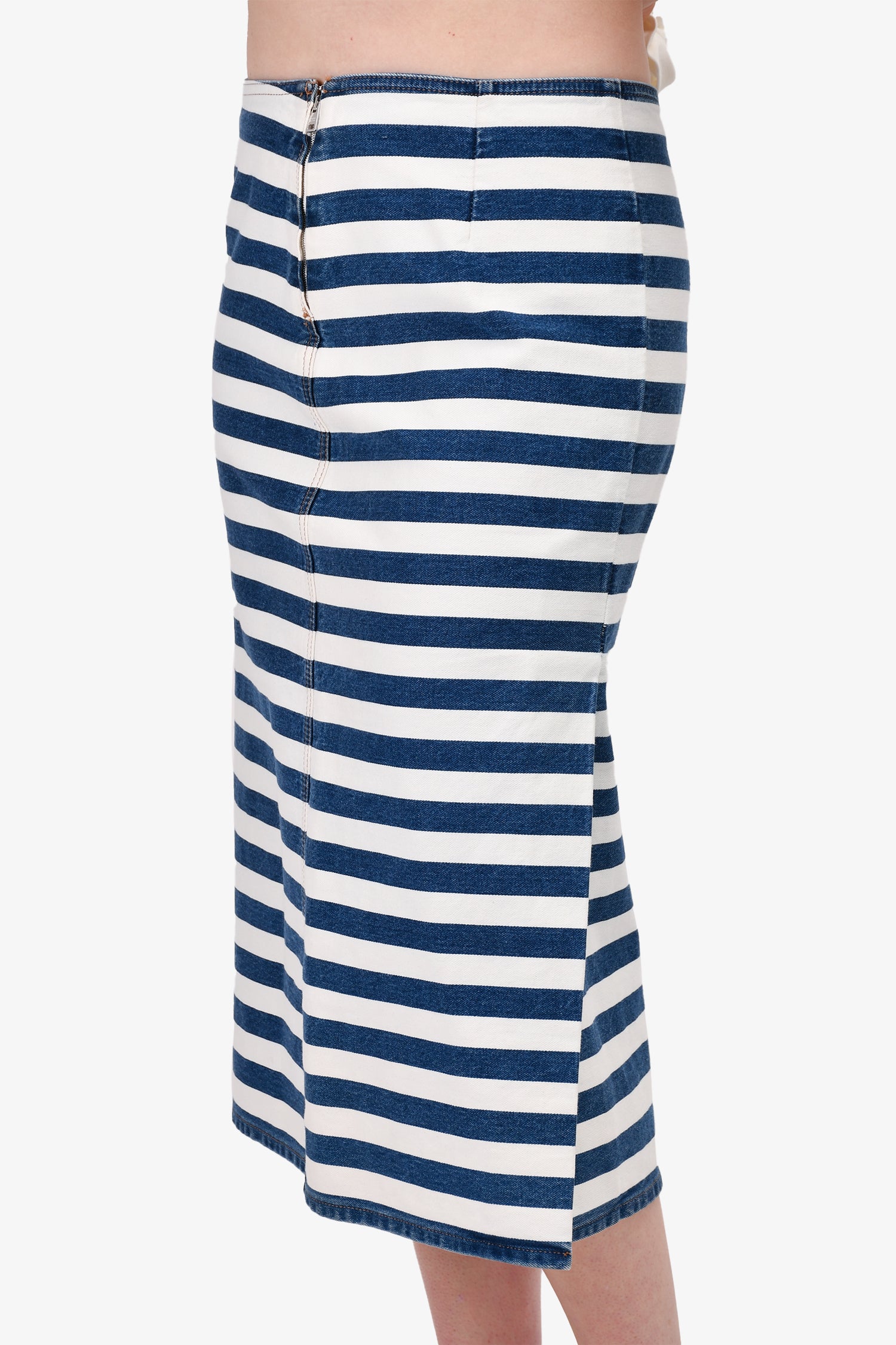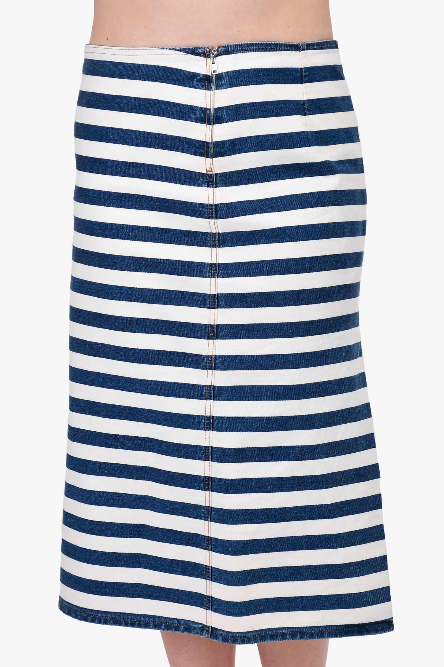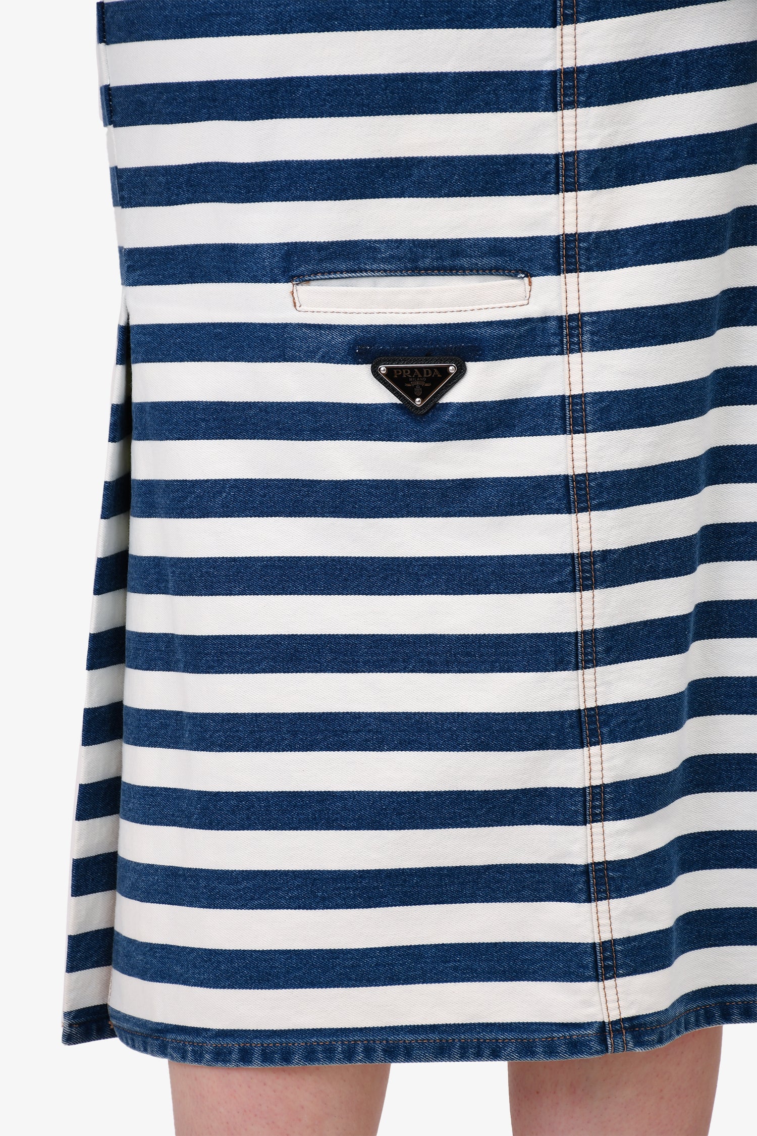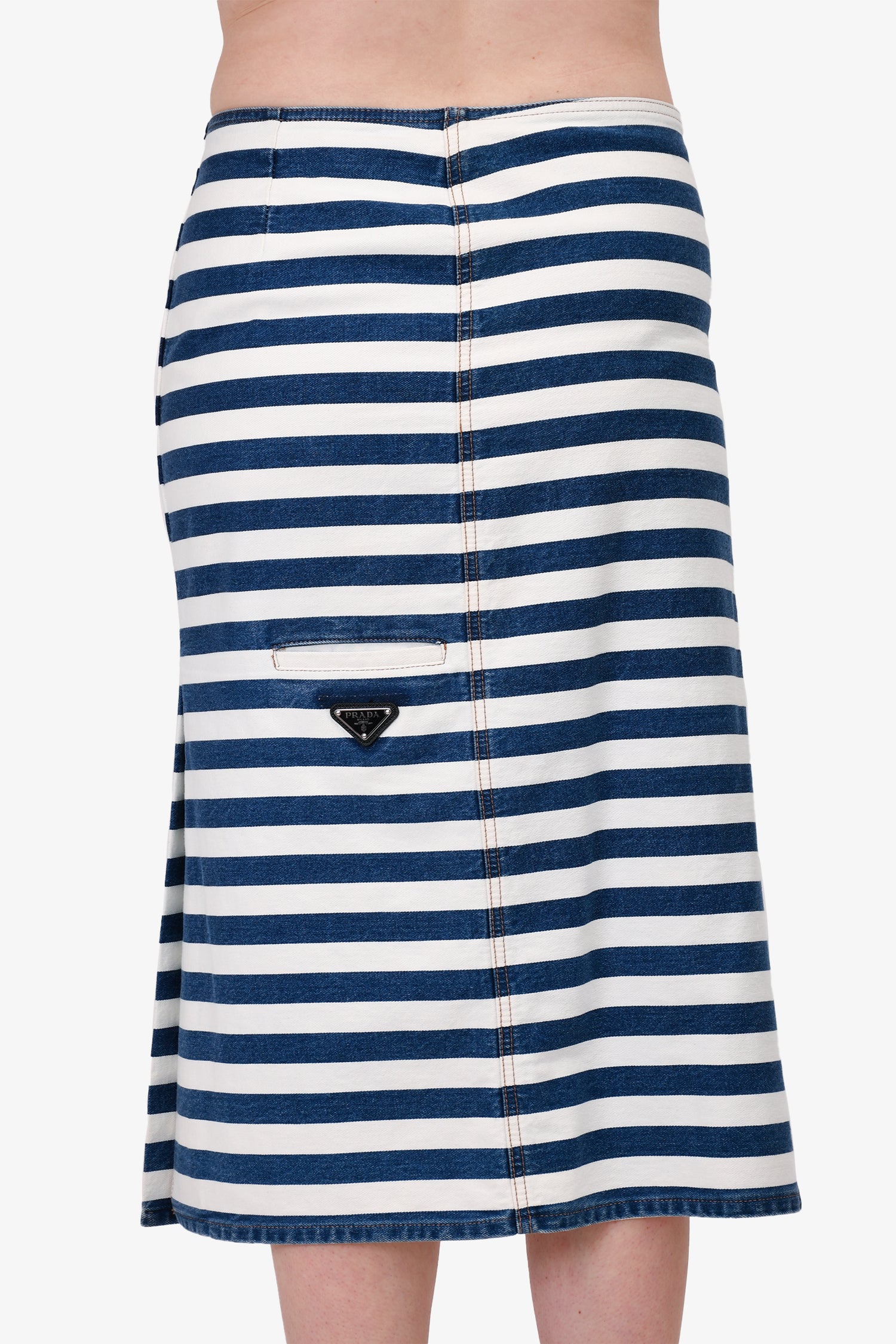 Refresh availabilityPrada Blue and White Denim Striped Midi Skirt. Pocket detailing at the back with logo in silver-tone hardware. Hidden front zipper closure. Tonal stitching.
