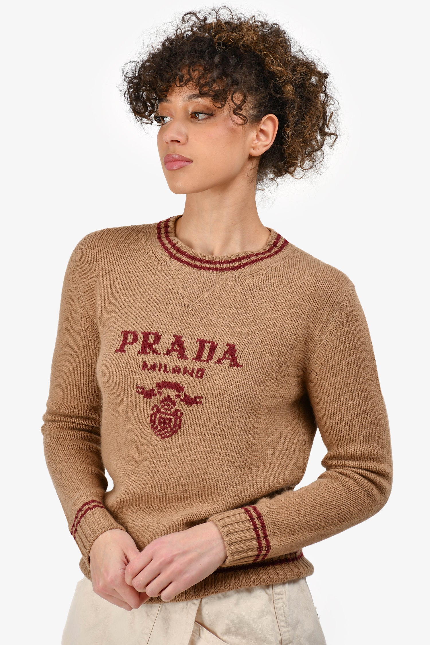 Refresh availabilityPrada Brown/Burgundy Logo Wool/Cashmere Knit Sweater. Pull-over. Round neck. Ribbed neckline, cuffs and hem. Tonal stitching.