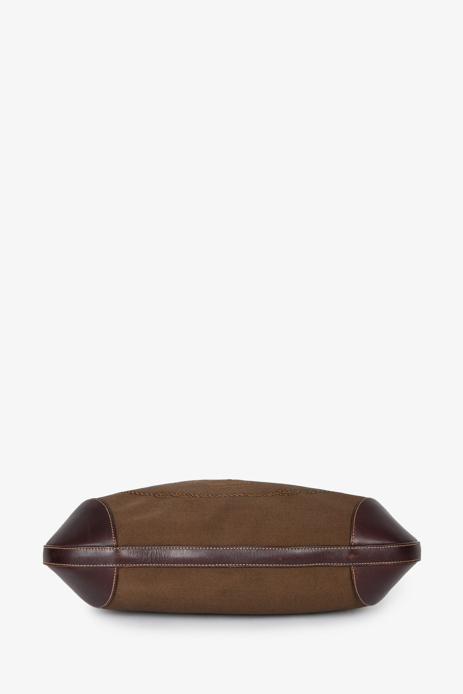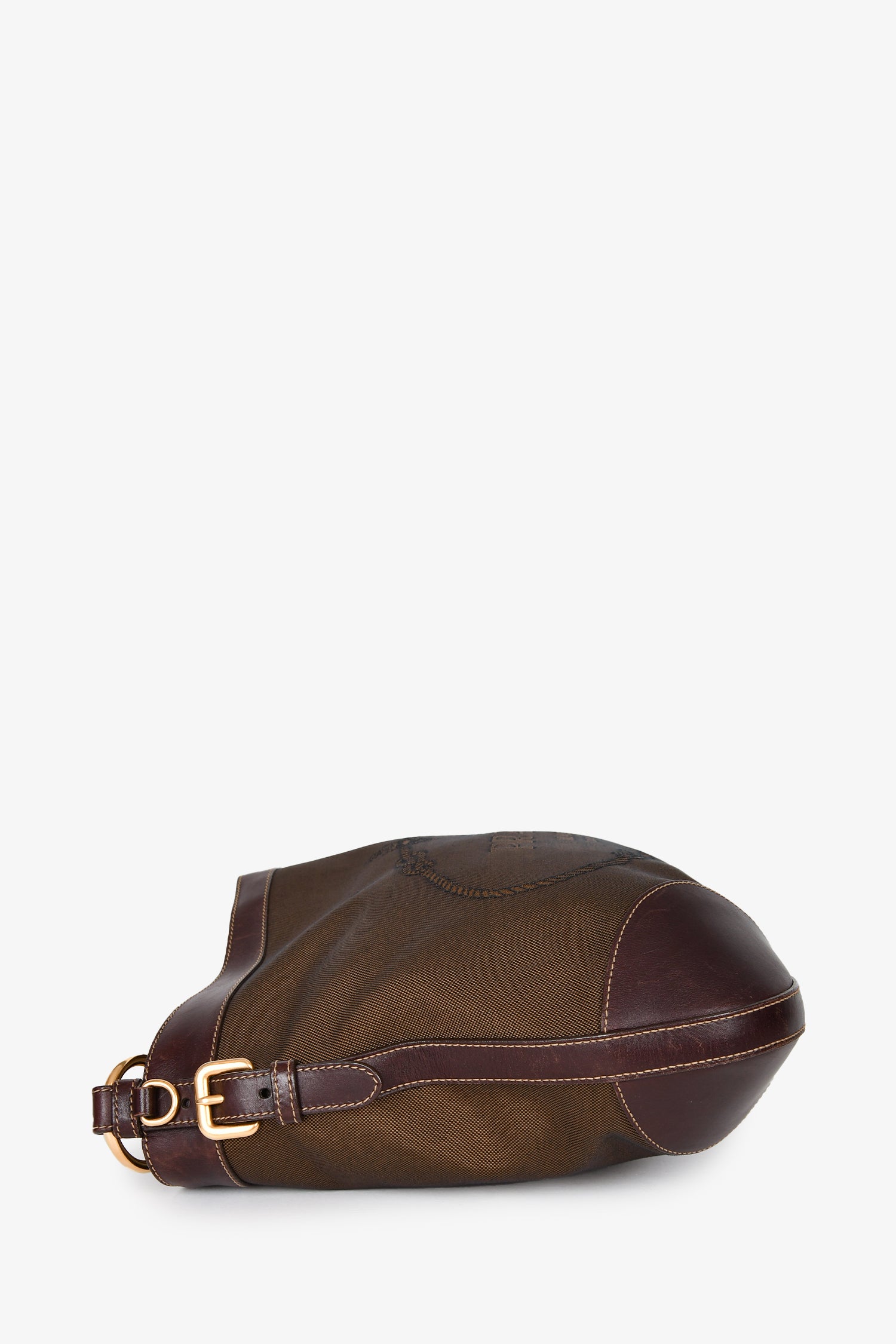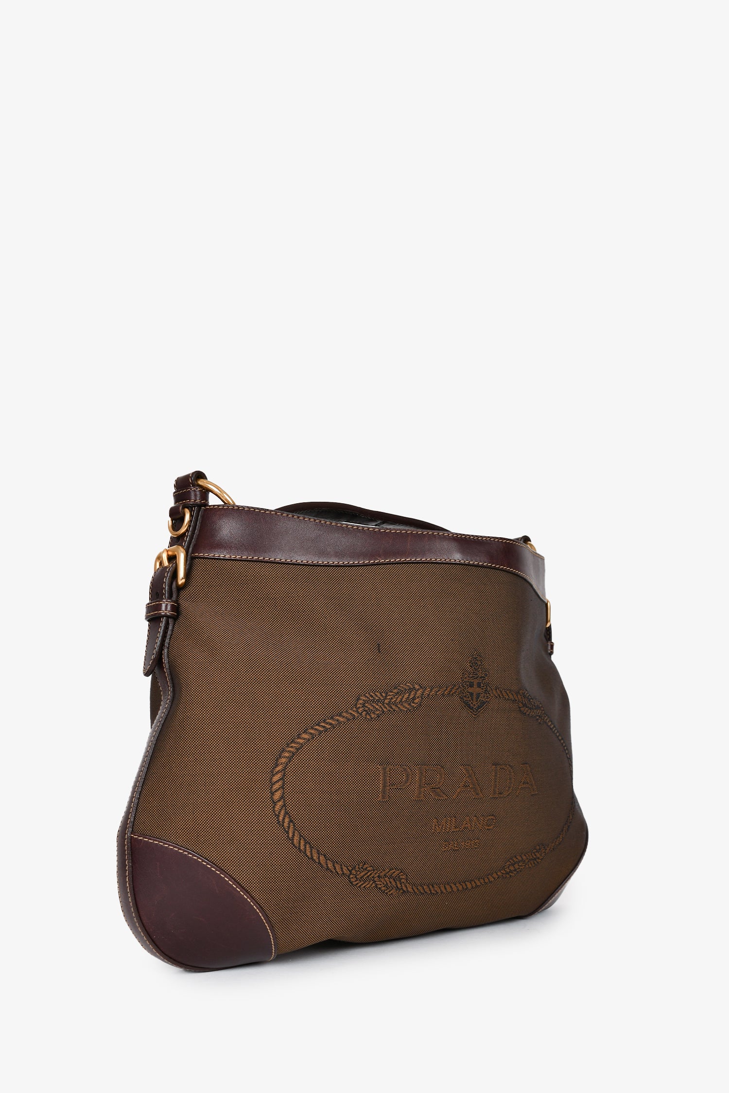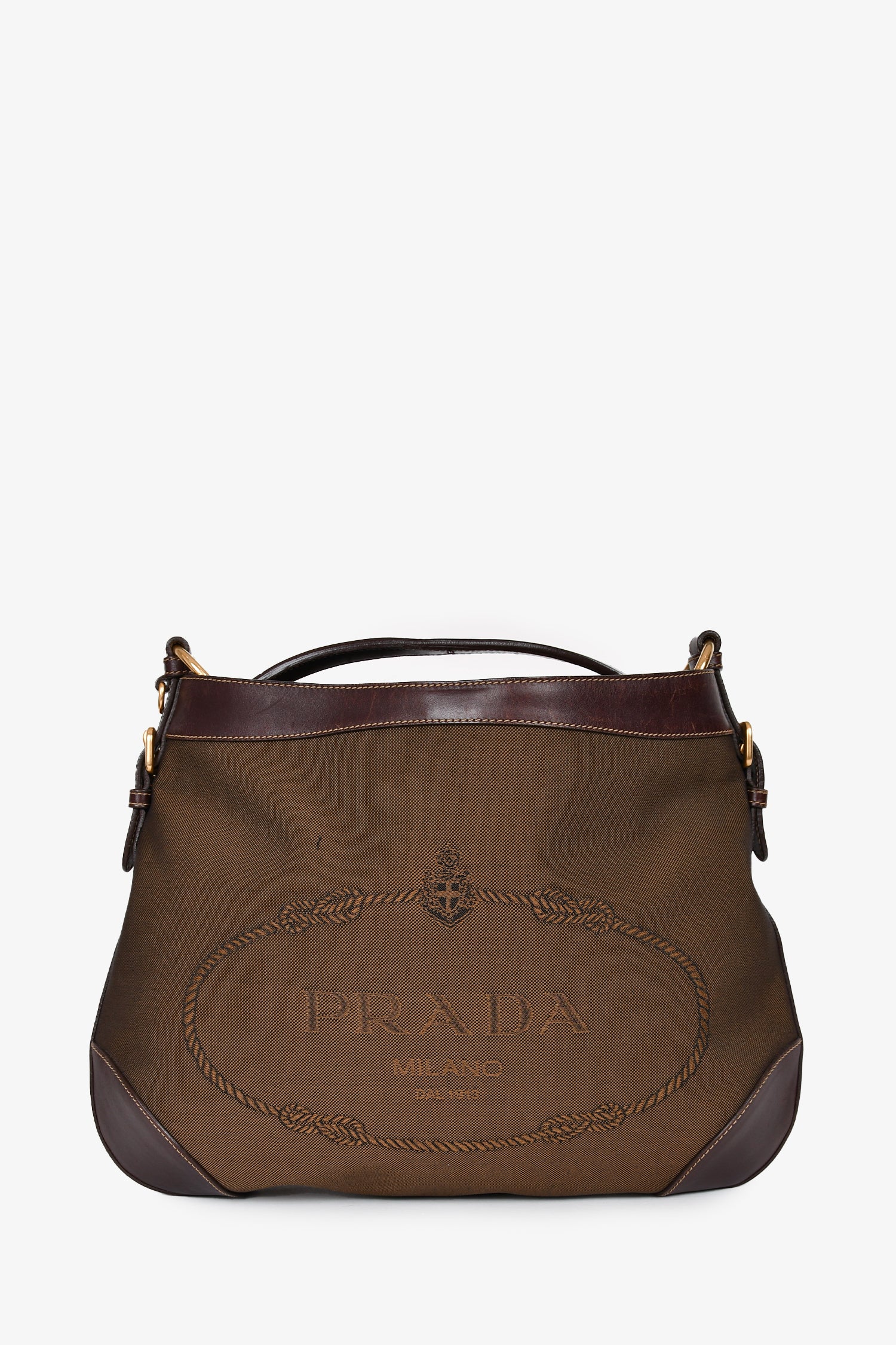 Refresh availabilityPrada Brown Canvas/Leather Trim Canapa Logo Hobo Bag. Interior magnetic button closure. Brown logo'd textile interior lining. Single interior wall zip pocket. Gold-tone hardware. Tonal stitching.