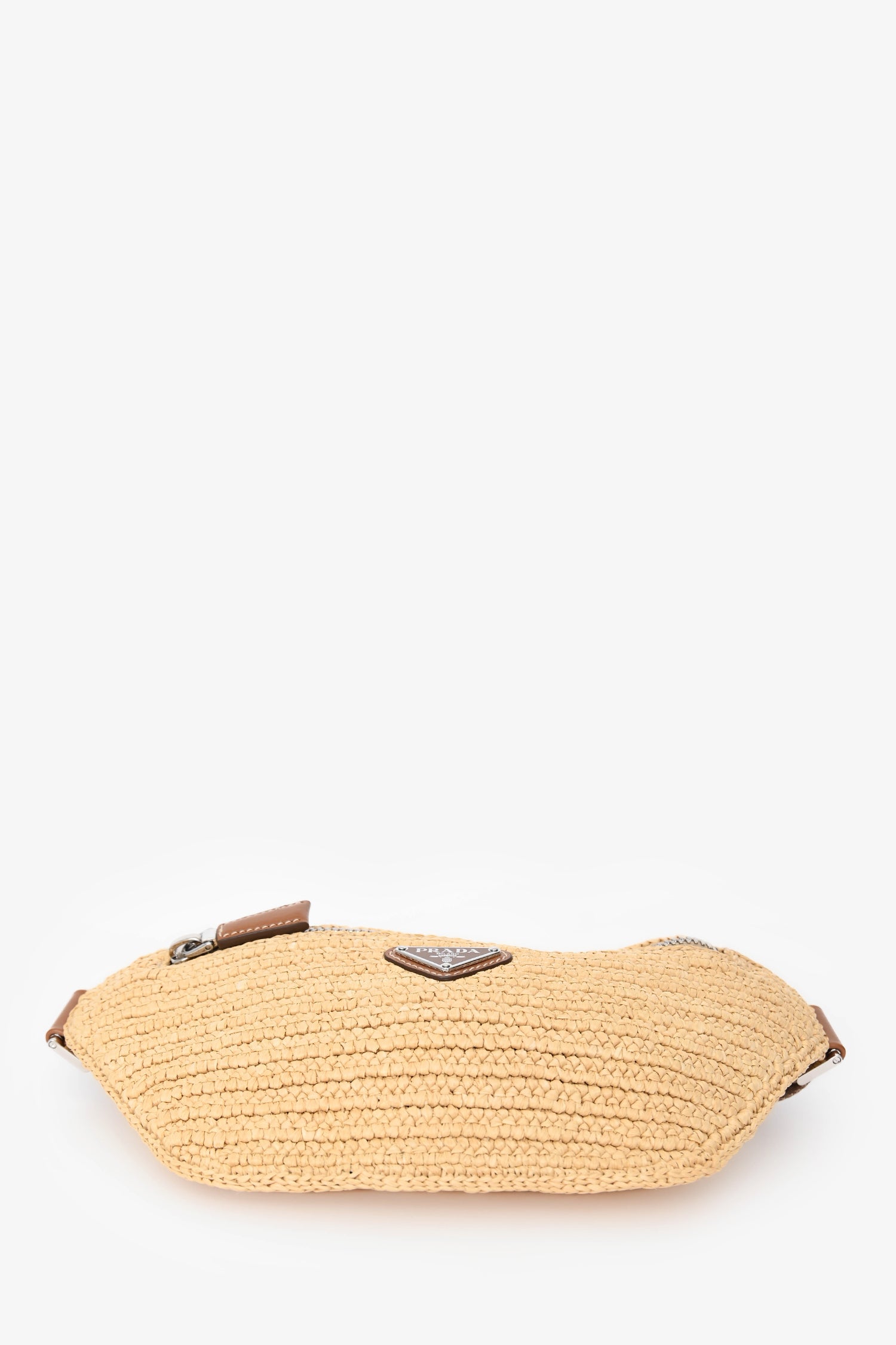 Refresh availabilityPrada Brown Raffia Logo Belt Bag. Front zip closure. Adjustable strap. Single interior compartment. Silver-tone hardware. Tonal and contrast stitching.