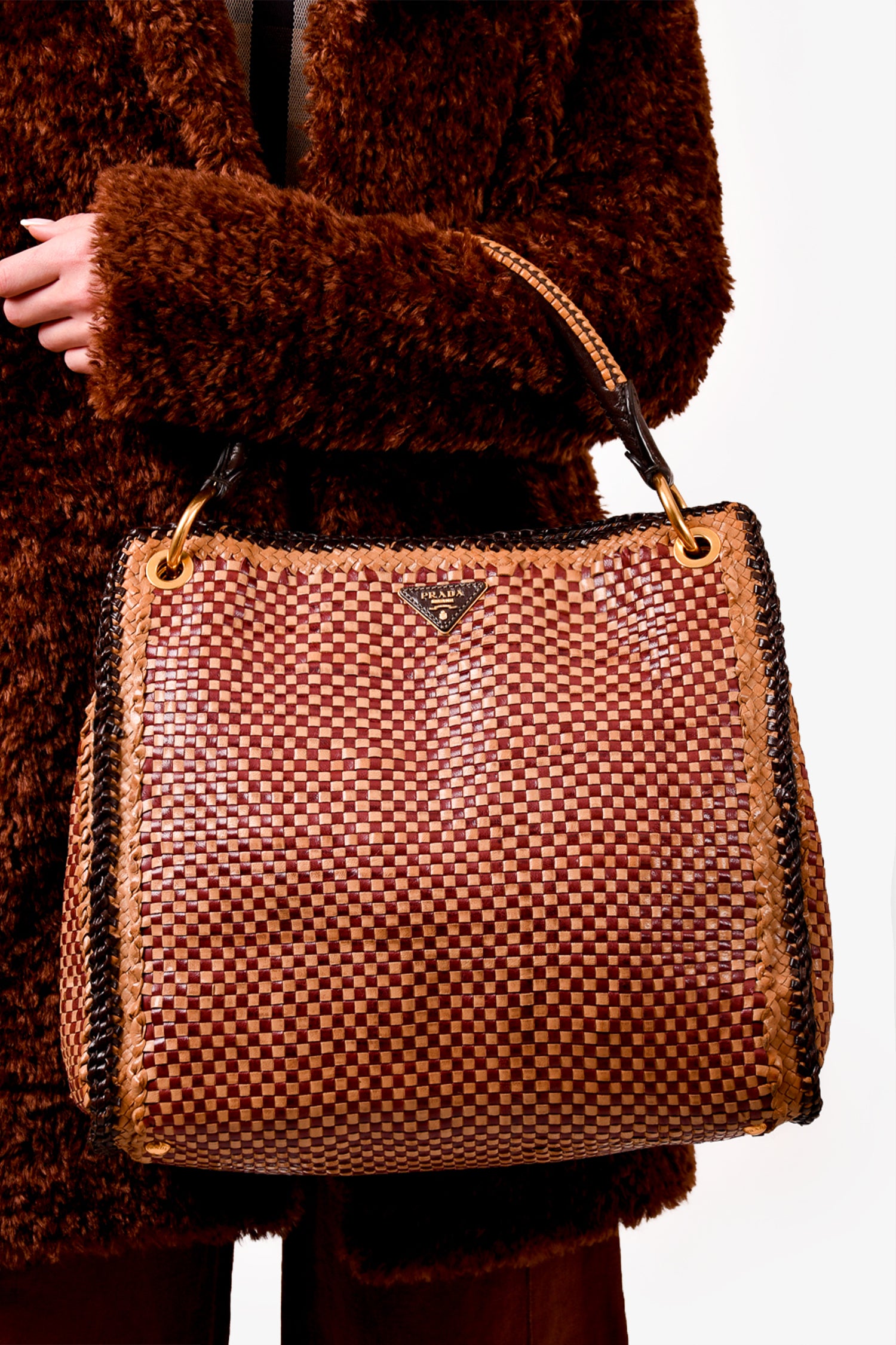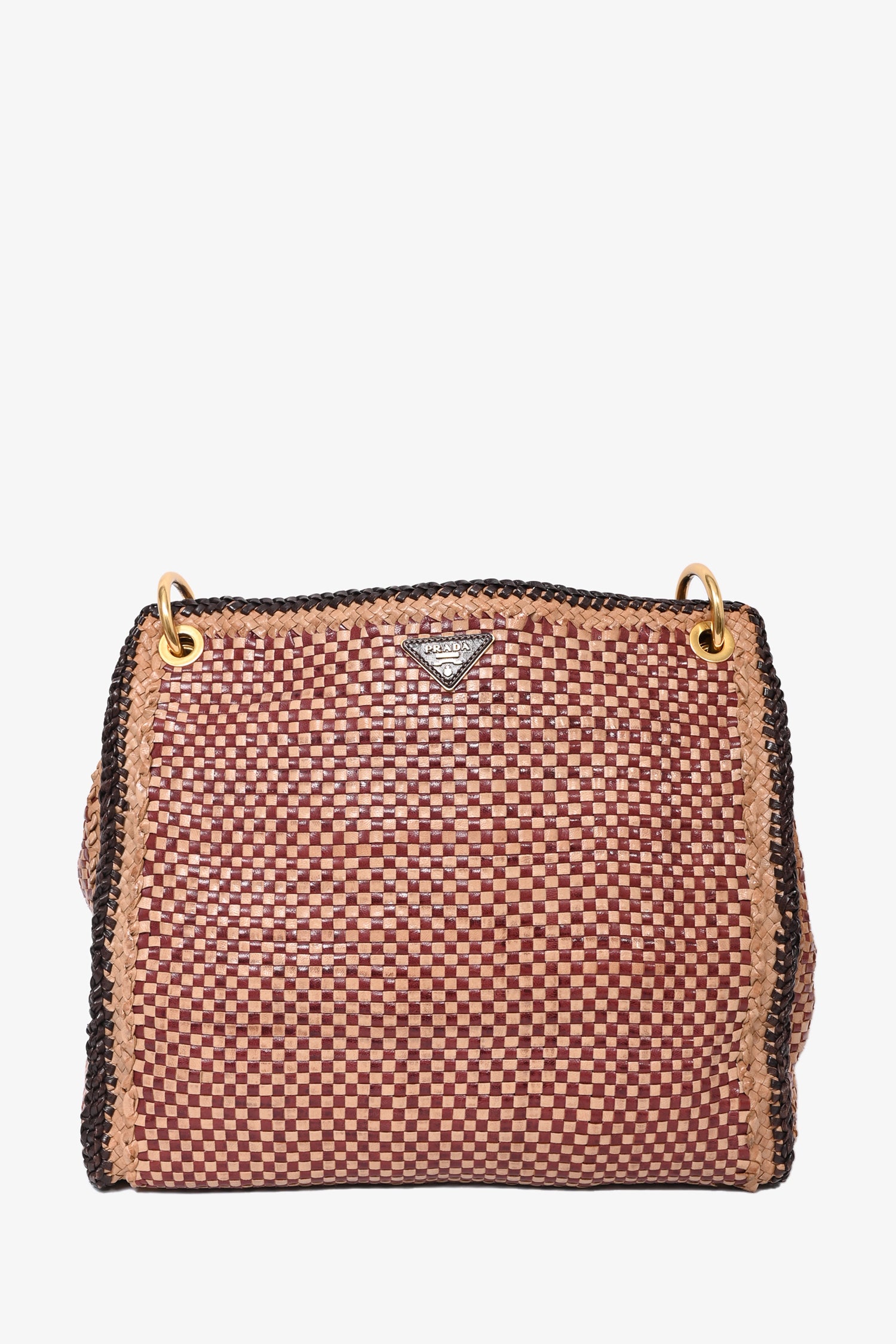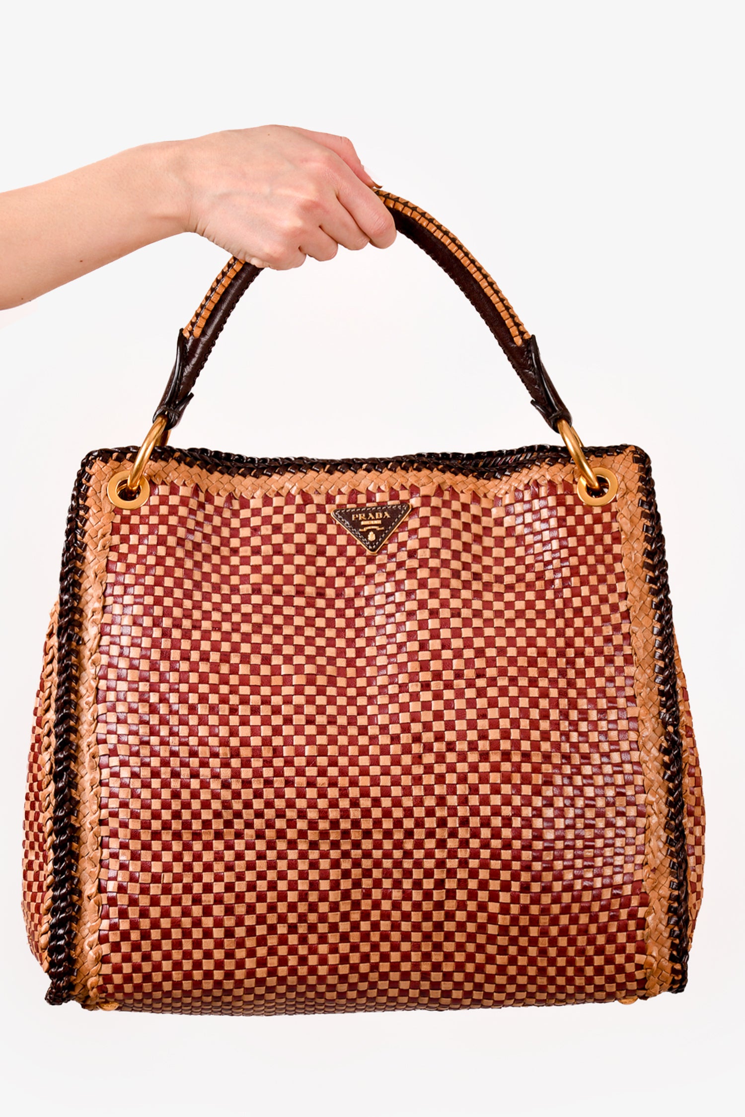 Refresh availabilityPrada Brown Woven Madras Hobo Bag. Lined. Gold-tone hardware. 3 interior slip pockets. 1 interior zip pocket. Button closure. Tonal and contrast stitching.