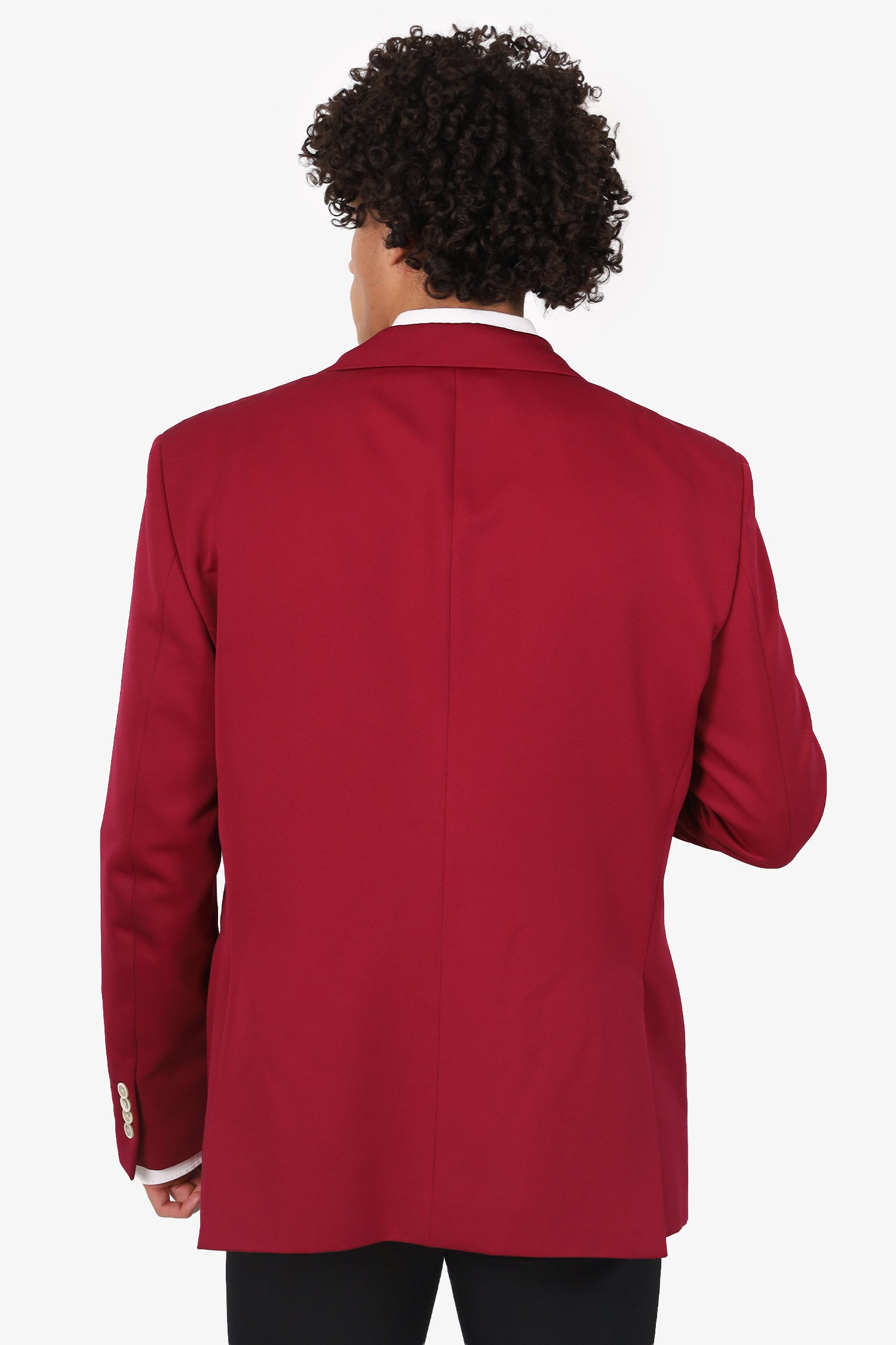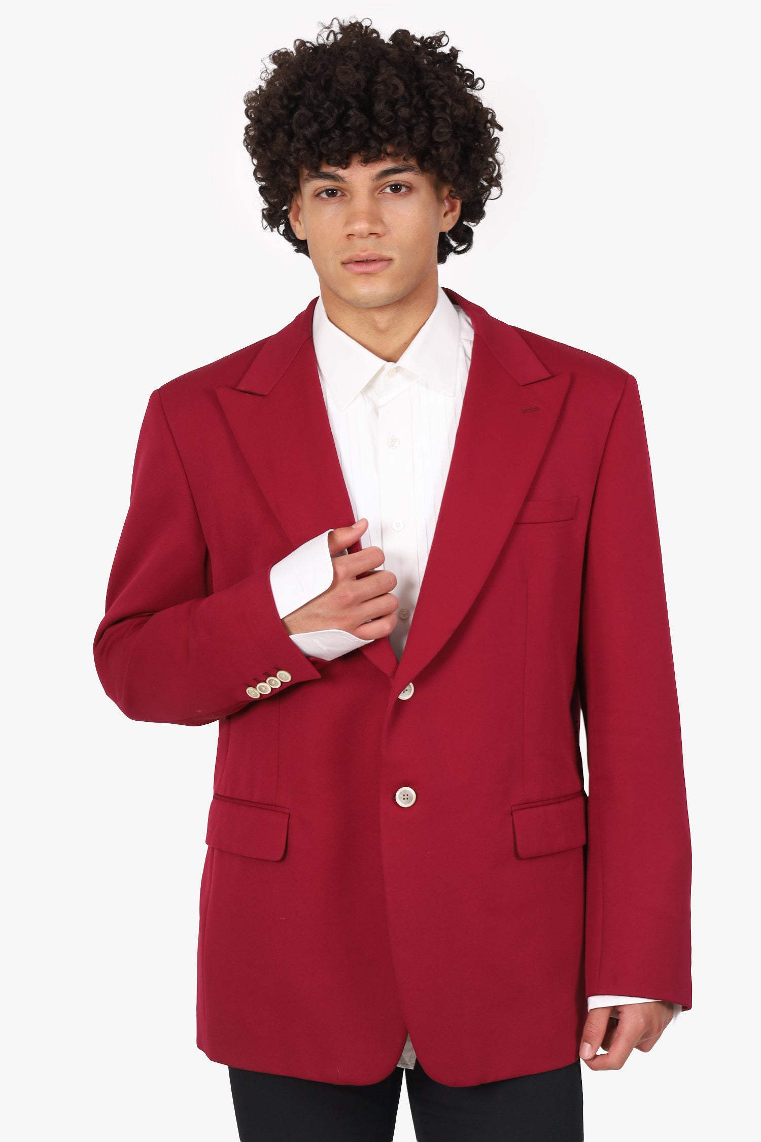 Refresh availabilityPrada Burgundy Blazer. Pull-on. Peak lapel. Front button-up closure. 3 front exterior pockets; 2 flap and 1 chest slip. Sleeve cuffs with button-up closure. Double rear vent. Padded shoulders. Lined interior. Tonal stitching.