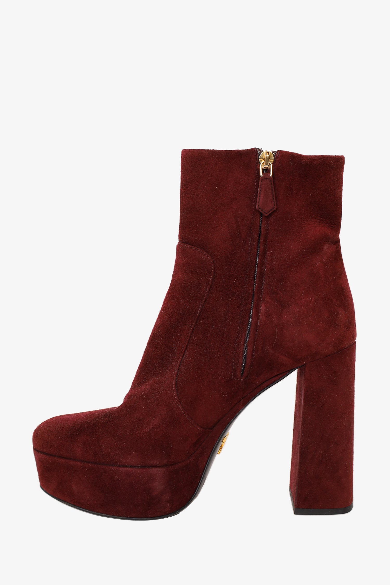 Prada Burgundy Suede Platform Heeled Boots. Round toe. Side zipper closure. Block heel. Tonal stitching.