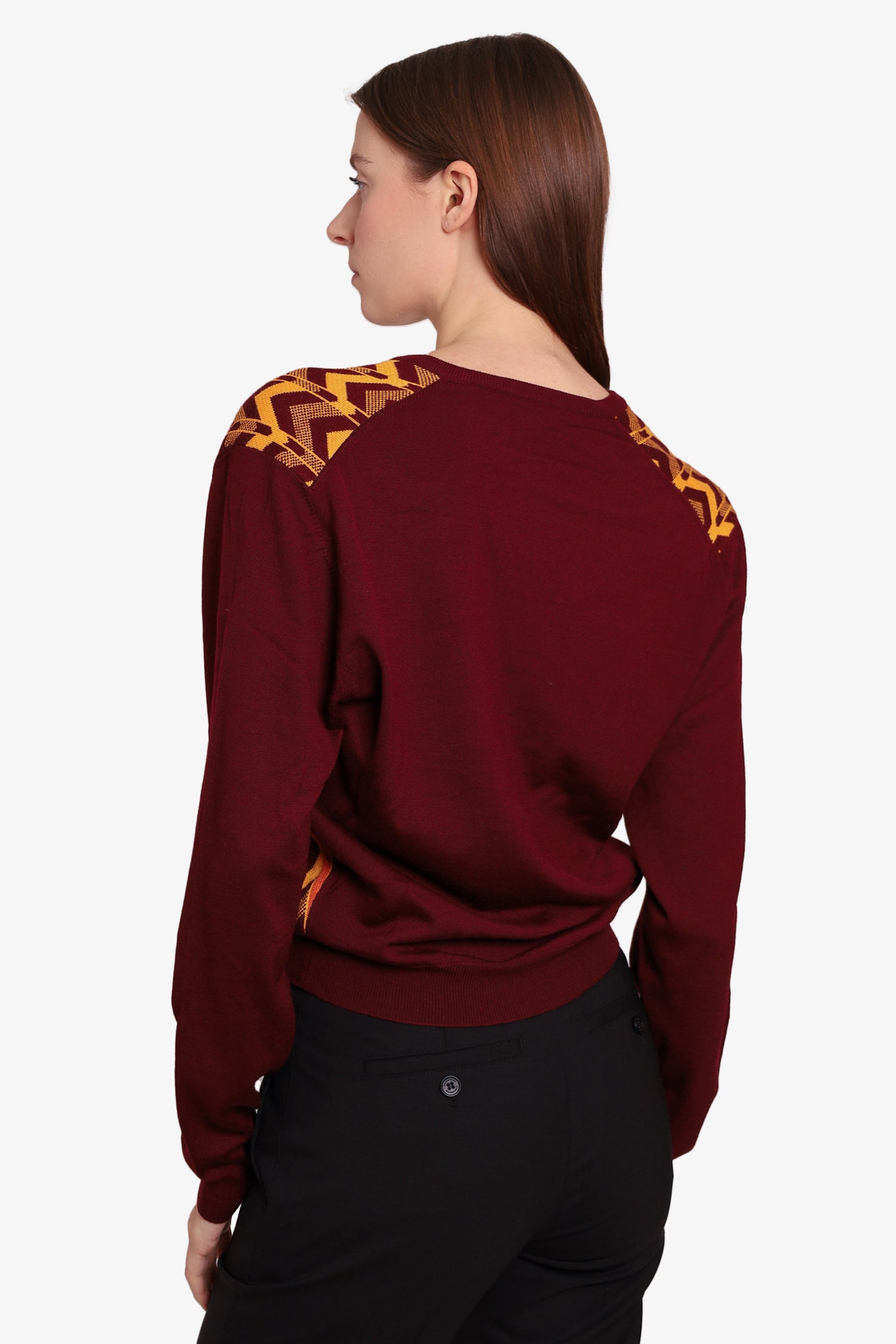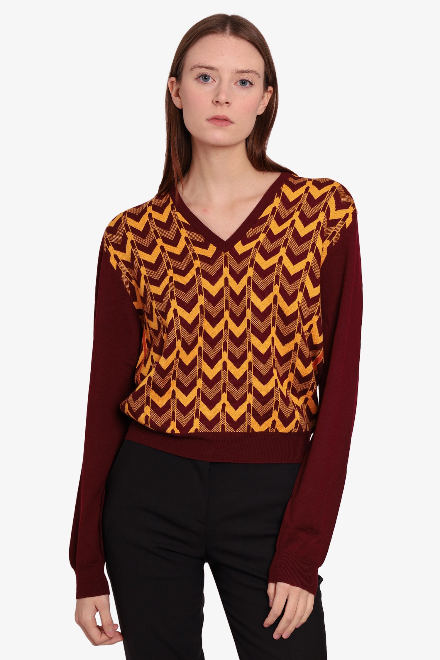 Refresh availabilityPrada Burgundy/Yellow Wool Chevron Sweater. V-Neckline. Ribbed sleeves & hem. Tonal stitching.