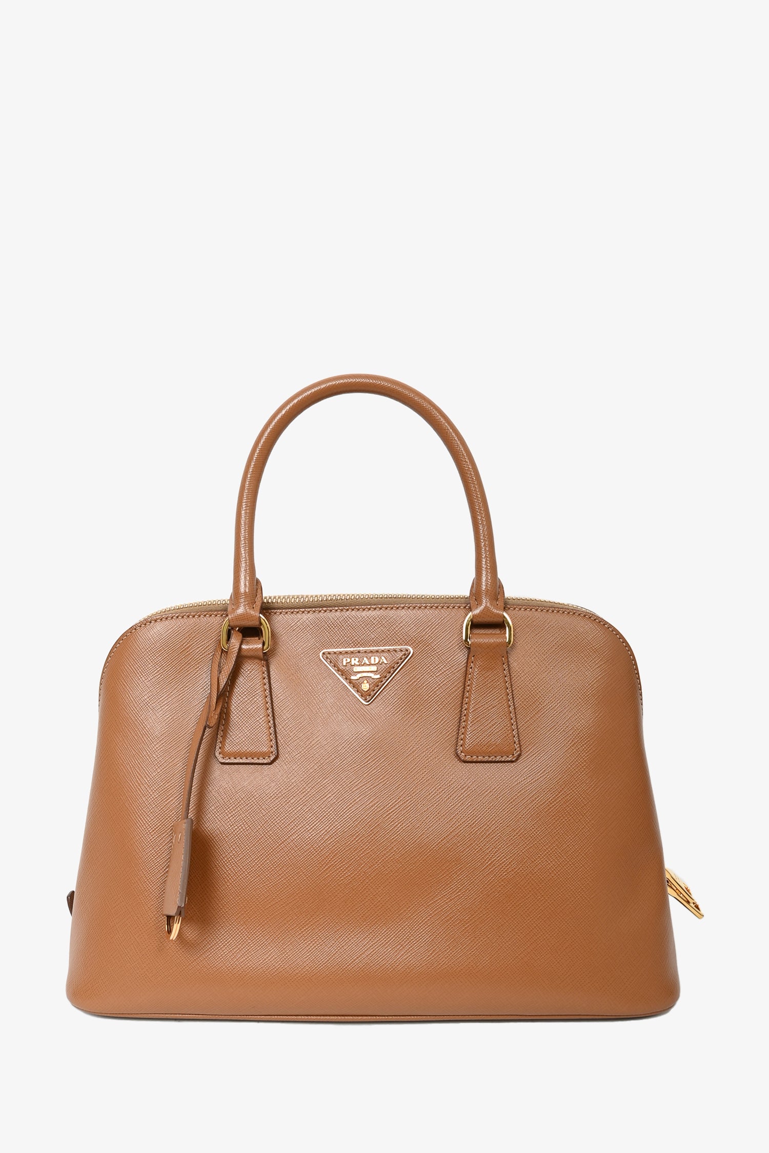 Refresh availabilityPrada Caramel Saffiano Leather Promenade Top Handle. Gold-tone hardware. Twin top handles. 3 interior slip pockets. 1 removable and adjustable shoulder strap. 2 interior compartments. 2 zip pockets. Lined. Tonal stitching.