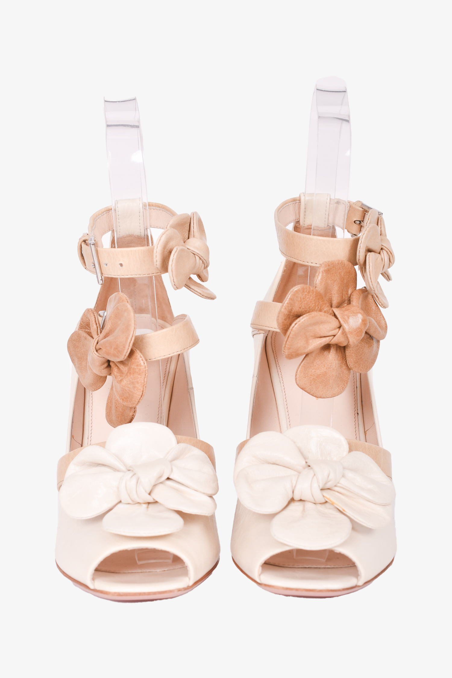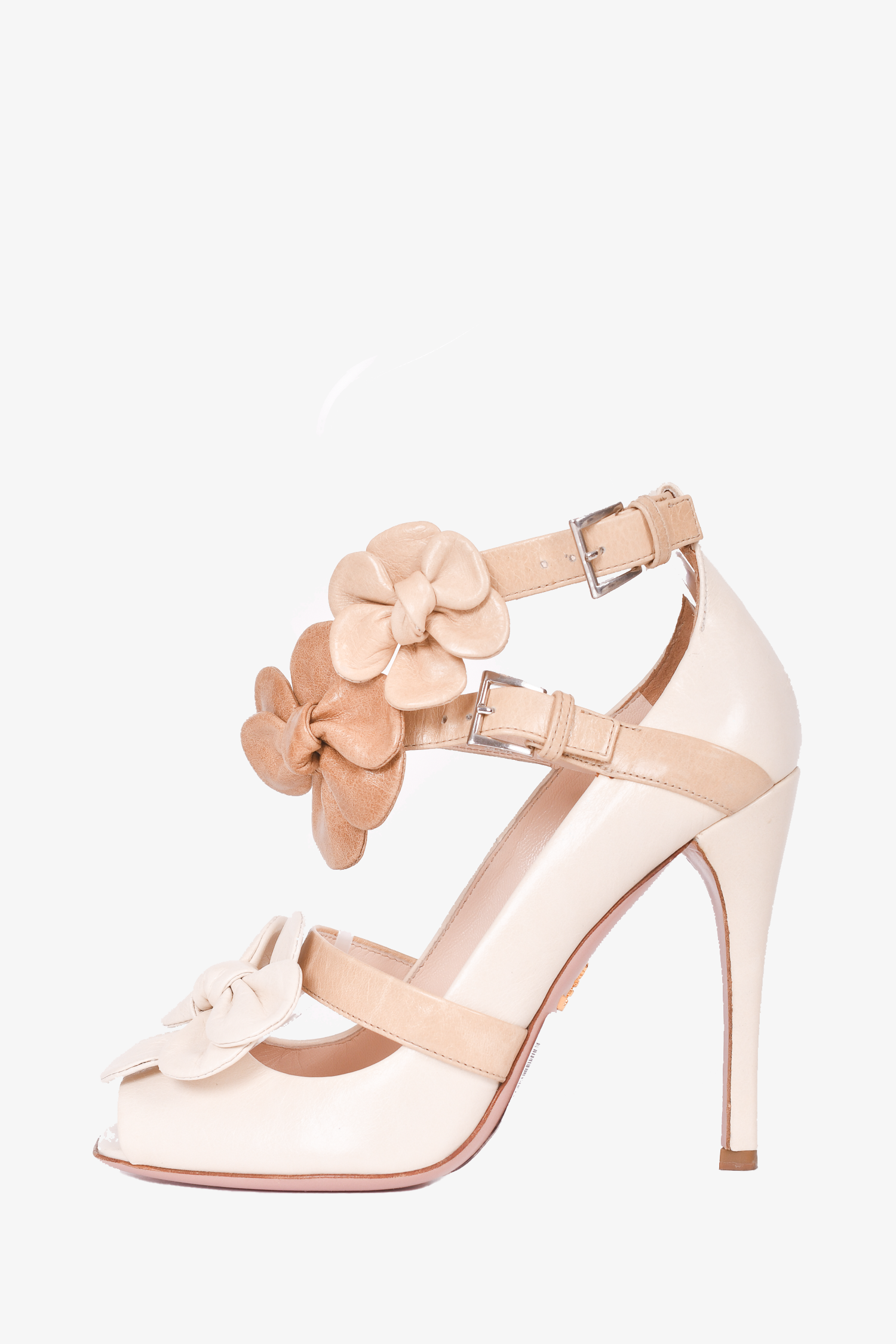 Refresh availabilityPrada Cream/Beige Leather Floral Strappy Heels. Tapered square peep toe. Ankle straps with buckle closures.