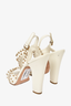 Refresh availabilityPrada Cream Leather Gold Studded Heeled Sandals. Round toe. Ankle strap with buckle closure. Tonal stitching.