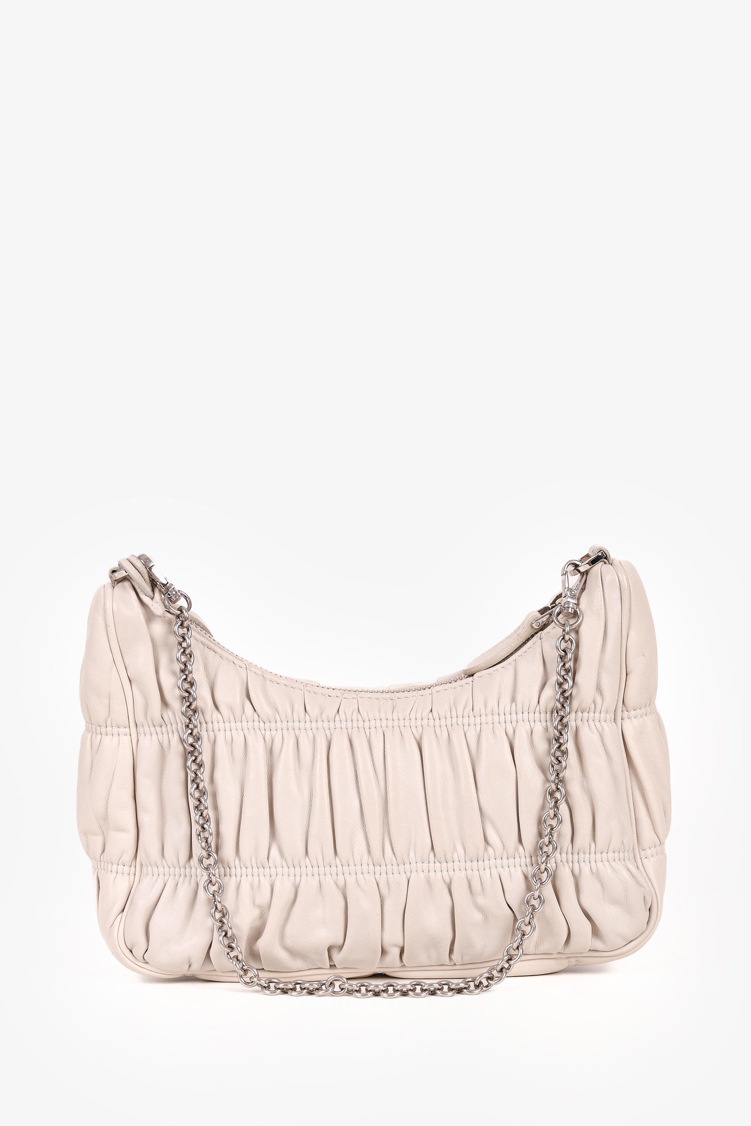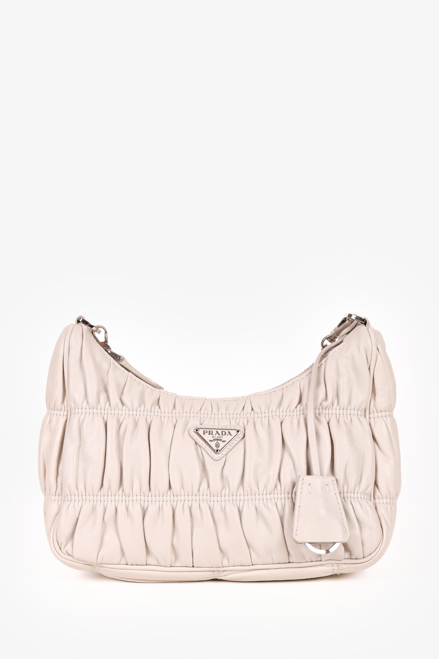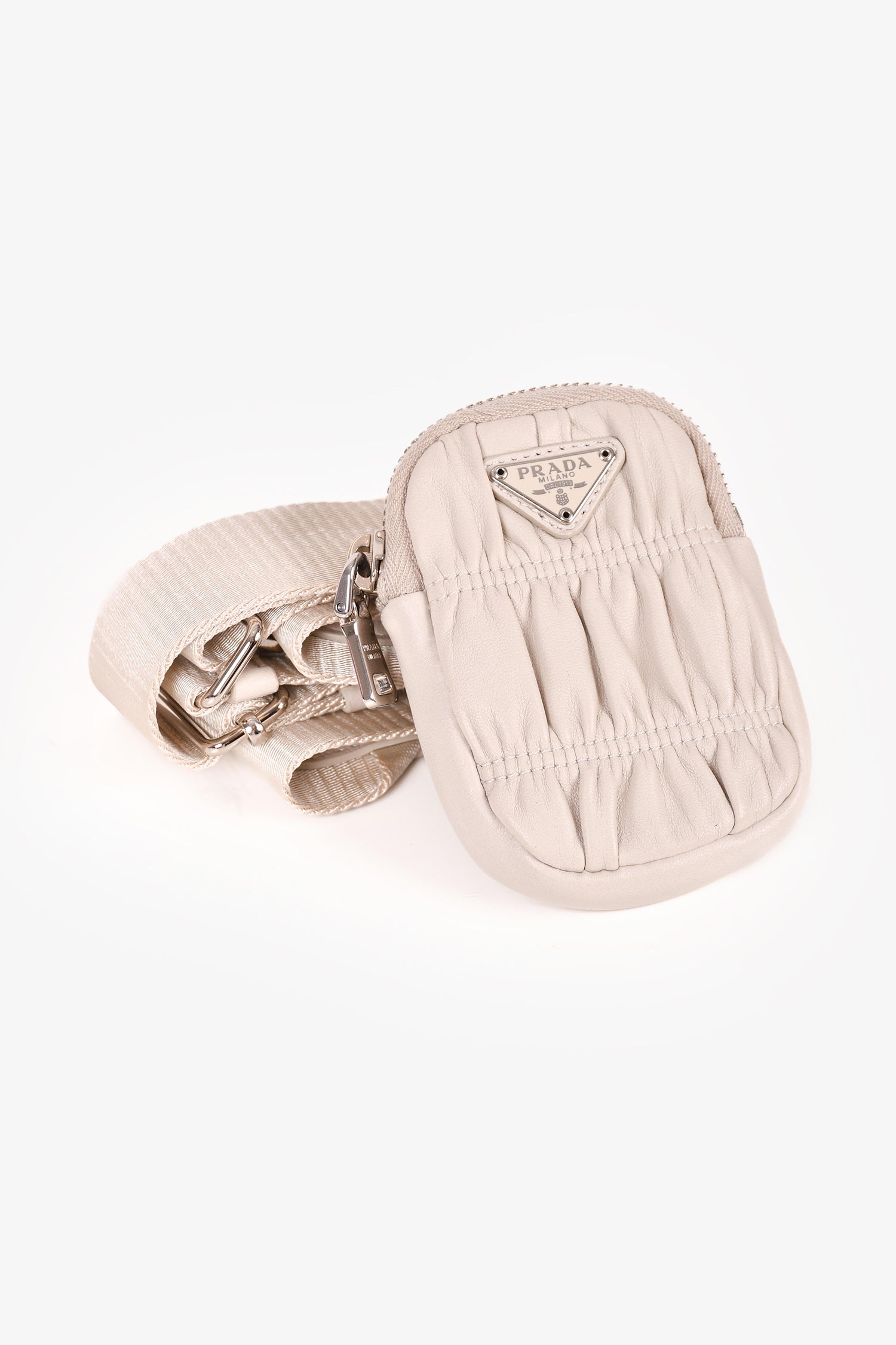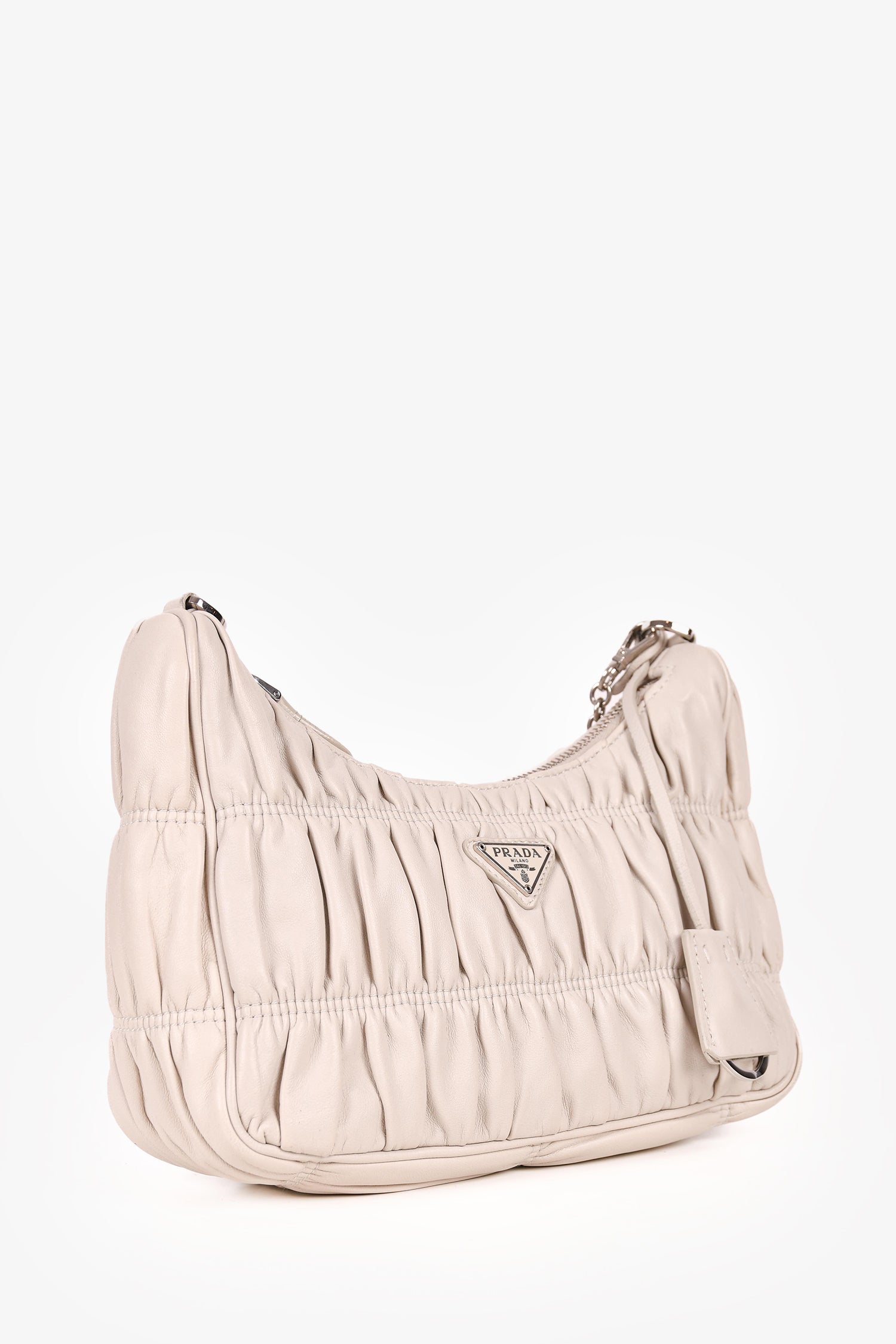 Refresh availabilityPrada Cream Nappa Gaufre Re-Edition 2005 With Nylon Strap. Top zip closure. Silver-tone hardware. Tonal nylon inner lining. Tonal stitching.