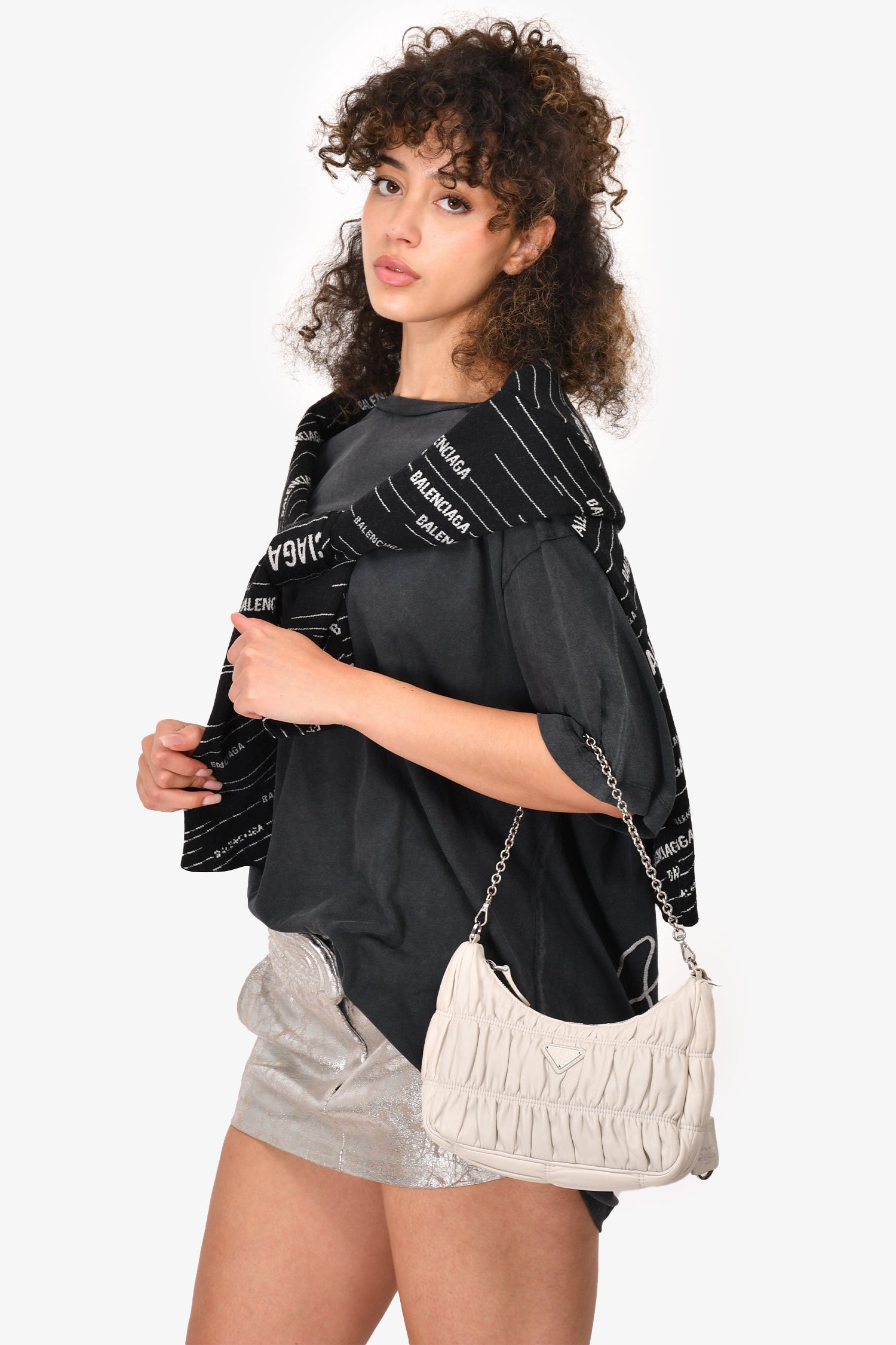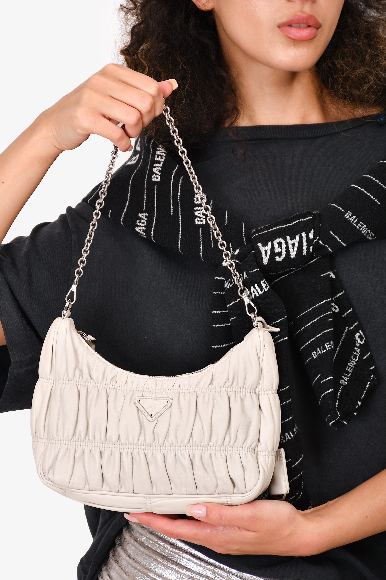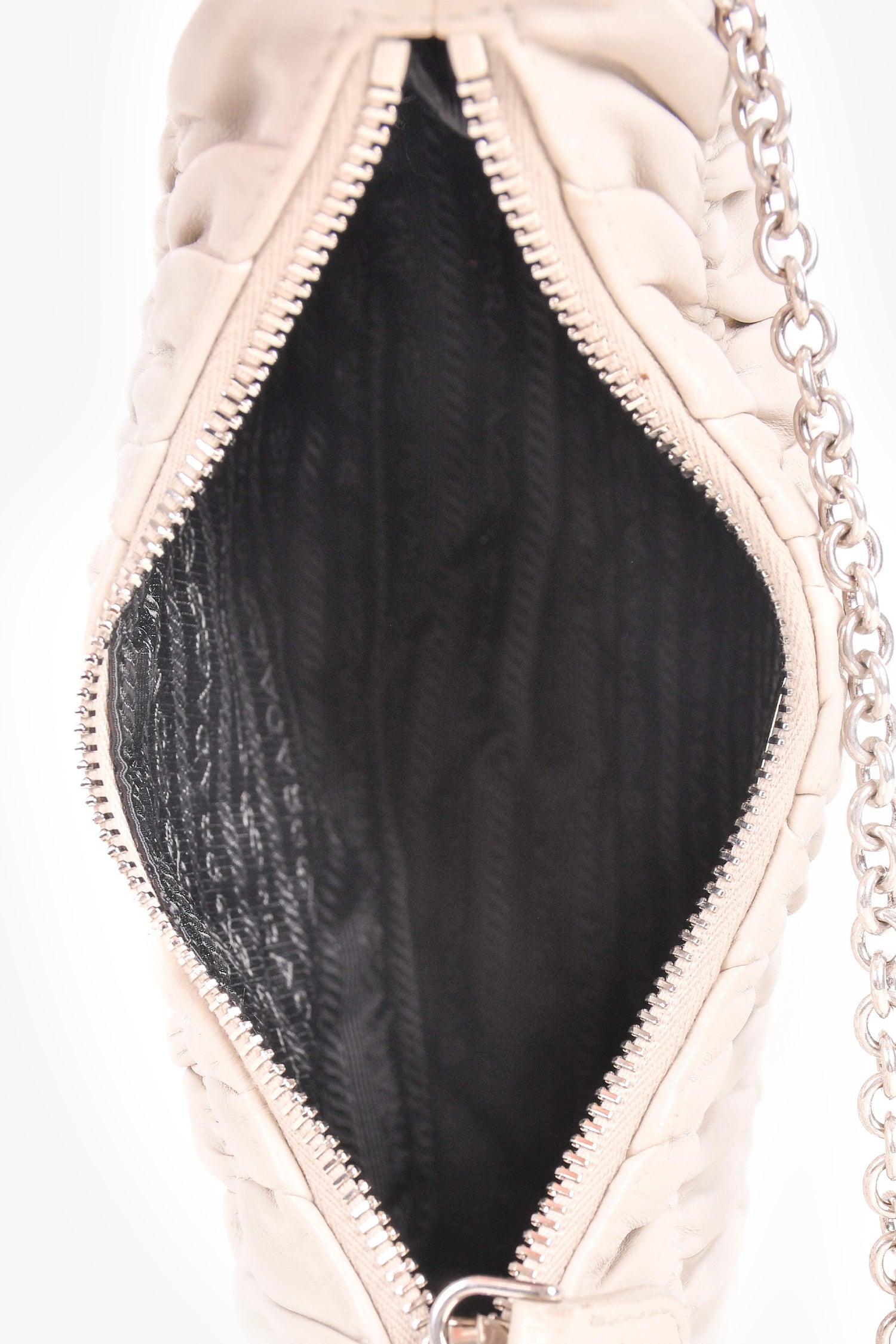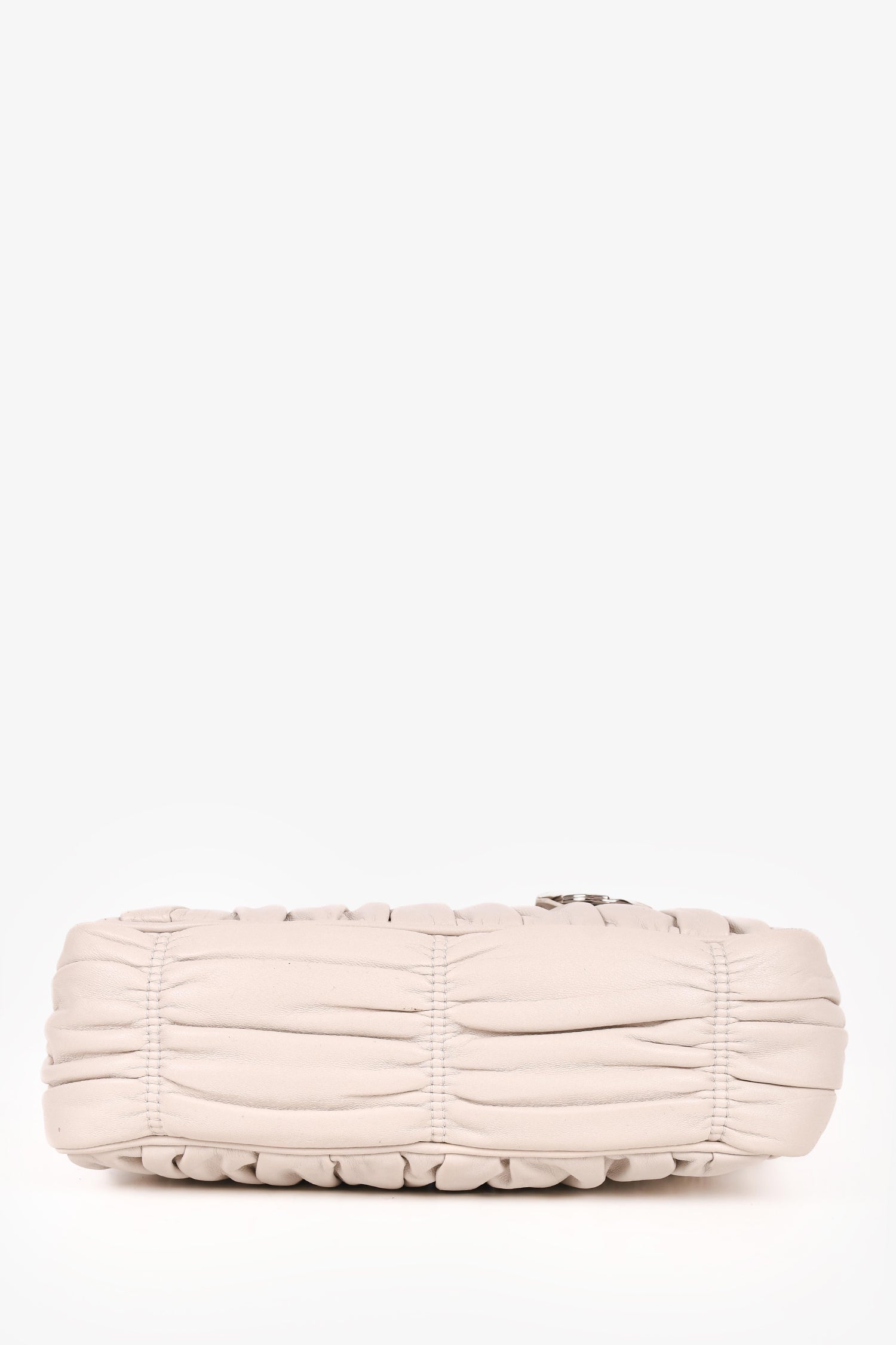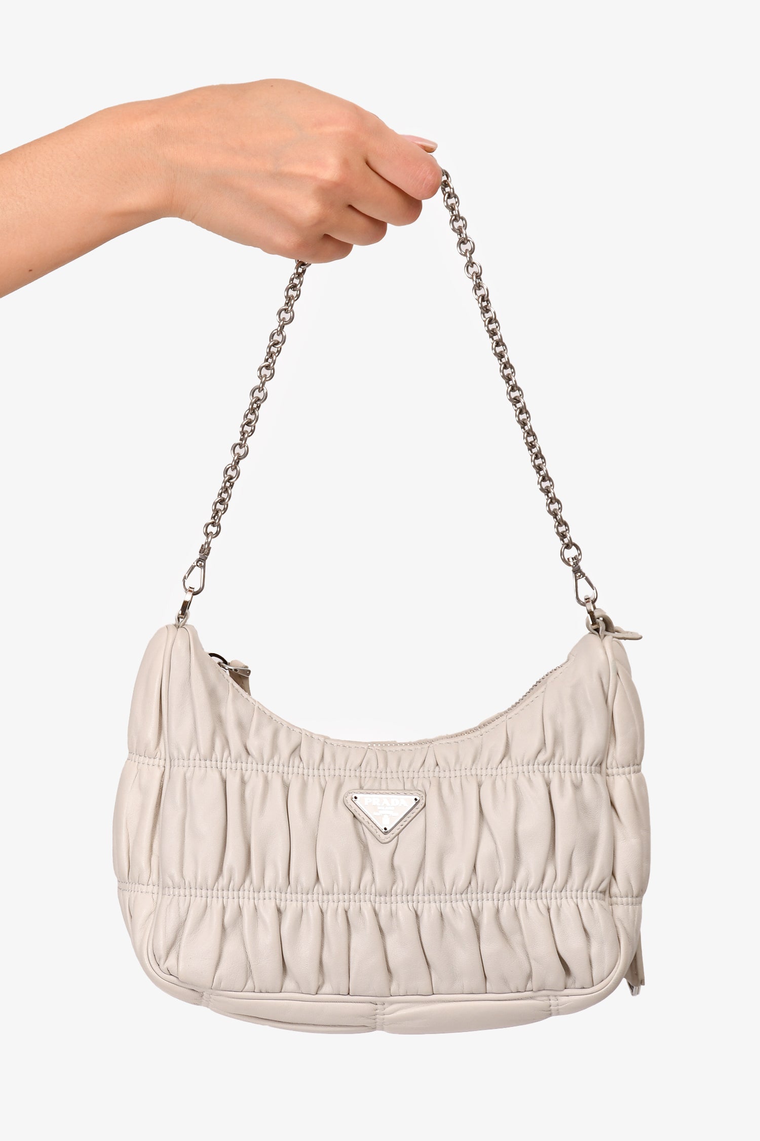 Refresh availabilityPrada Cream Nappa Gaufre Re-Edition 2005 With Nylon Strap. Top zip closure. Silver-tone hardware. Tonal nylon inner lining. Tonal stitching.