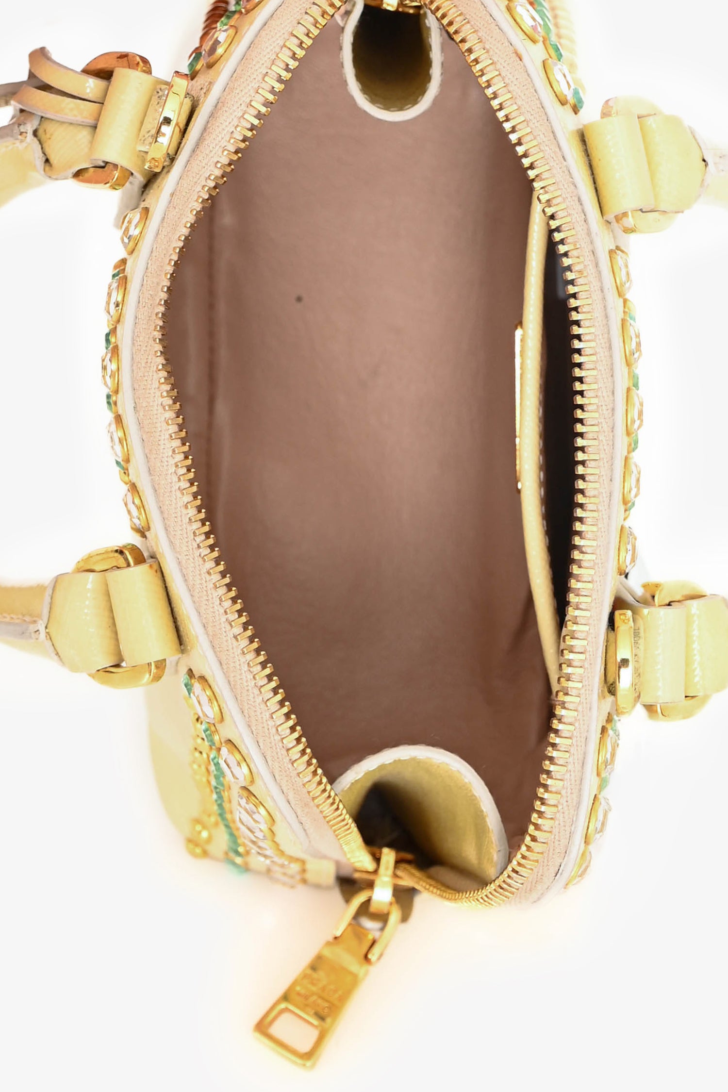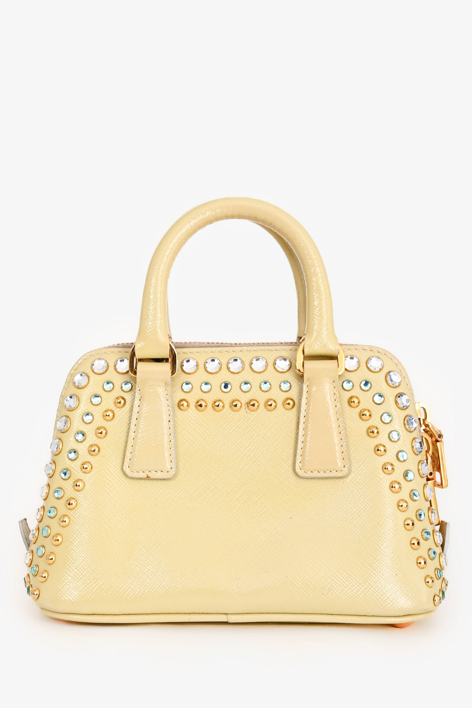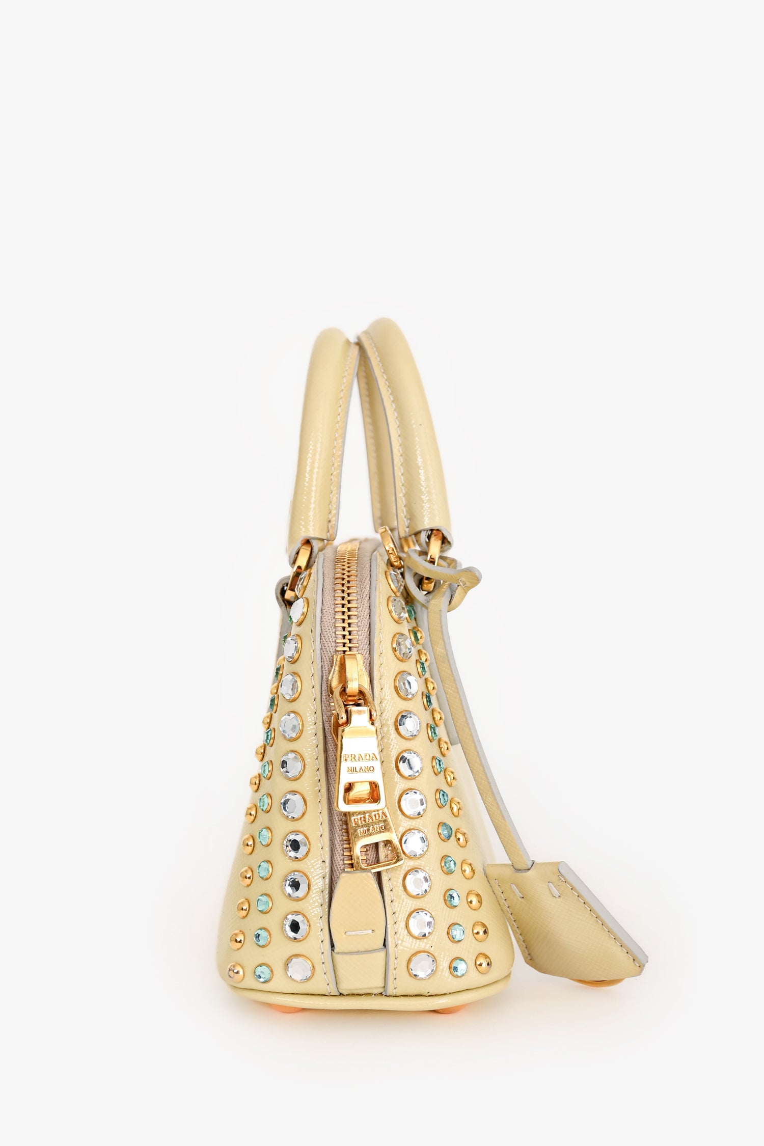 Refresh availabilityPrada Cream Saffiano Venice Bijoux Pyramid Bag. Dual rolled handles. Top two-way zip closure. Beige leather interior lining. Single interior wall slip pocket. Detachable clochette with keyring. Detachable and adjustable strap. Gold-tone hardware. Protective metal bottom.
