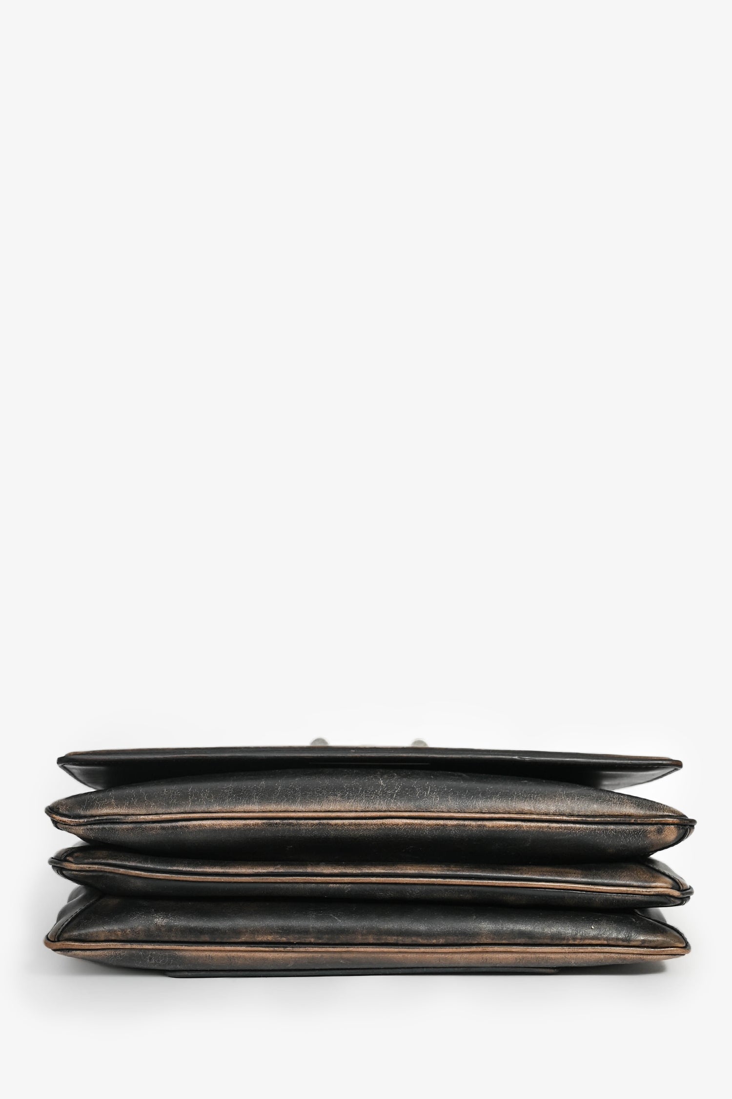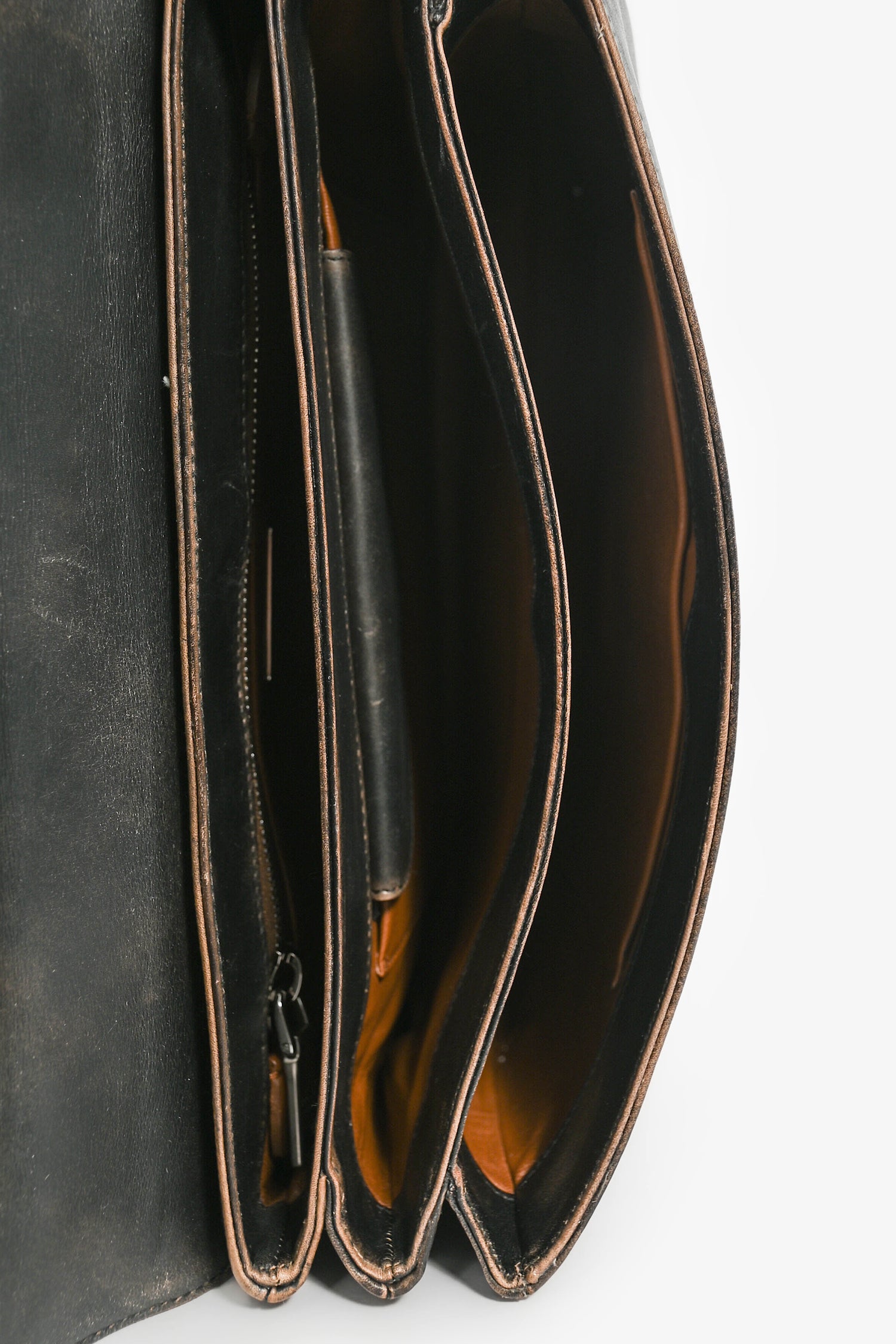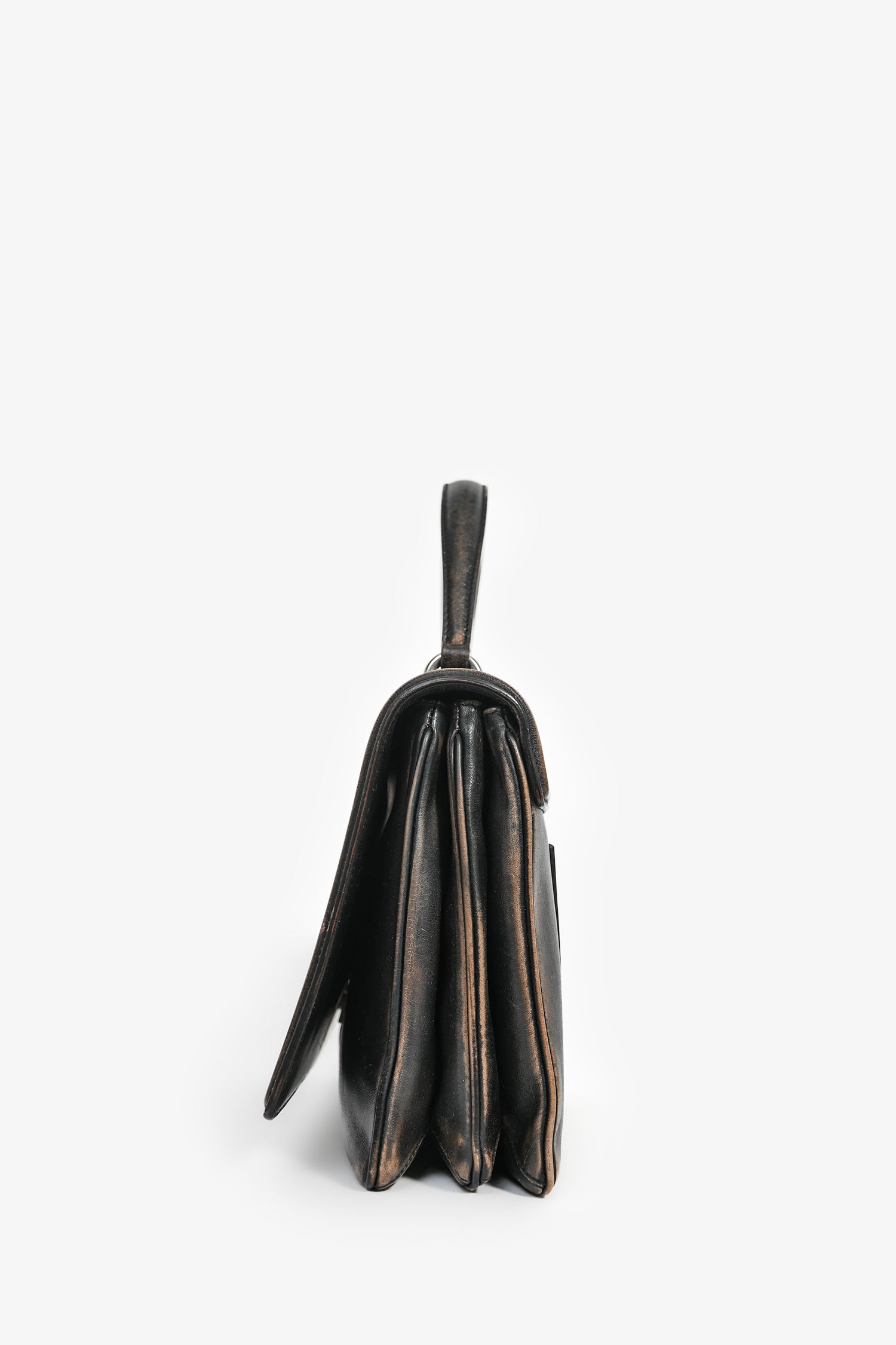 Refresh availabilityPrada Distressed Brown Vitello Daino Flap Top Handle. Single handle. Front Fold-over flap with push-release closure. Exterior slip pocket with magnetic closure. 3 compartment: 1 with wall slip pocket; 1 with fold-over magnetic closure flap pocket; 1 with wall zip pocket. Comes with key pouch strap. Silver-tone hardware. Tonal leather lining. Tonal stitching.