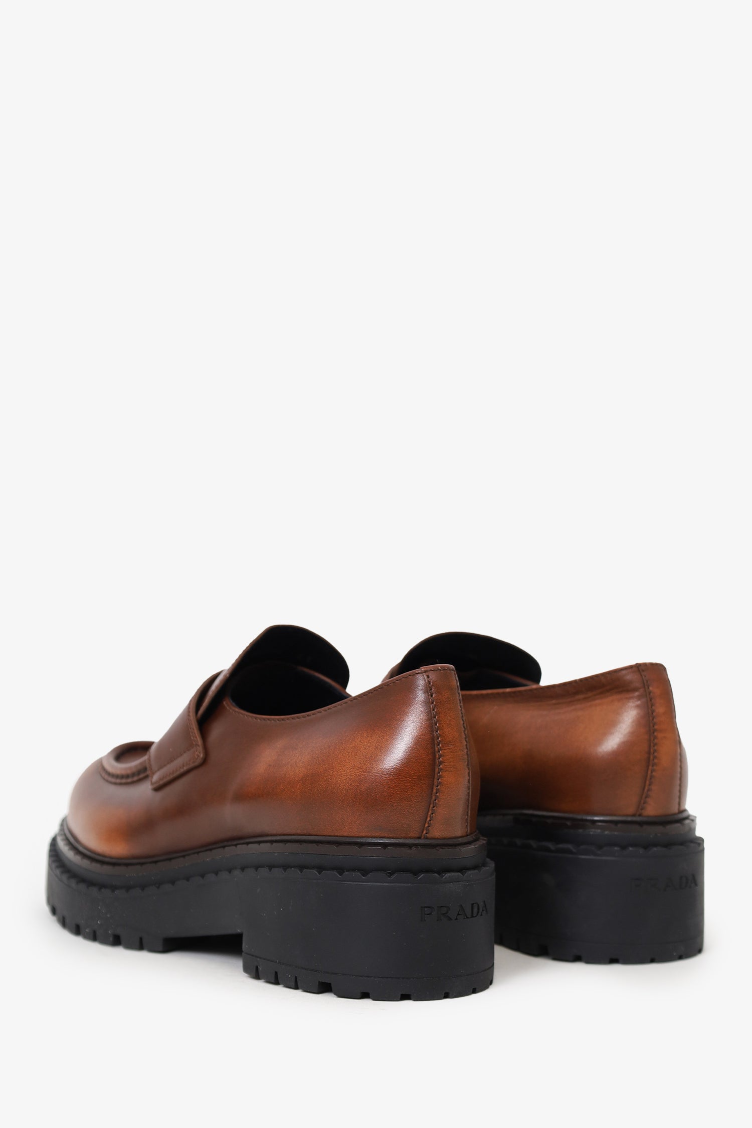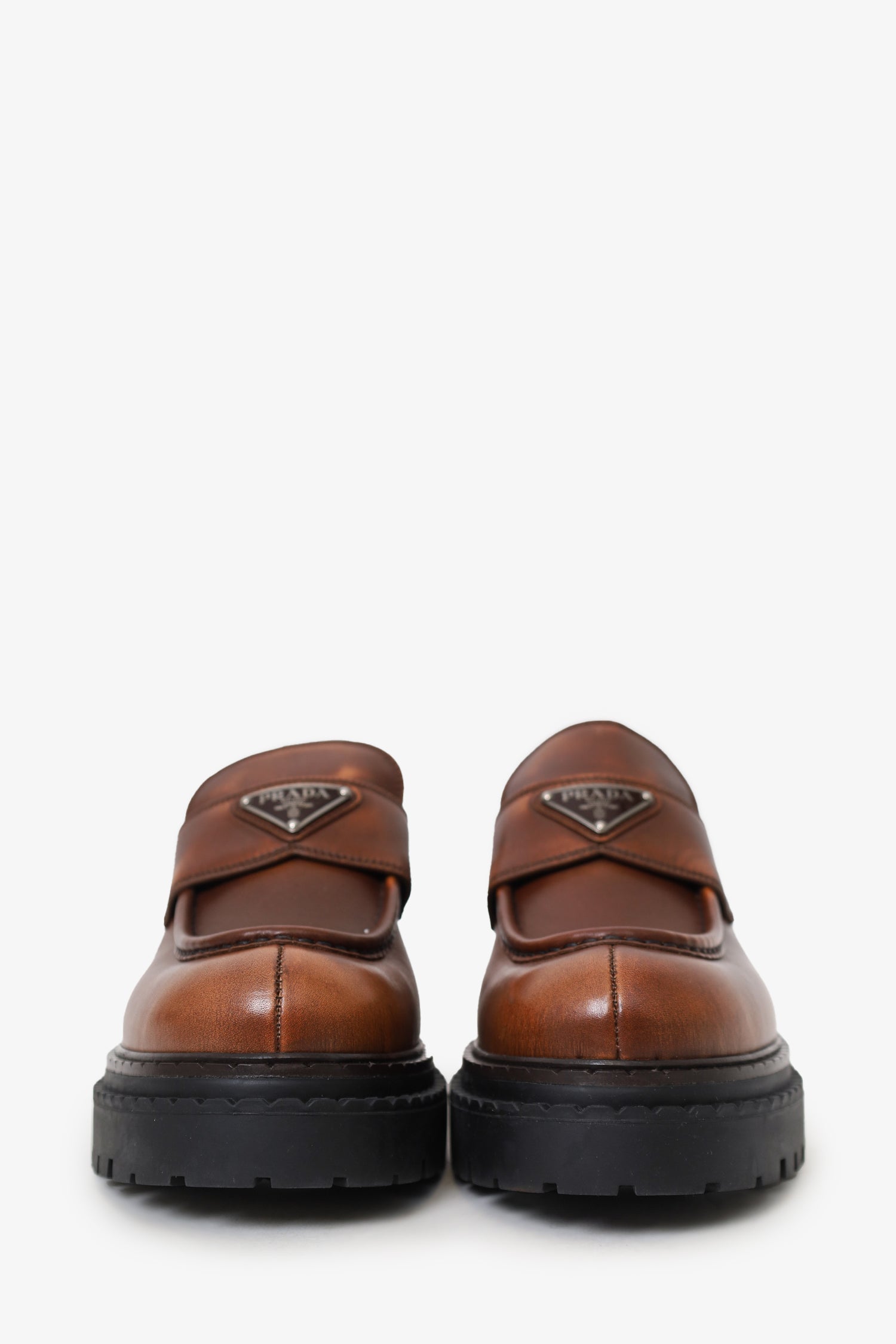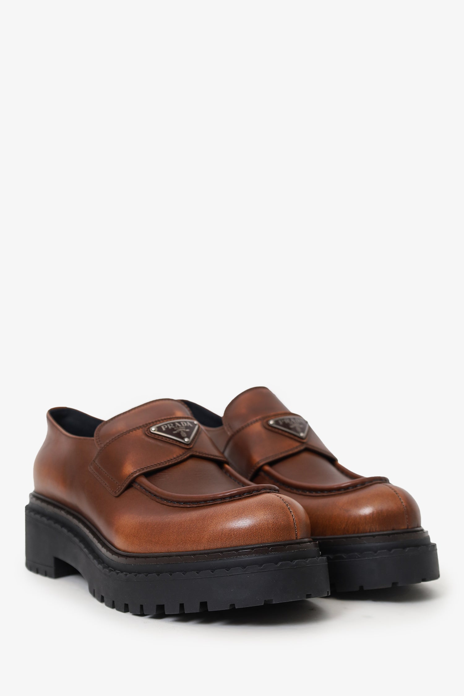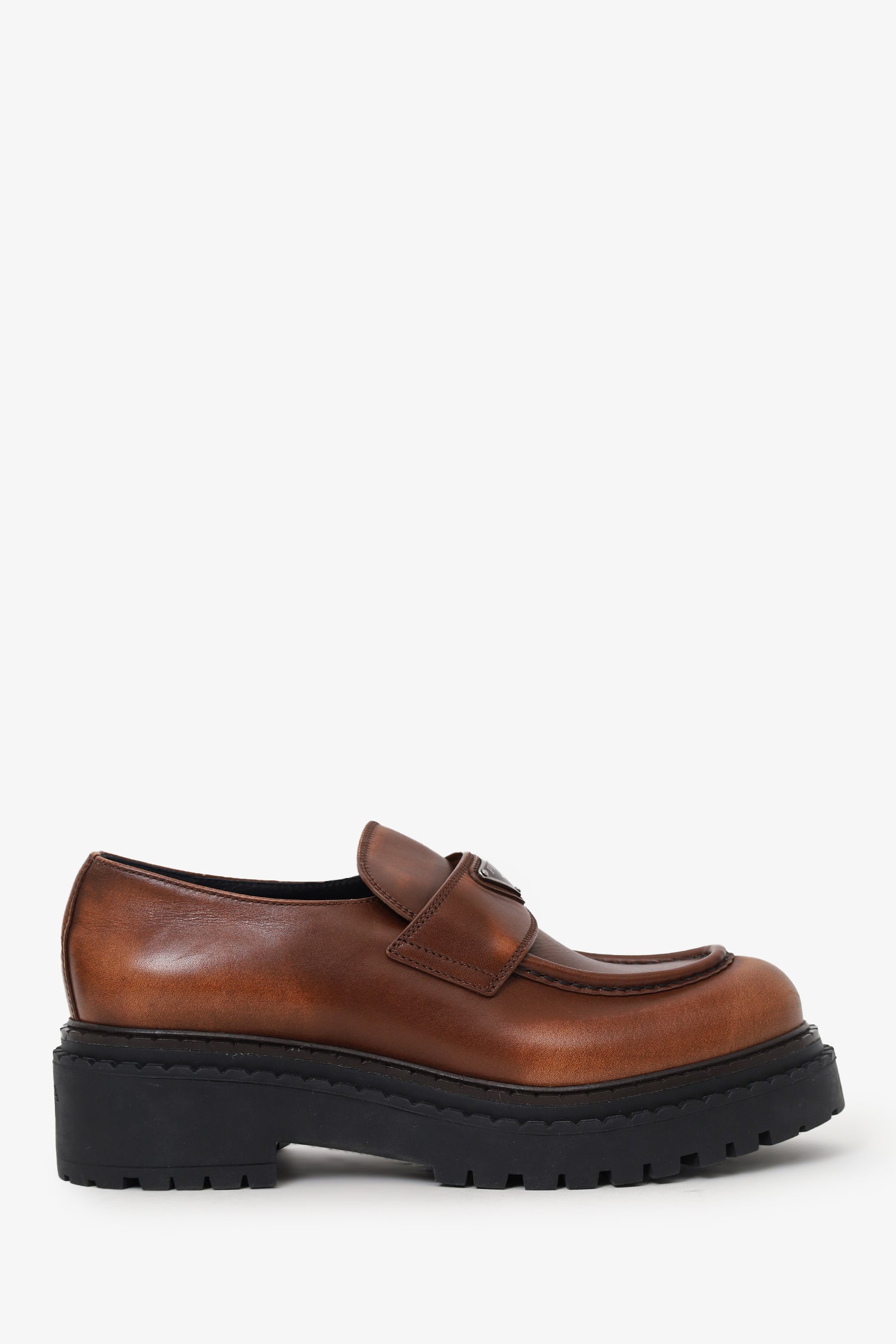 Refresh availabilityPrada Double Chocolate Brushed Leather Platform Loafer. Slip-on. Round-toe. Silver-tone hardware. Tonal stitching.