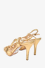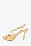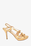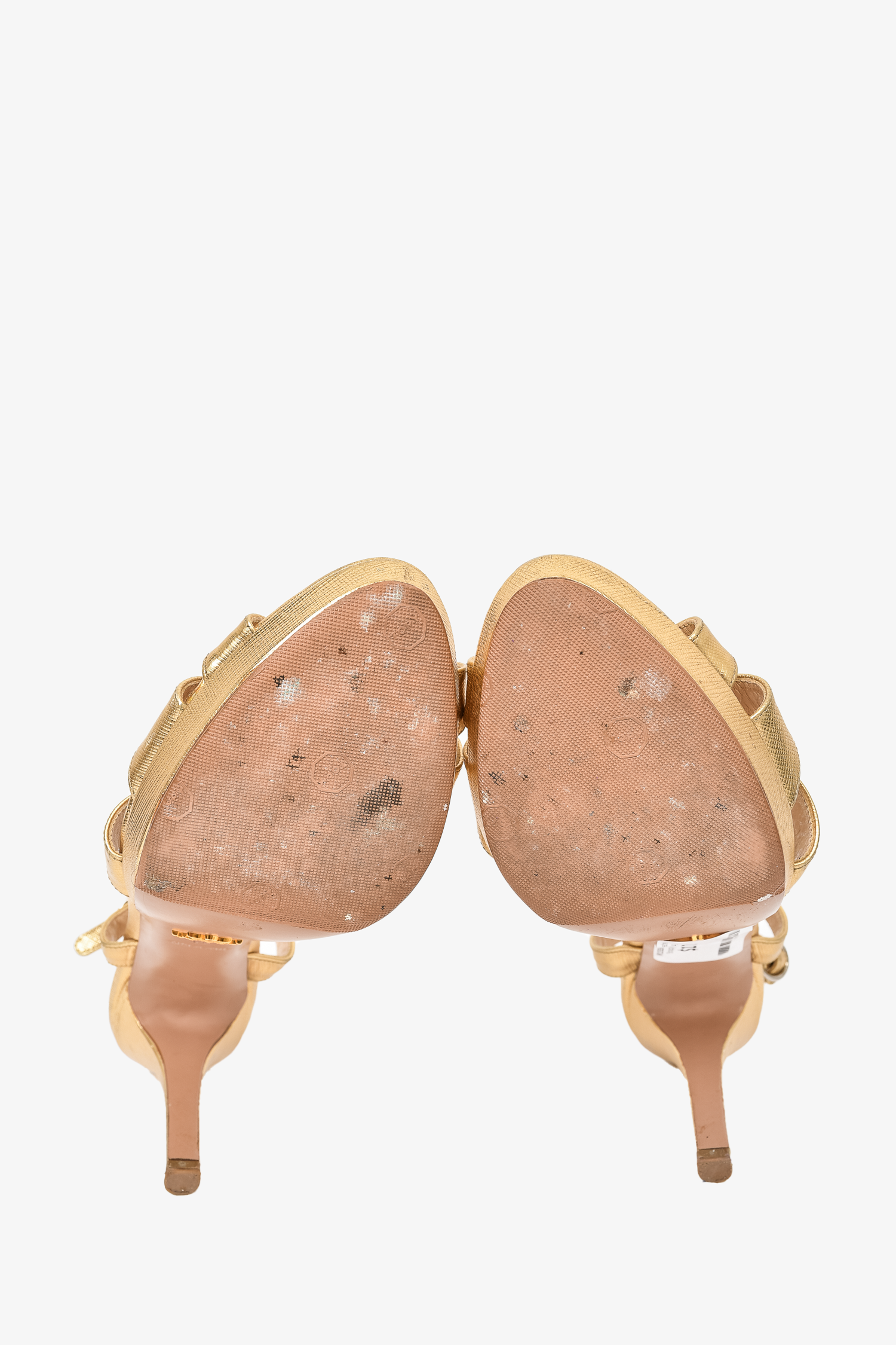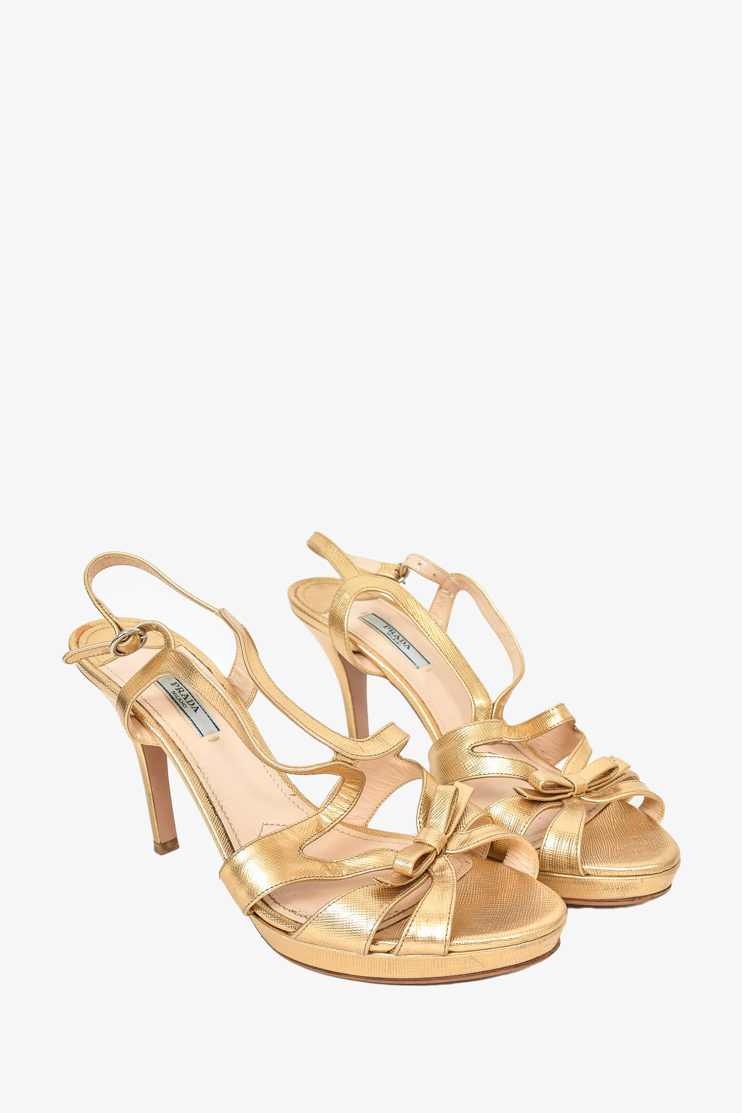 Refresh availabilityPrada Gold Leather Strappy Bow Heels. Ankle strap with buckle closure. Pointed toe. Tonal stitching.