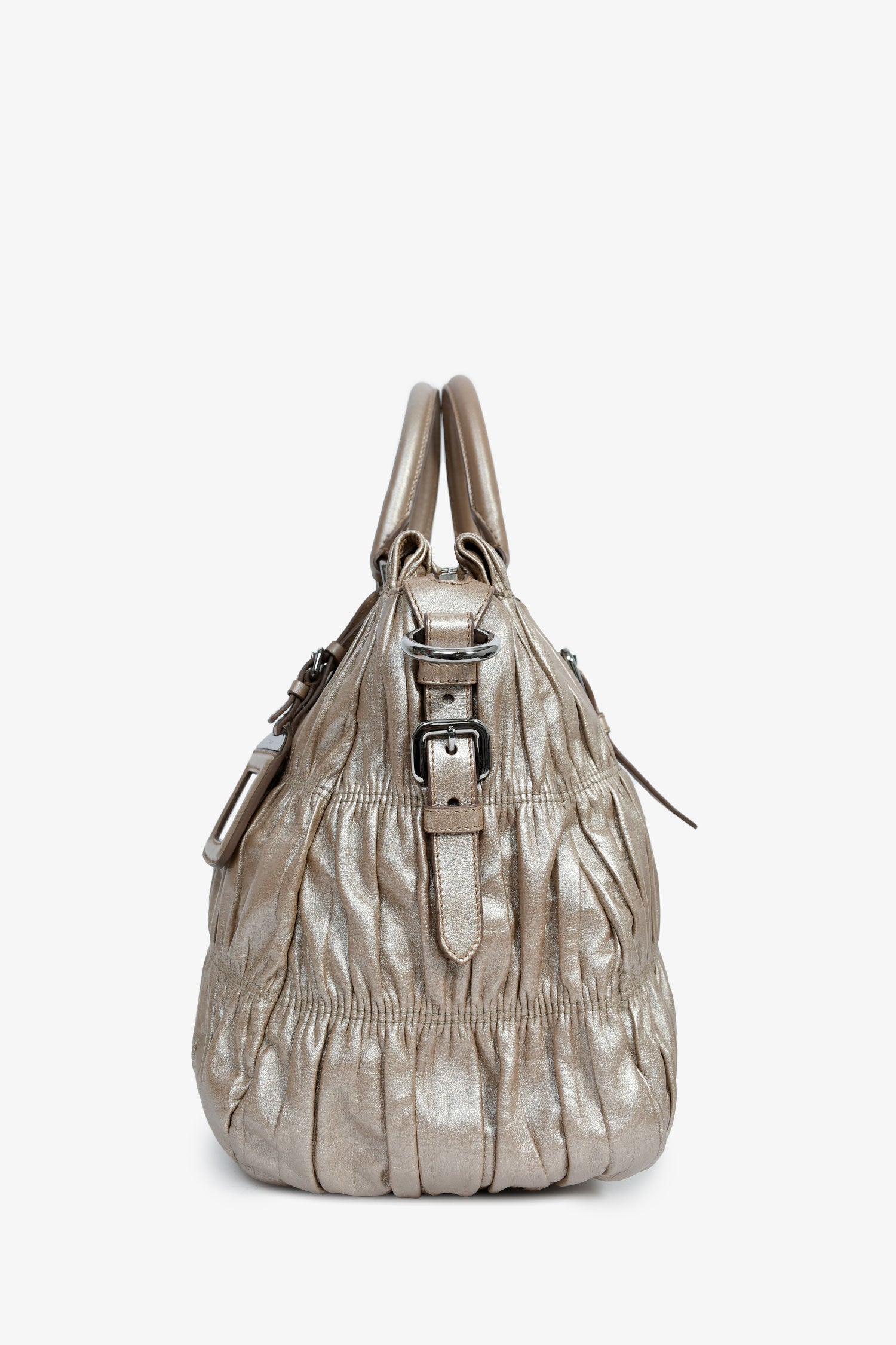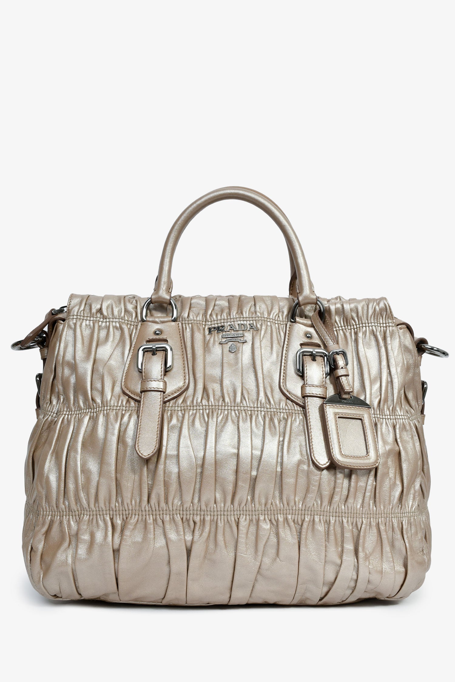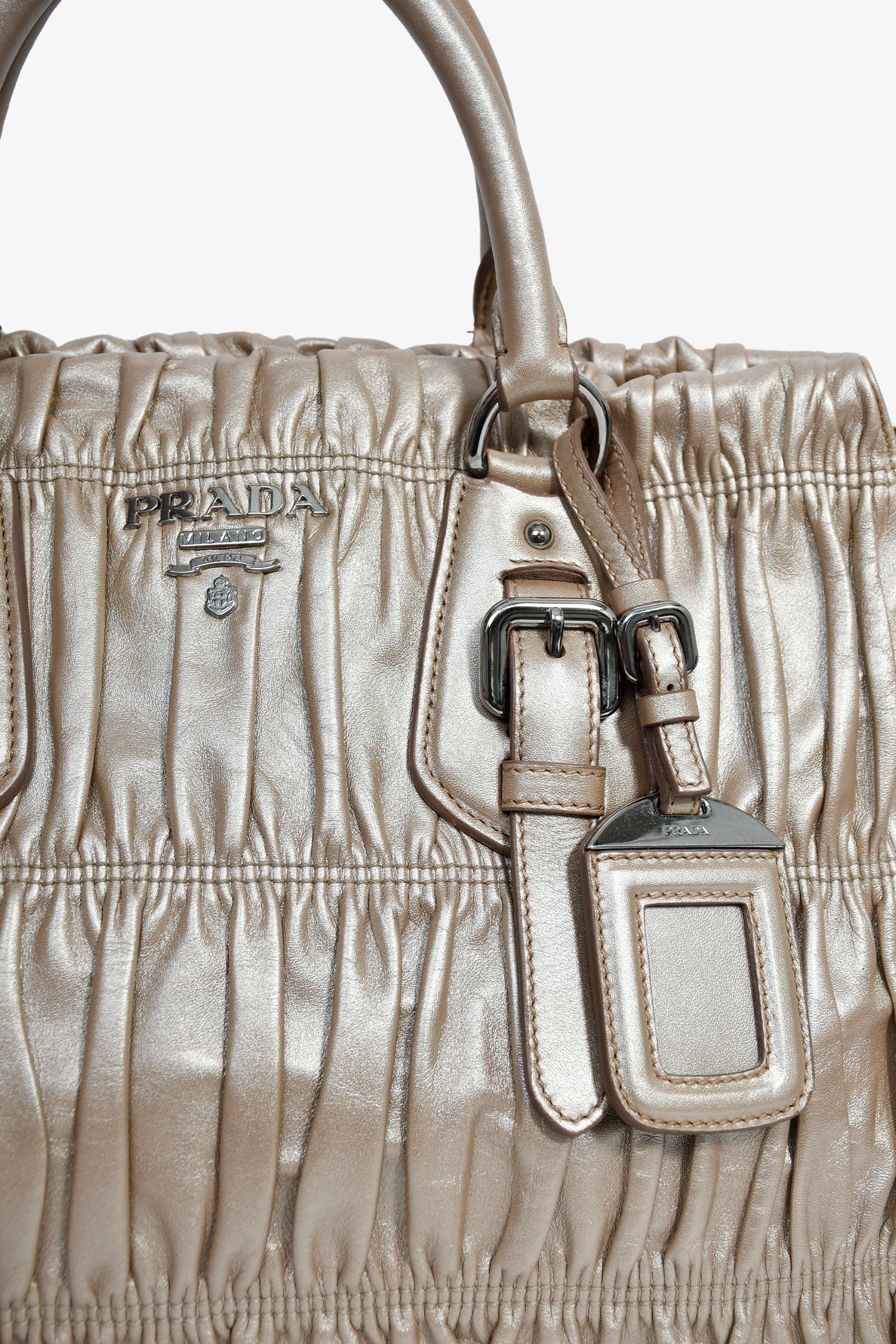 Refresh availabilityPrada Gold Metallic Nappa Gaufre Leather Top Handle Bag. Rolled top handles. Silver-tone hardware. Single shoulder strap. Lined interior with 2 pockets. Zipped compartment. Tonal stitching.
