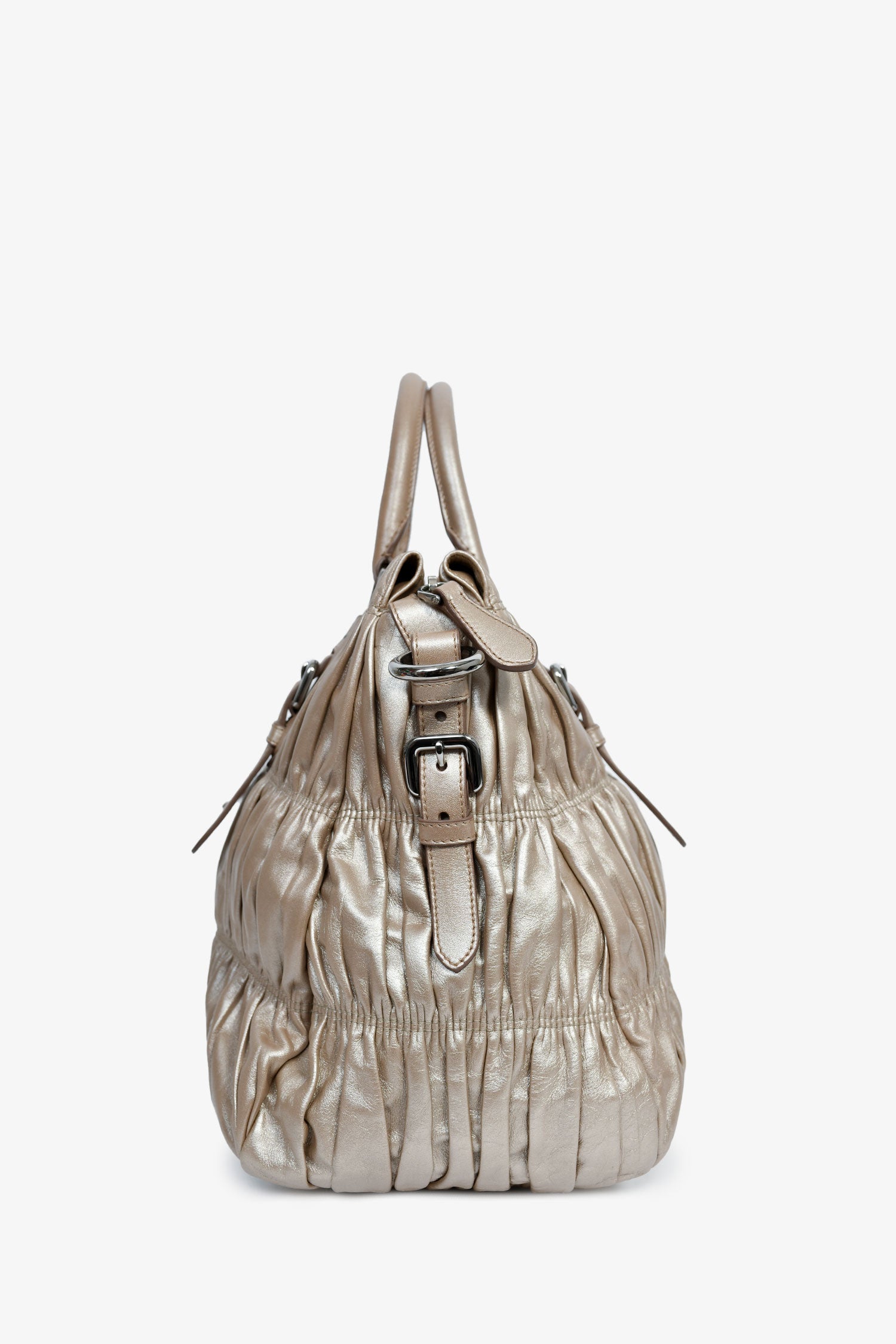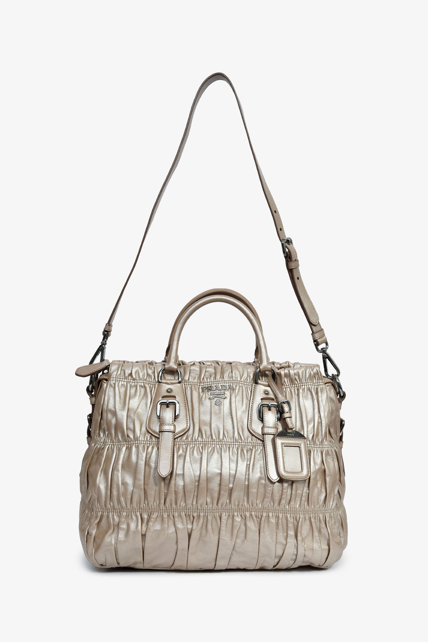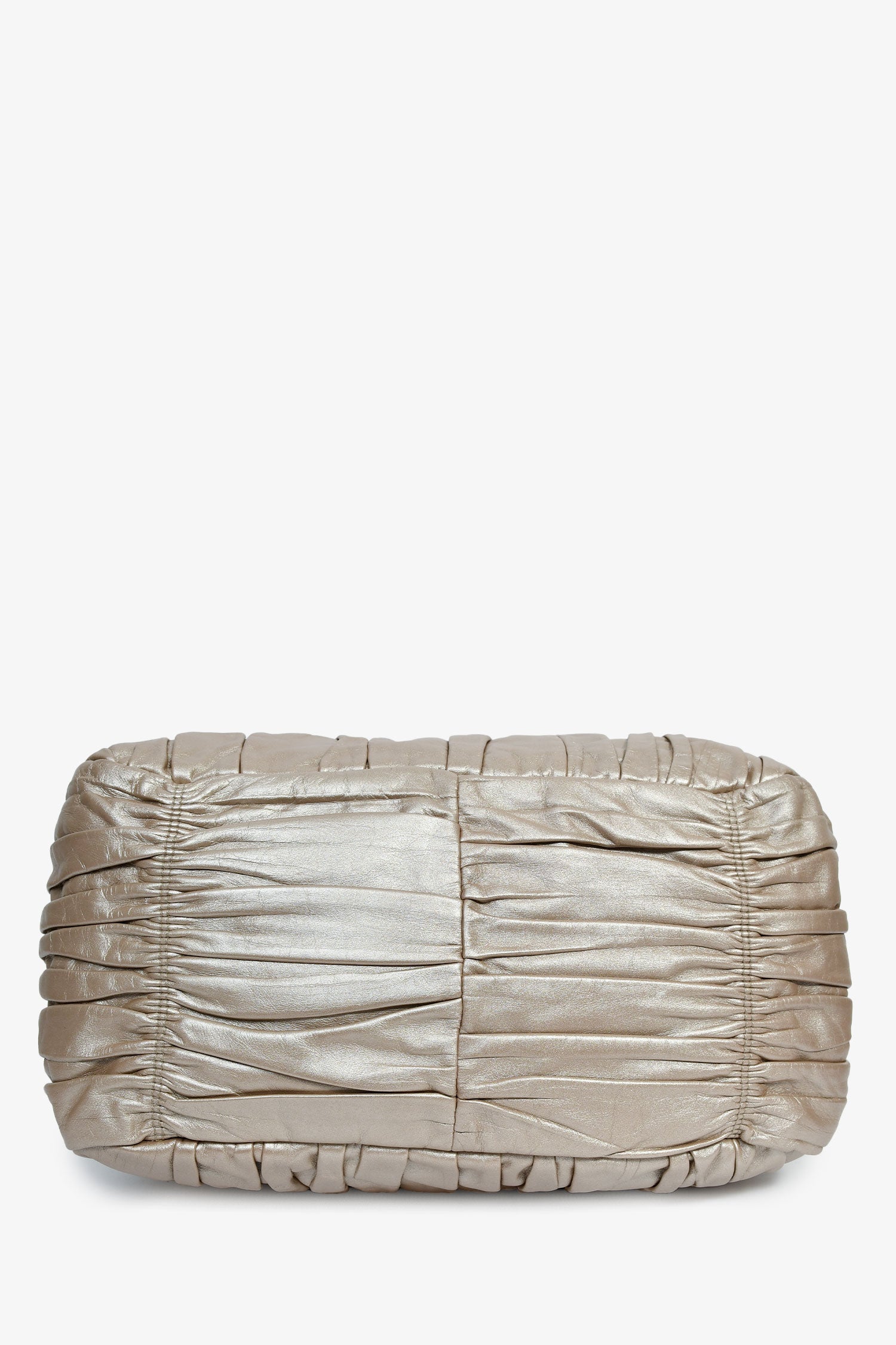 Refresh availabilityPrada Gold Metallic Nappa Gaufre Leather Top Handle Bag. Rolled top handles. Silver-tone hardware. Single shoulder strap. Lined interior with 2 pockets. Zipped compartment. Tonal stitching.