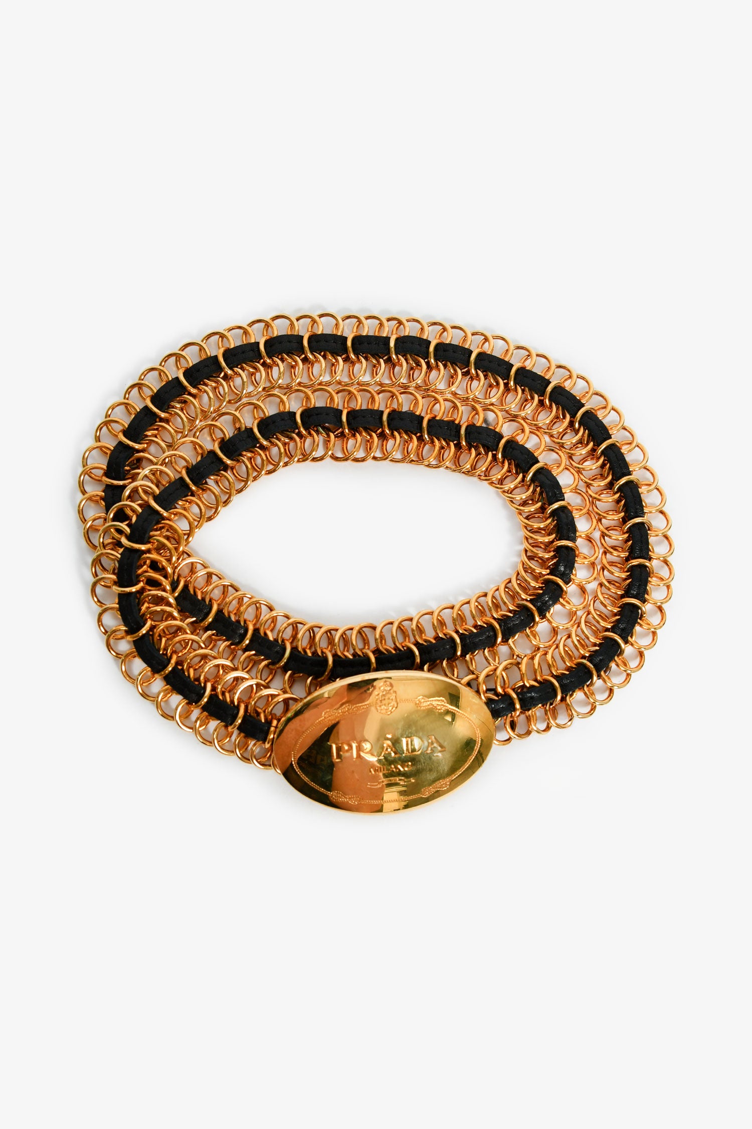 Refresh availabilityPrada Gold Tone Leather Chain Plaque Belt. Latch closure. No belt holes.