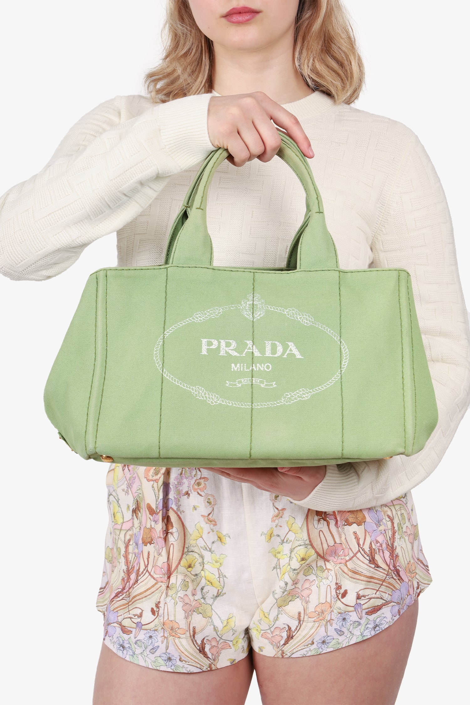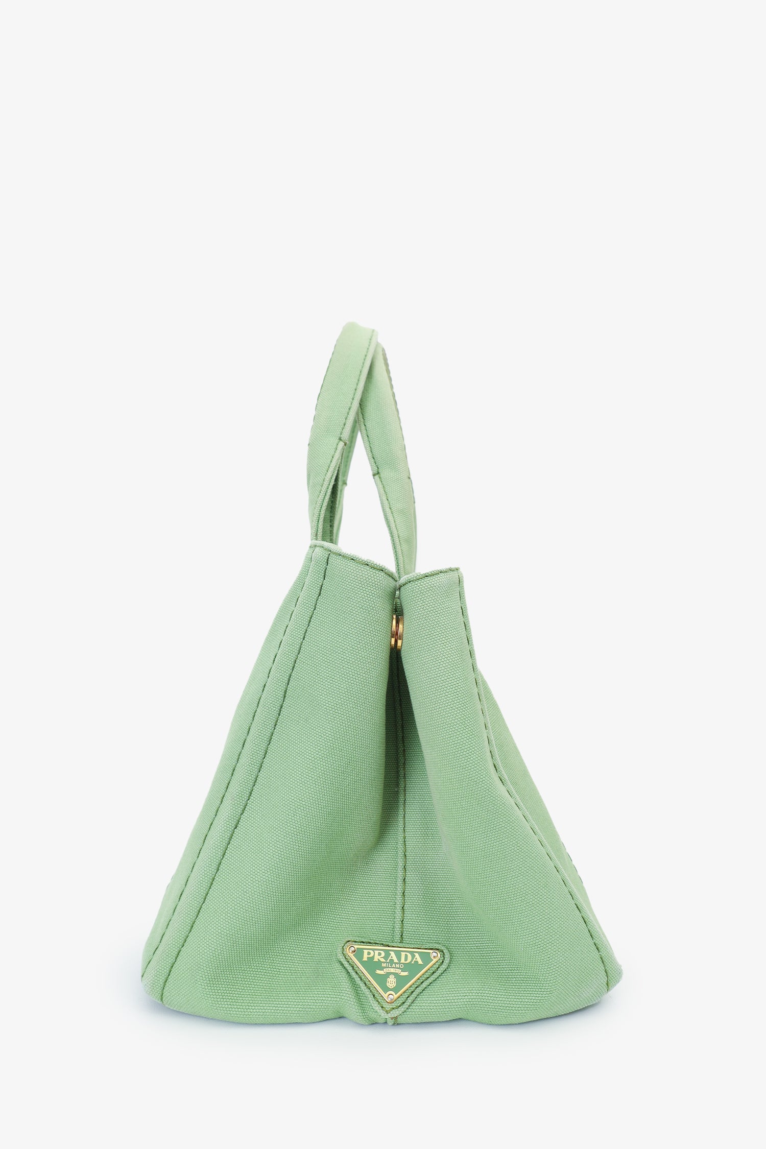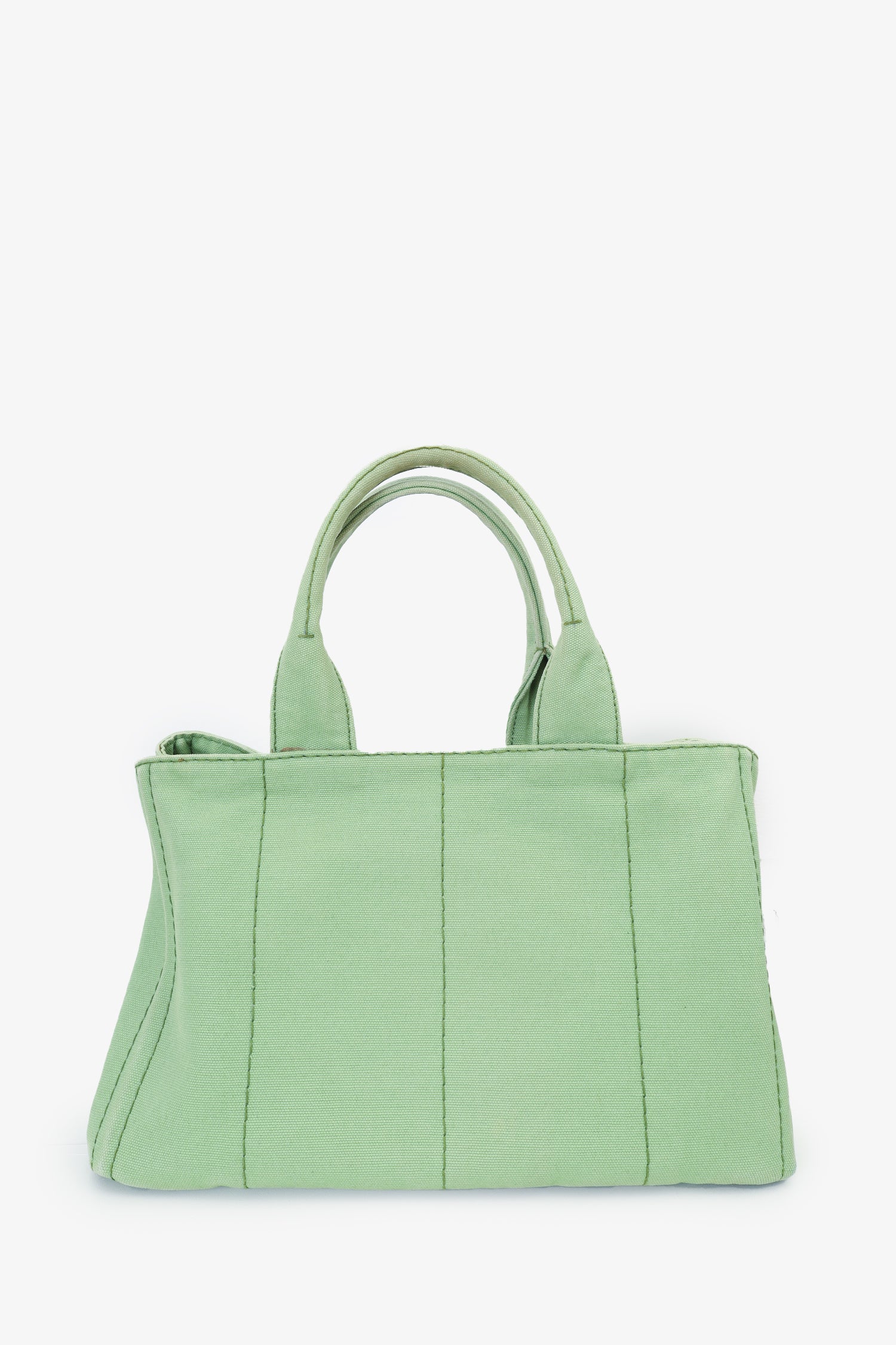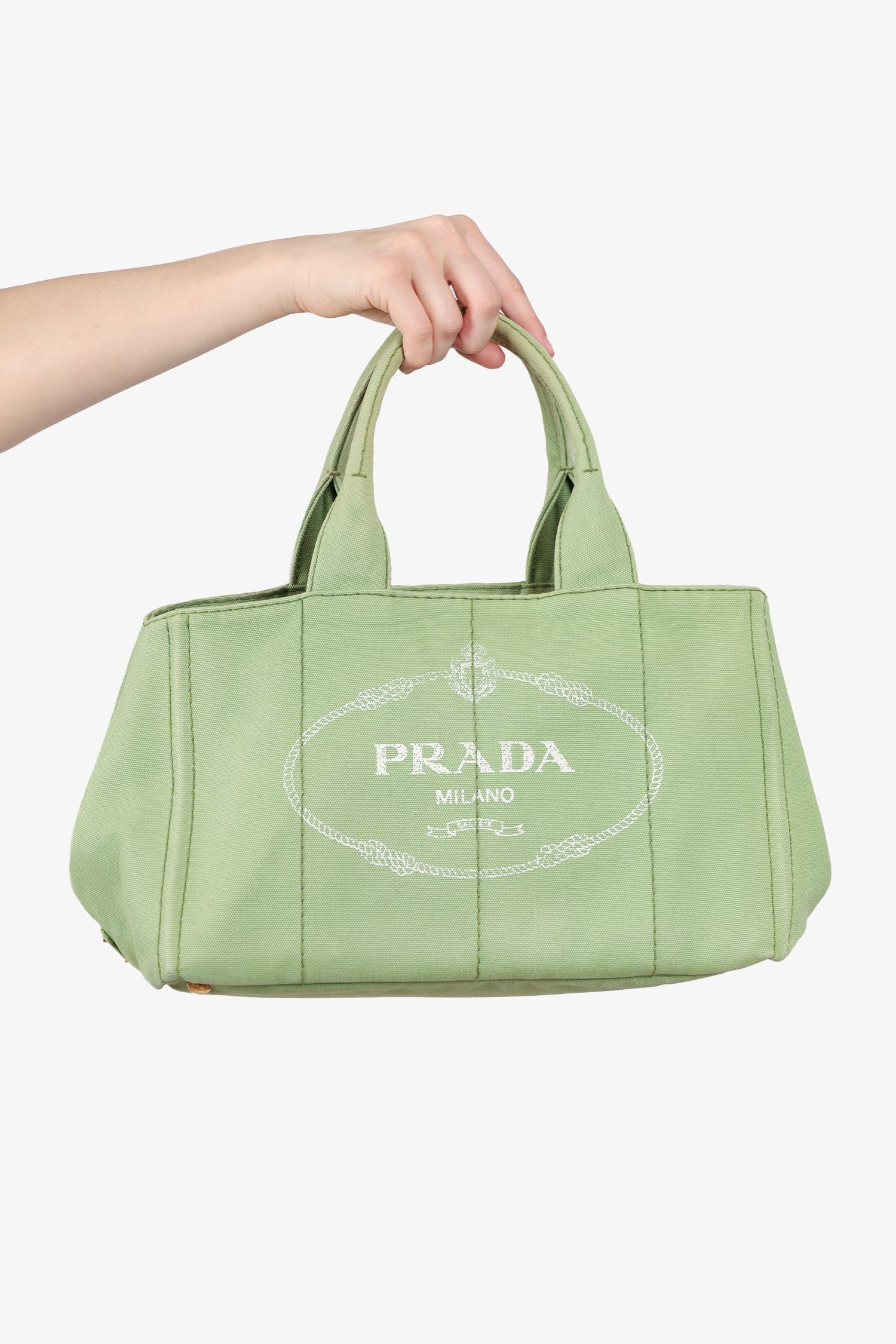 Prada Green Canvas Logo Canapa Tote Bag. Unlined. Gold-tone hardware. 2 interior slip pockets. 2 interior wall zip pocket. Tonal stitching.