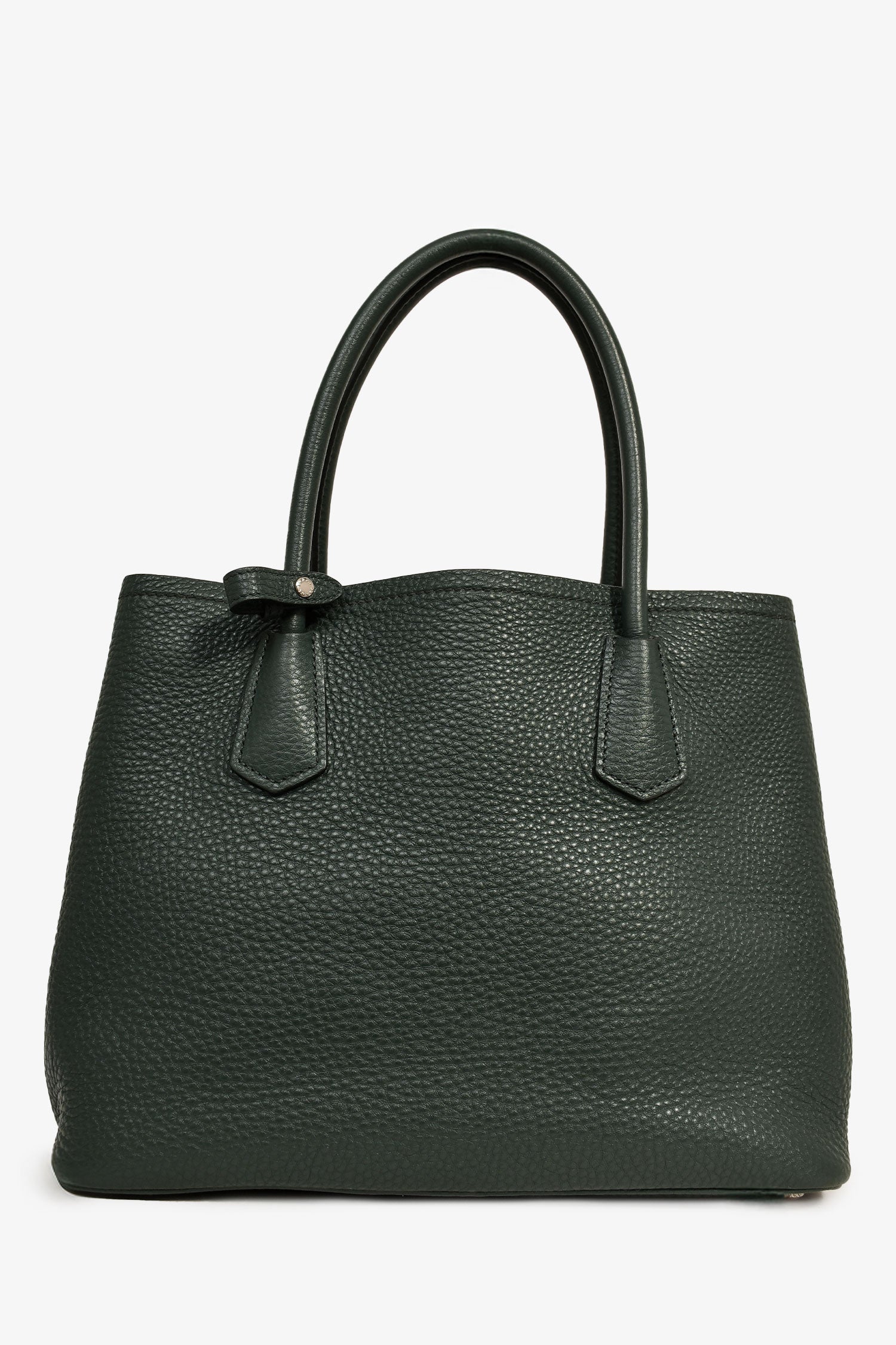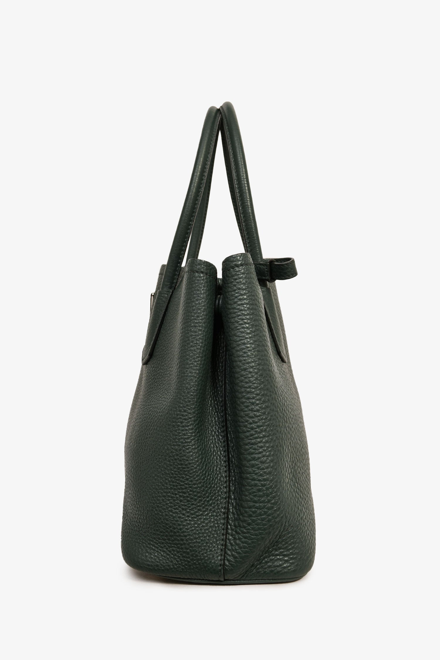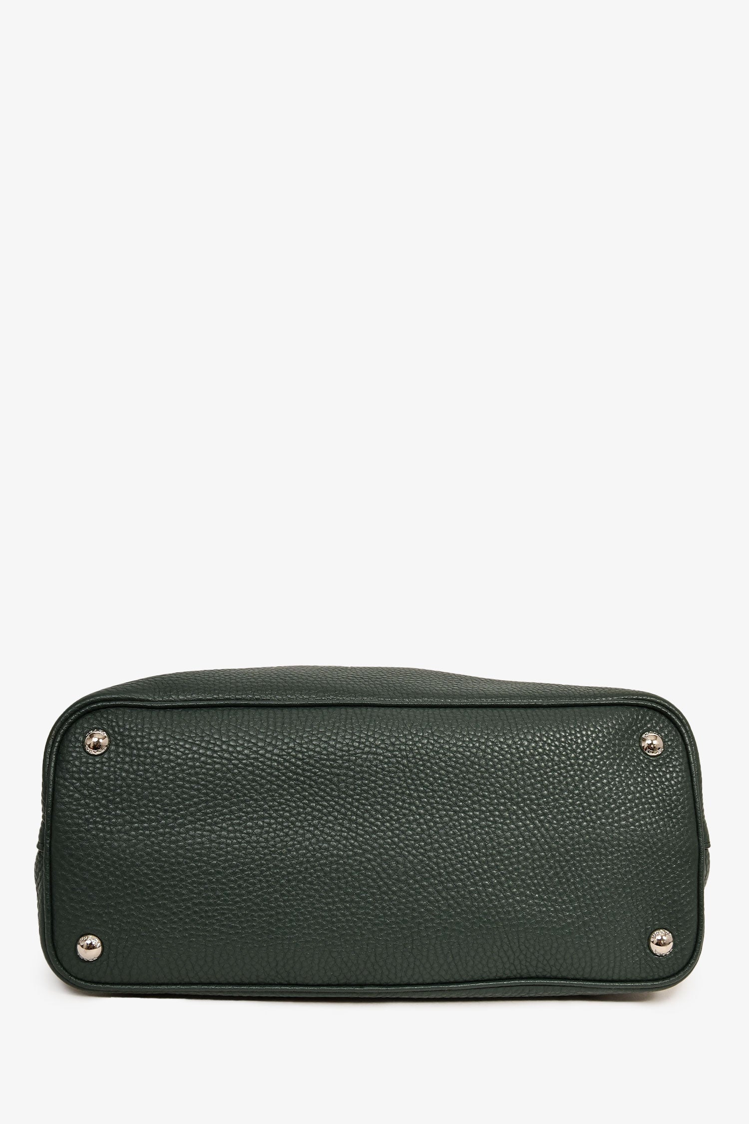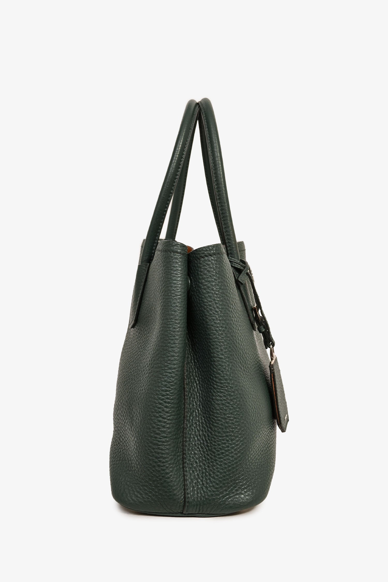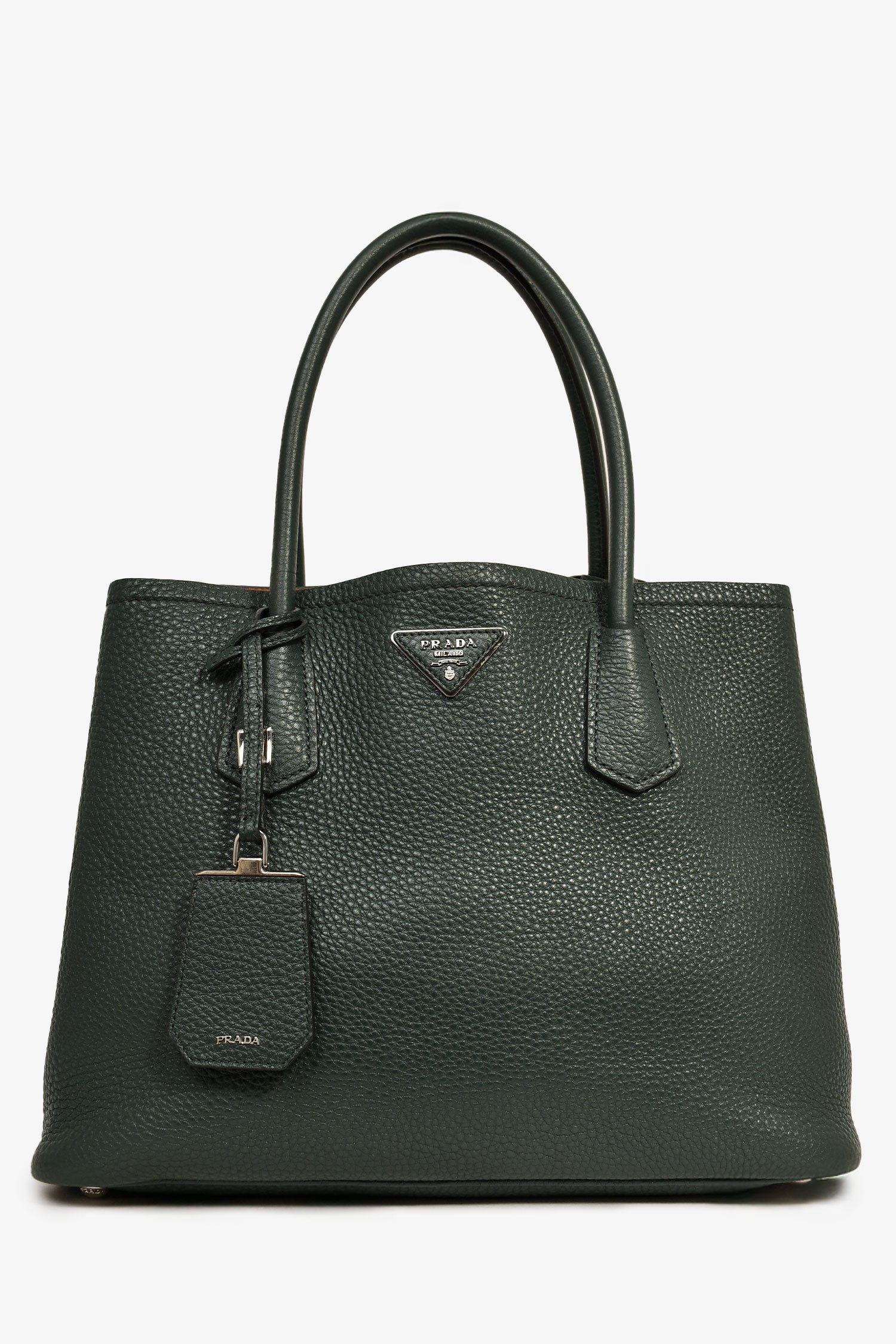 Refresh availabilityPrada Green Grained Leather Vitello Daino Top Handle Bag. Rolled top handles. Silver-tone hardware. Grained interior and exterior leather. Attached clochette. Single interior compartment. Comes with a strap. Tonal stitching.