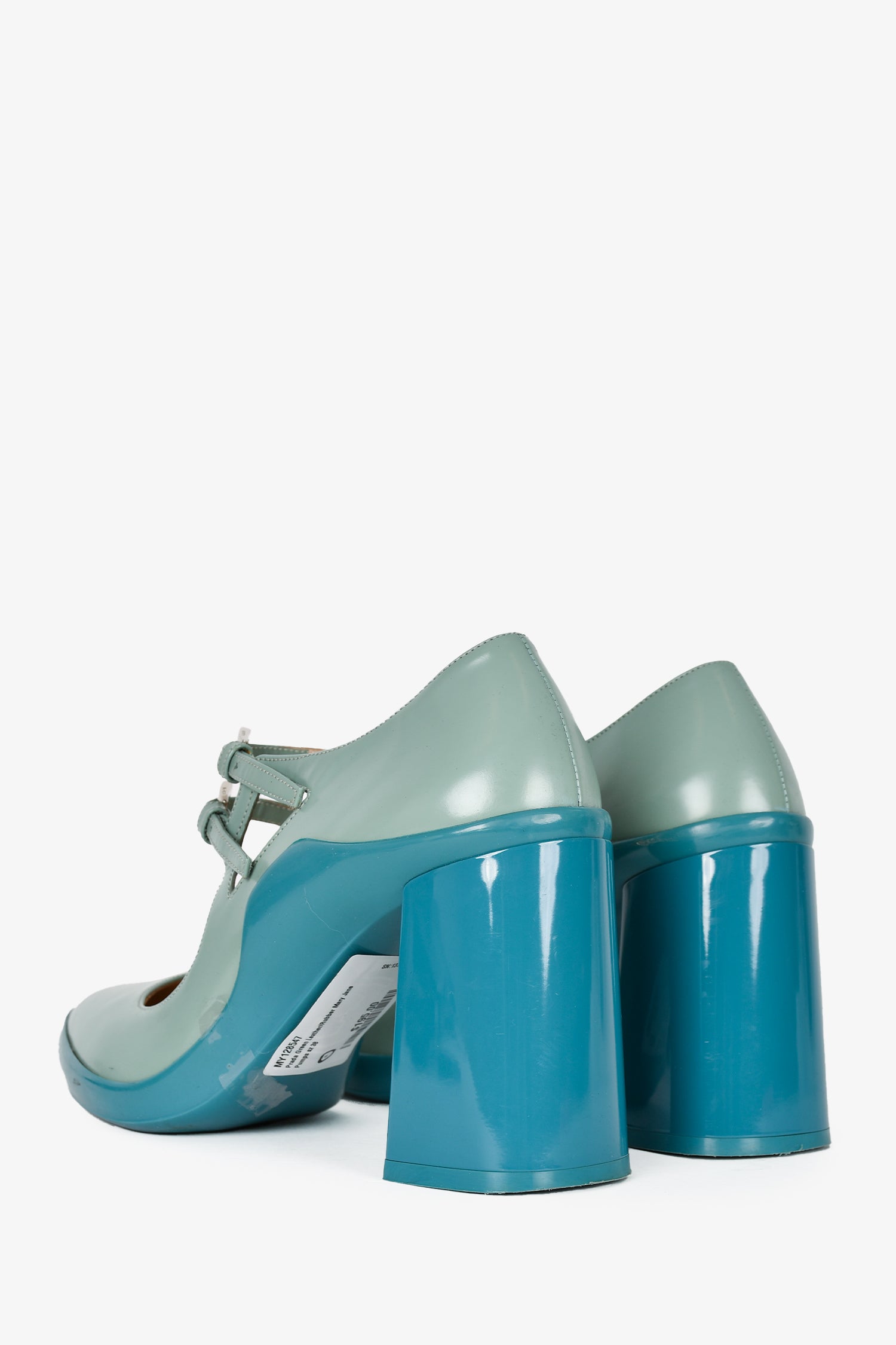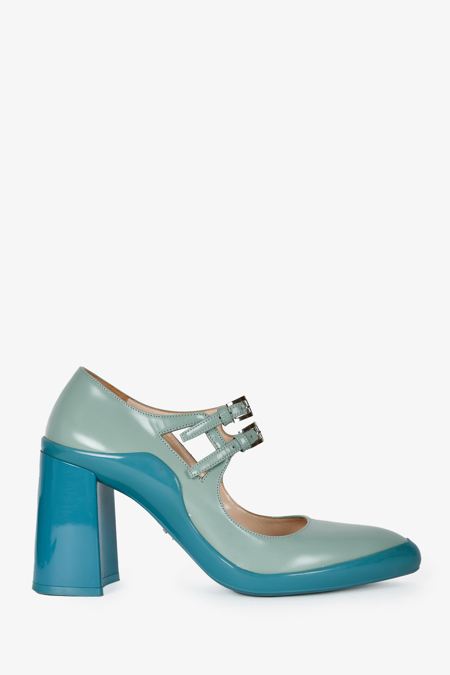 Refresh availabilityPrada Green Leather/Rubber Mary Jane Pumps. Slip-on. Pointed toe. Adjustable straps with buckle closures. Block heel. Tonal stitching.