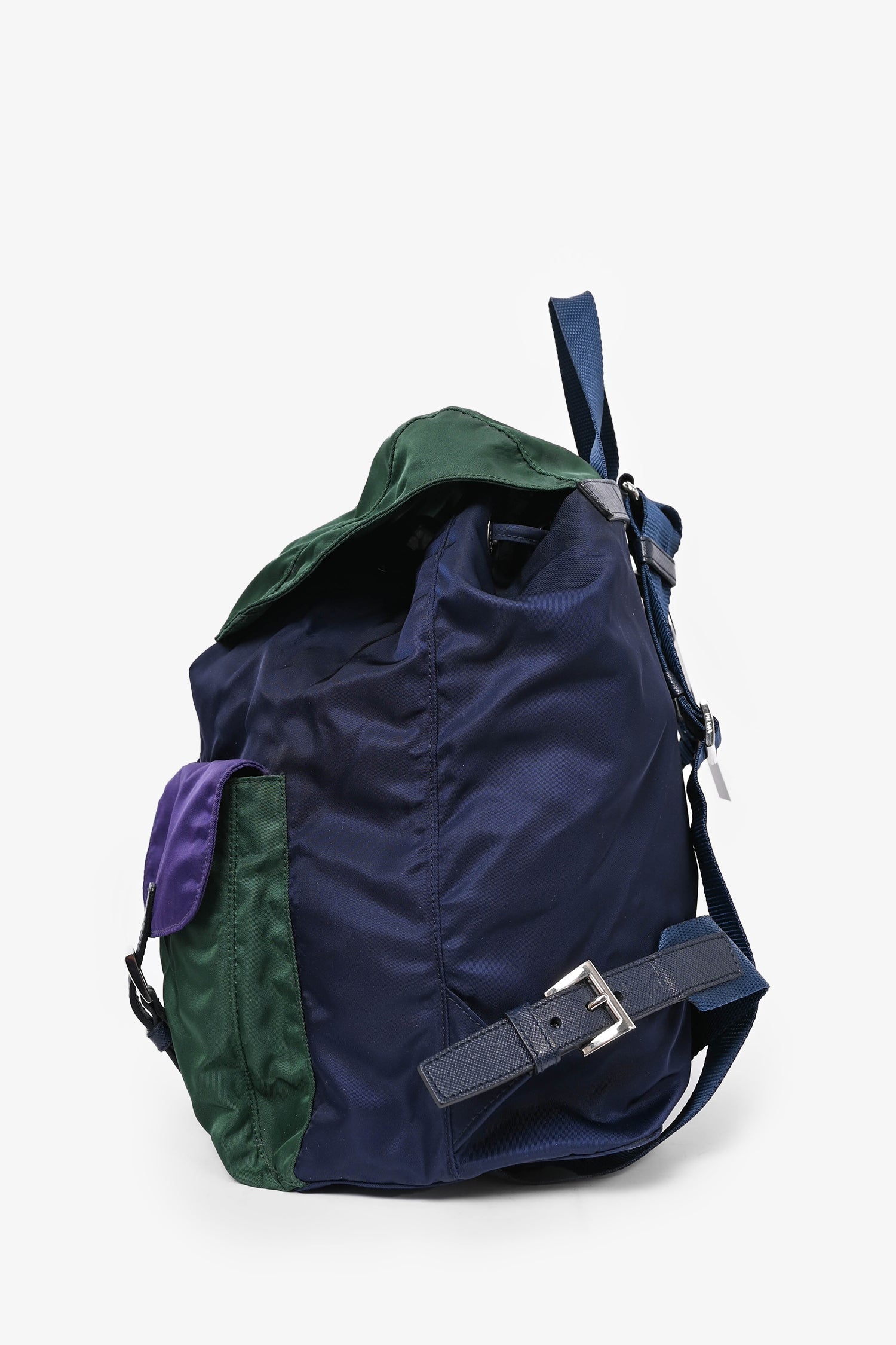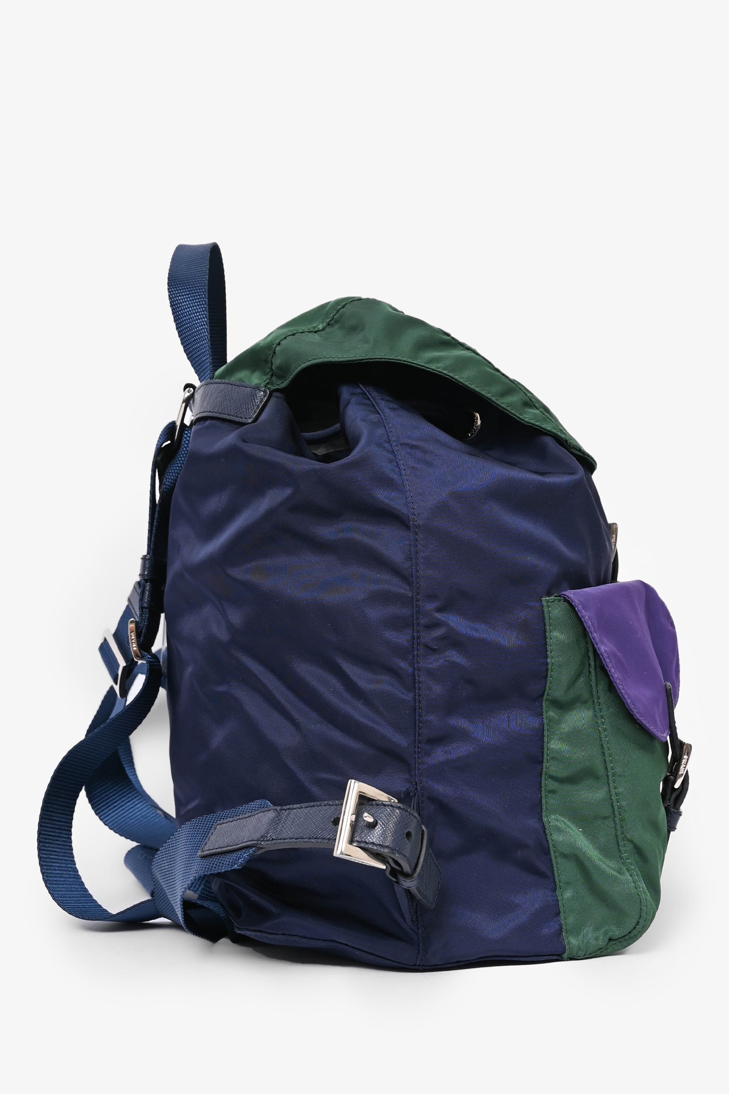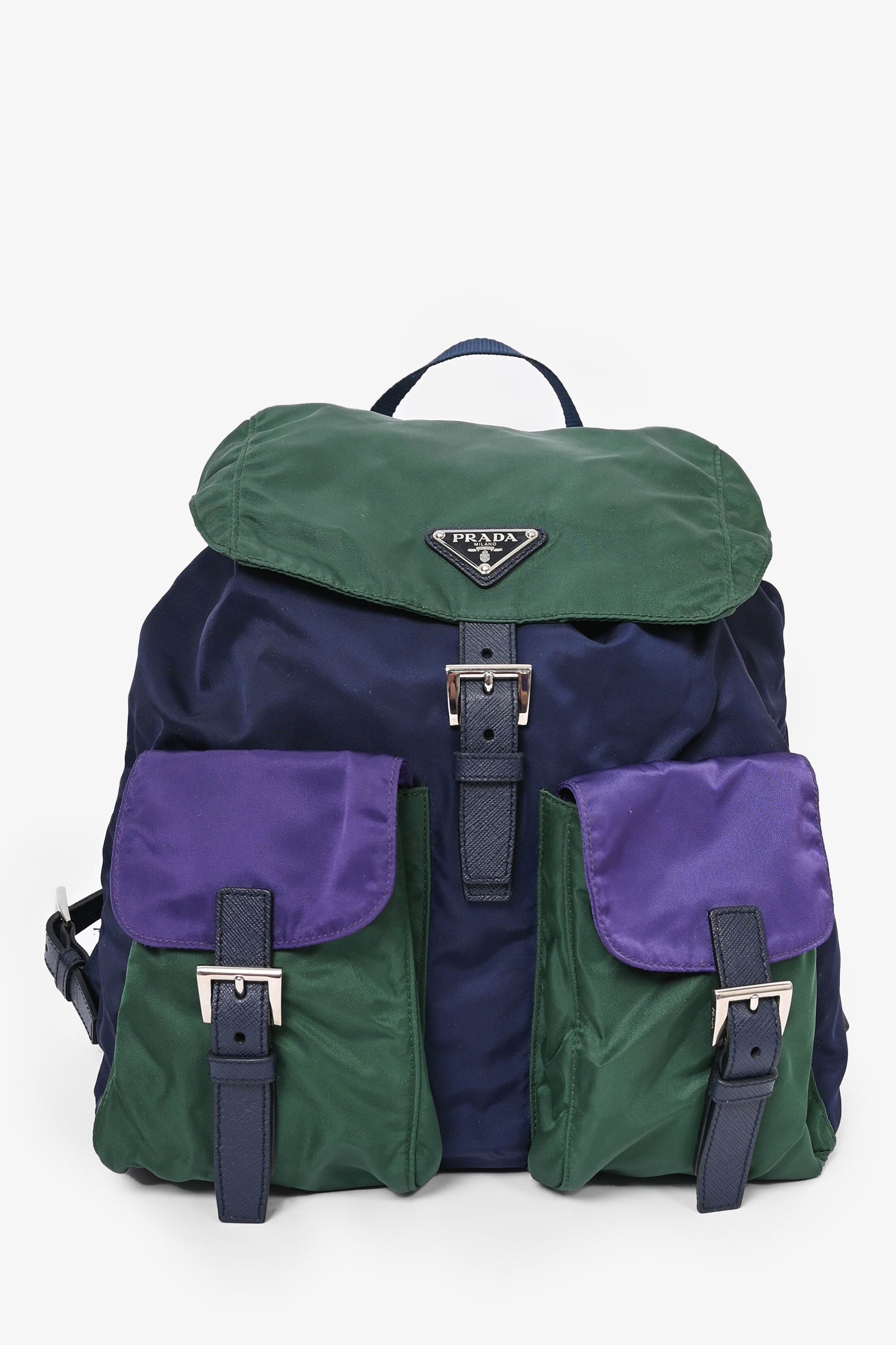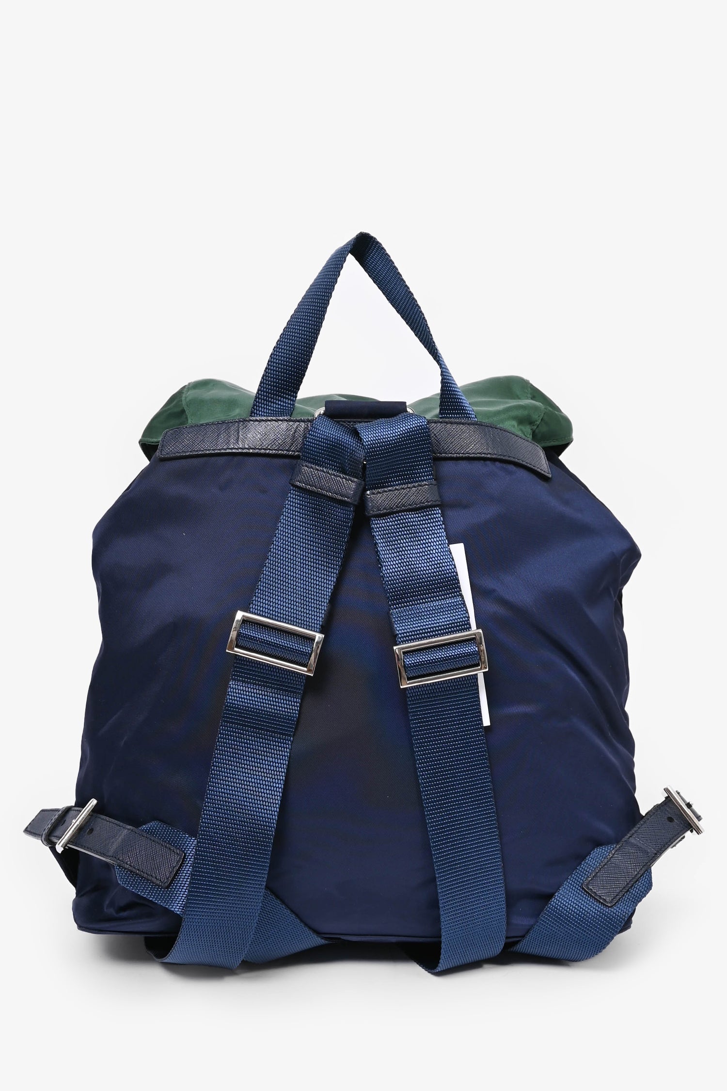Refresh availabilityPrada Green/Navy Nylon/Saffiano Leather Trim Backpack. Tonal stitching. Silver-tone hardware. Leather trimming. 2 shoulder straps. 2 front pockets. Adjustable pull tab. Lined interior with zipped compartment. Fold-over flap with strap closure.