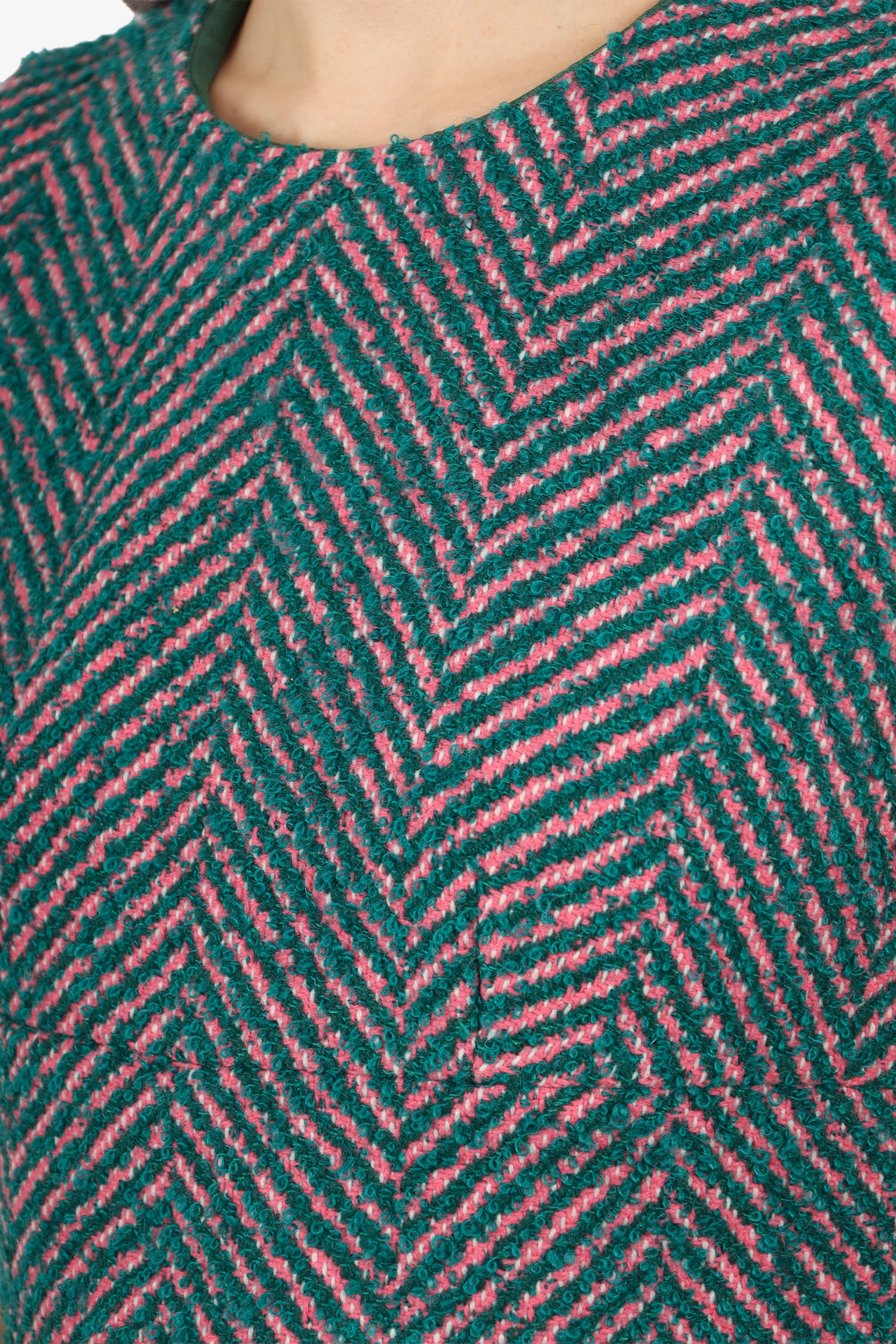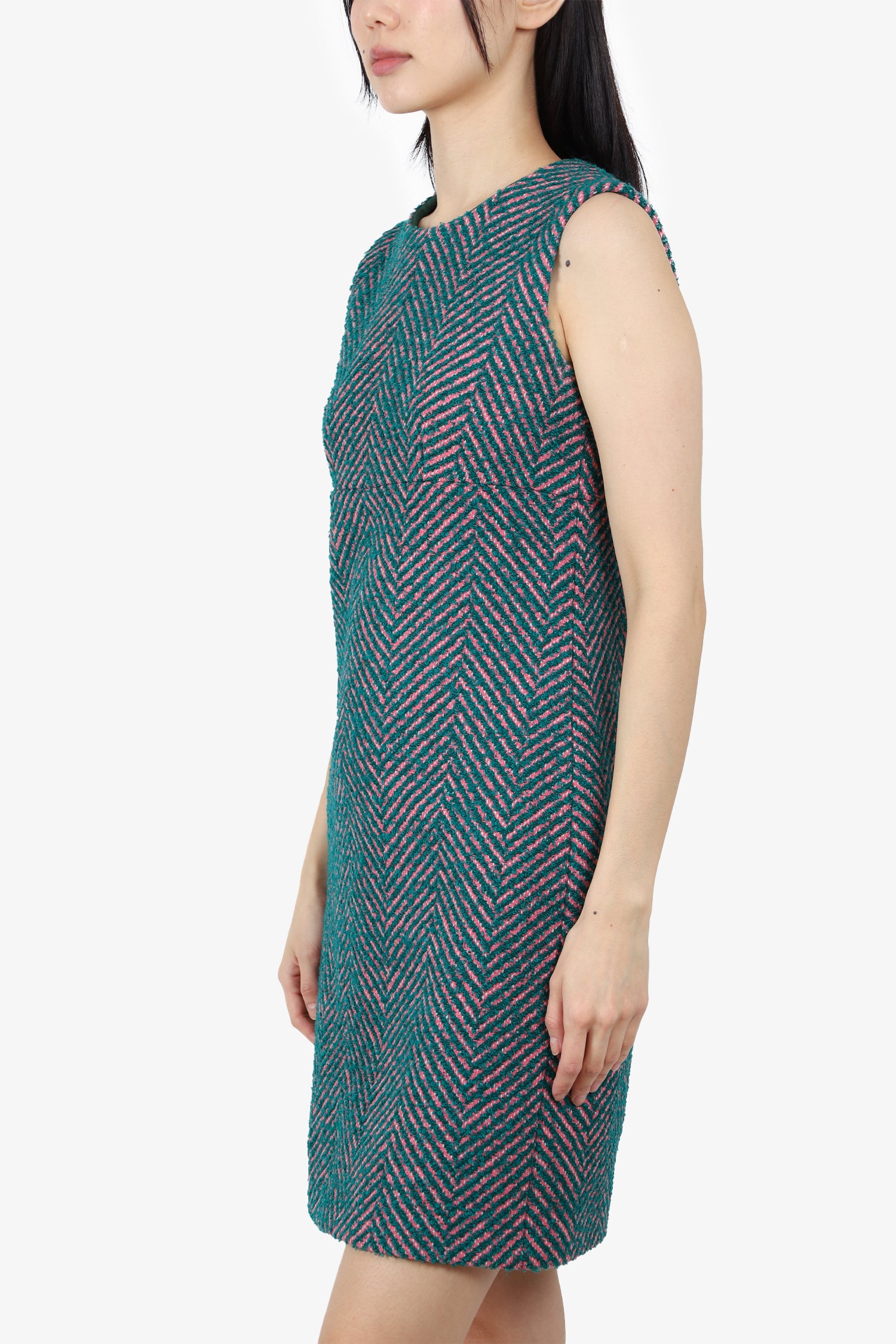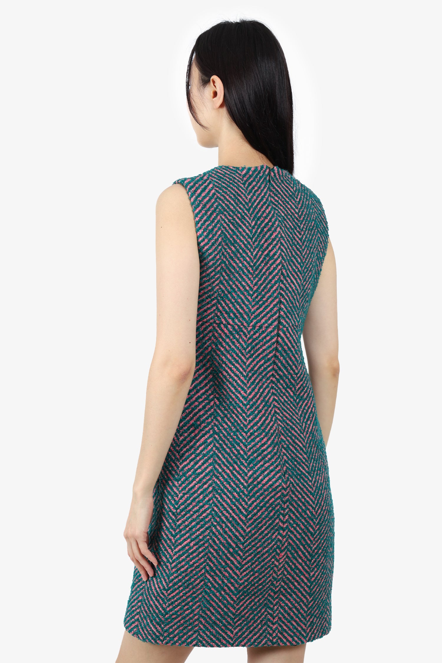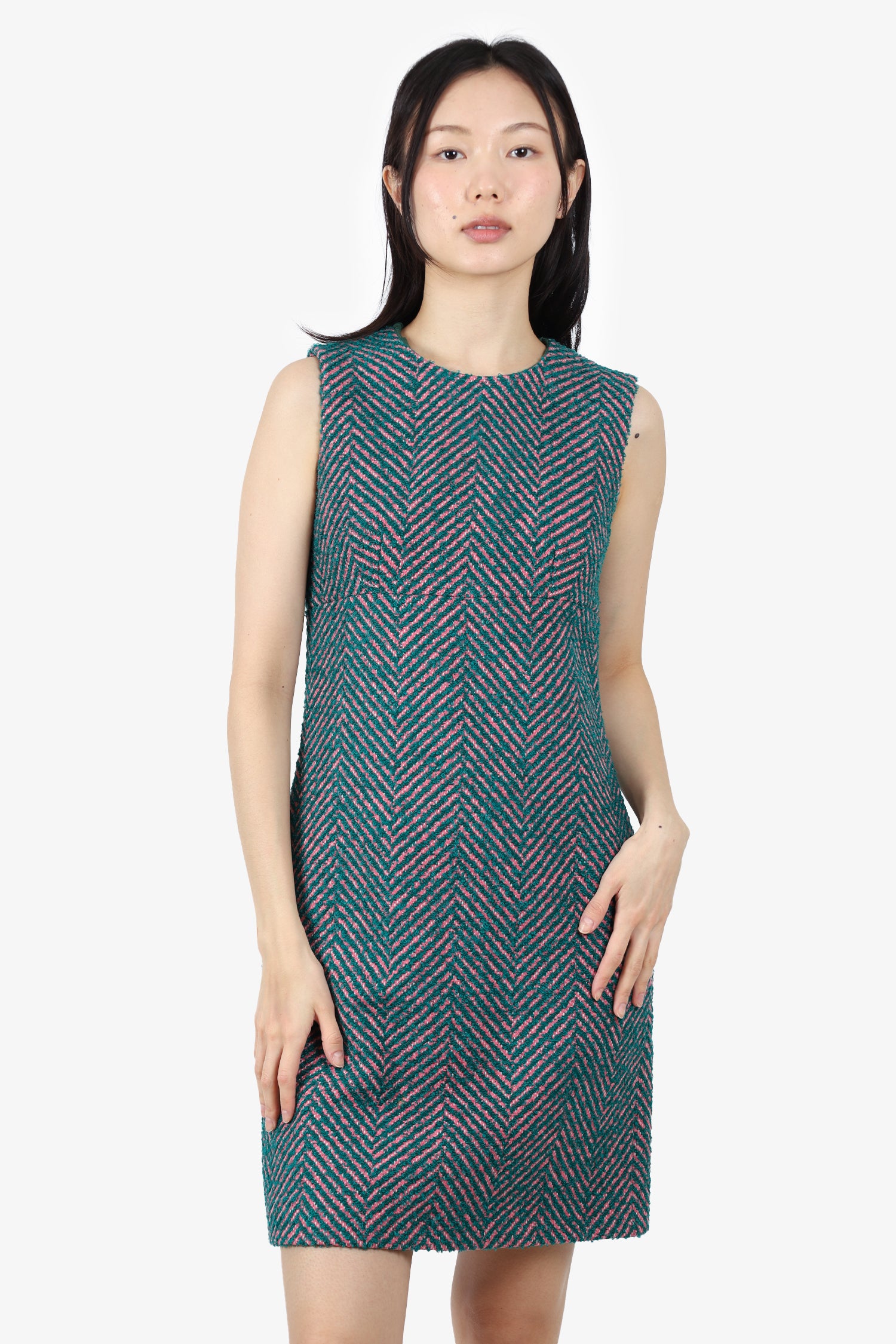 Refresh availabilityPrada Green/Pink Wool Tweed Chevron Sleeveless Dress. Round neckline. Back zipper closure. Lined. Tonal stitching.