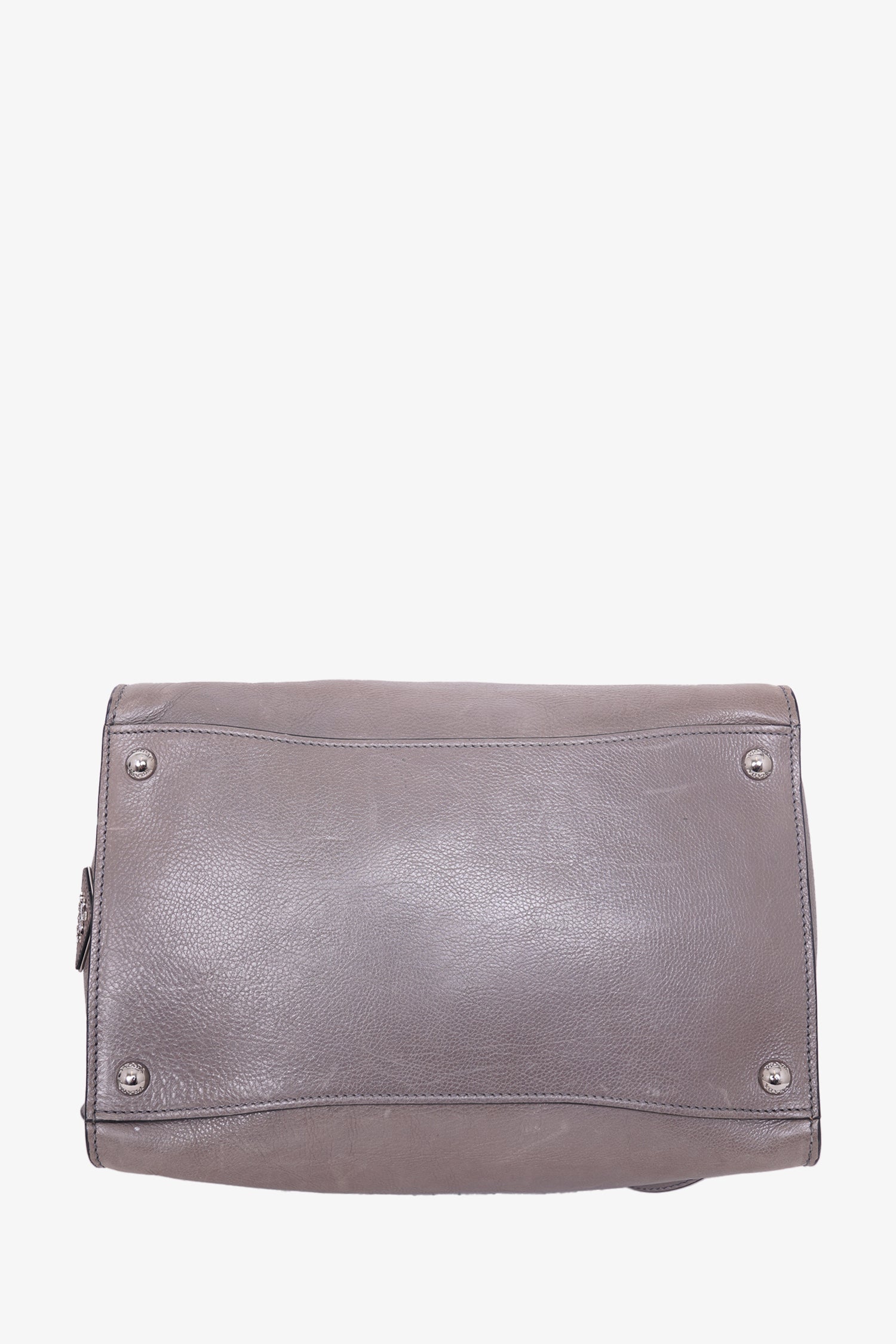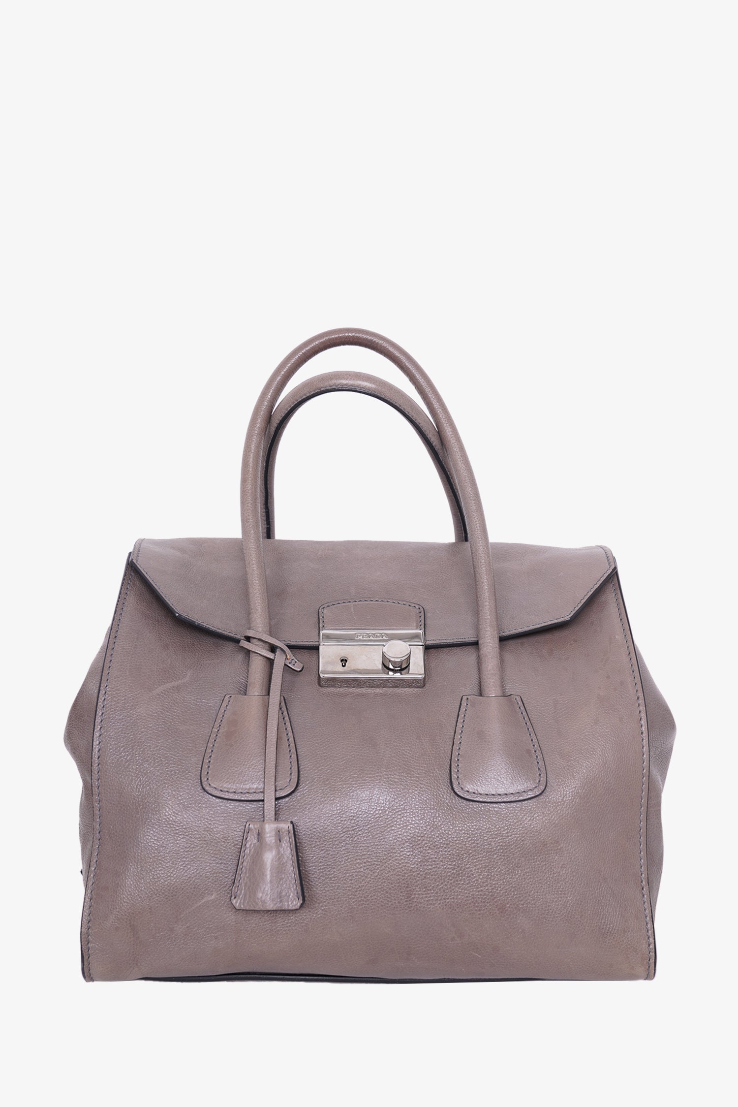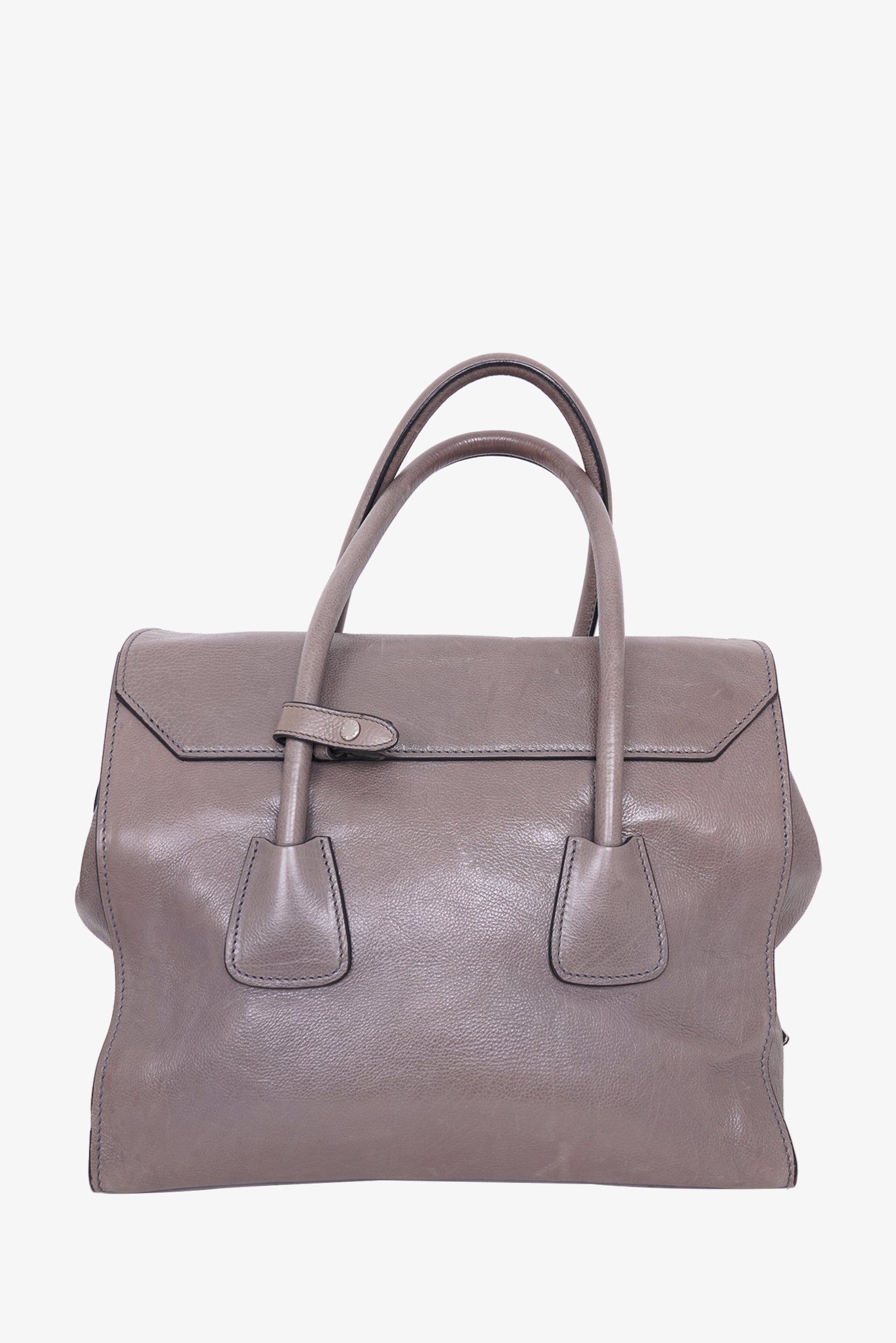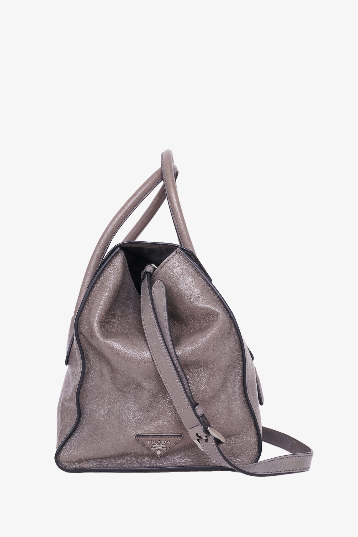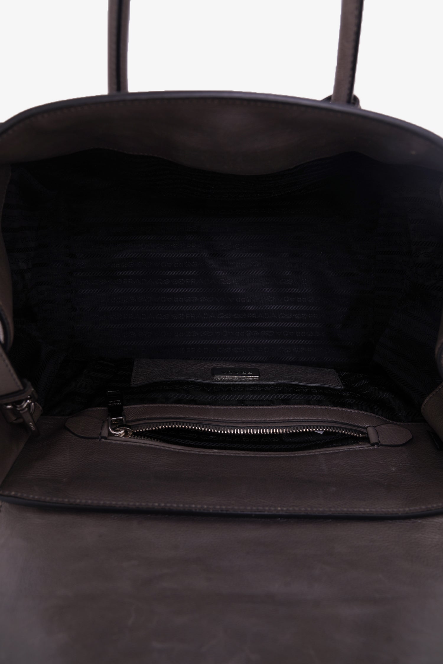 Refresh availabilityPrada Grey Lace Calf Sound Tote. Twin top handles. Adjustable and removable shoulder strap. Front flap lock closure with hanging keychain. Interior lining. Singular interior zip-up pocket. Silver-toned hardware. Tonal stitching.