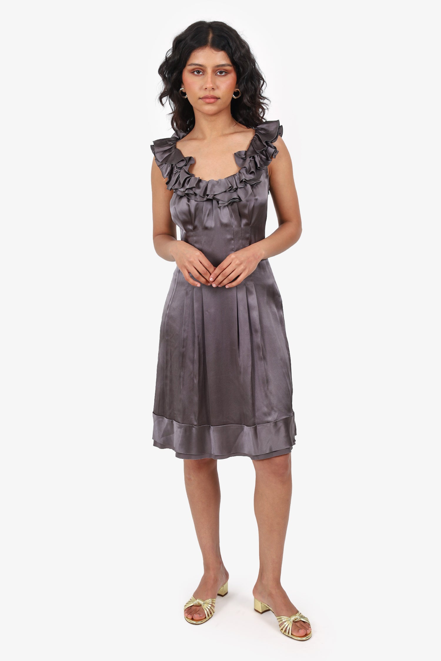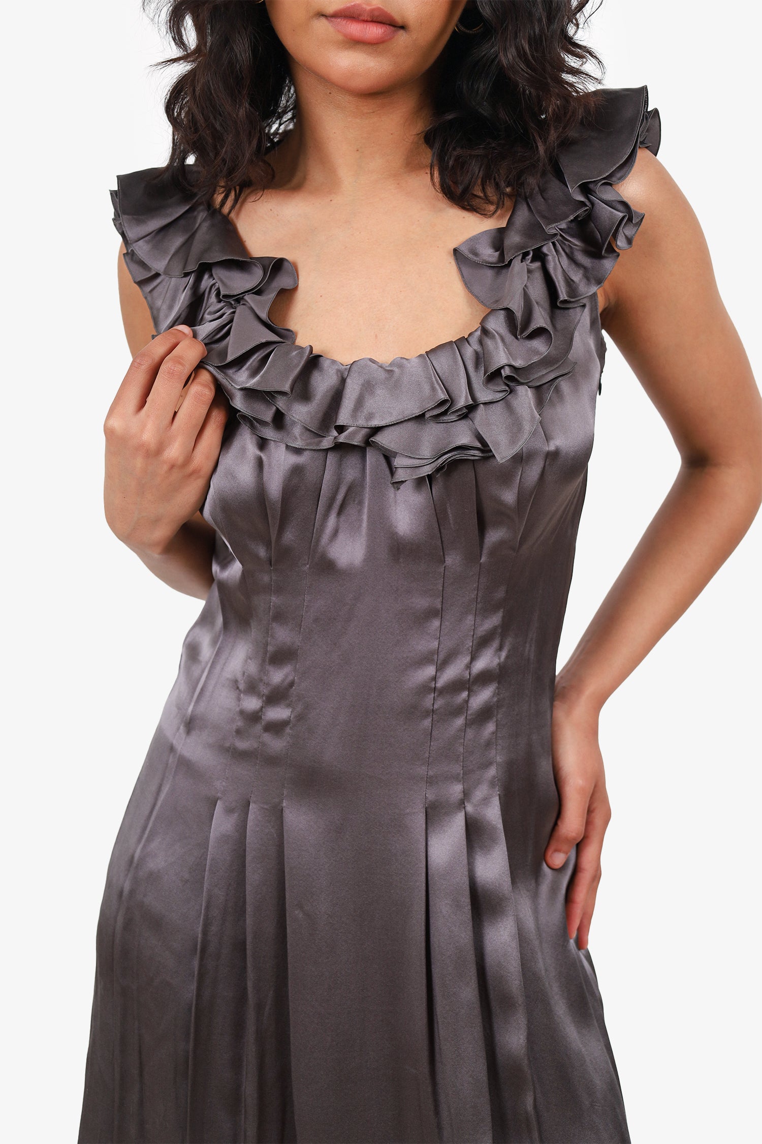 Refresh availabilityPrada Grey Silk Ruffle Detail Knee Length Dress. Slip-on. Boat neckline. Side zip closure. Tonal stitching.