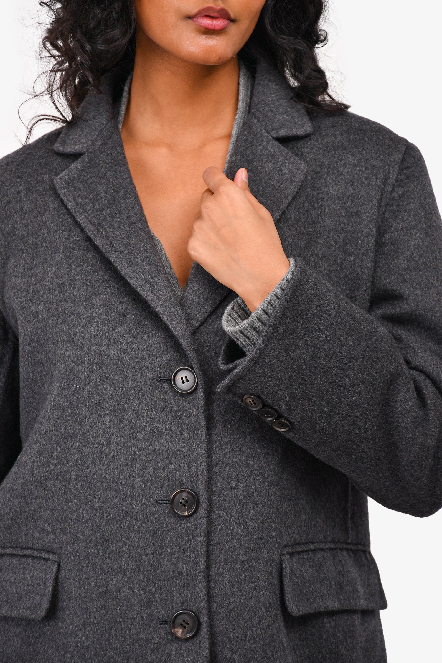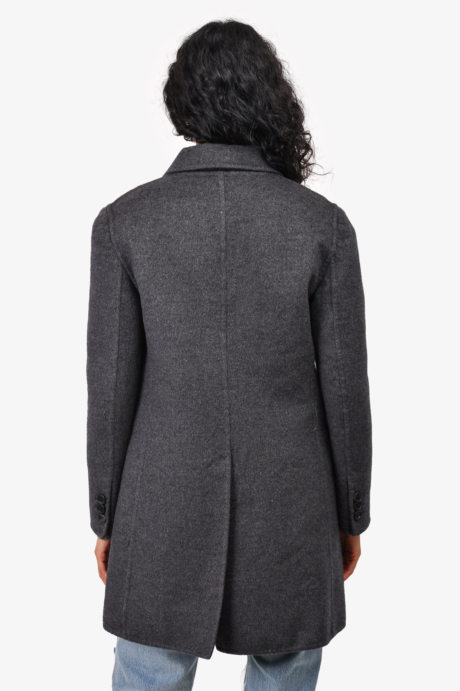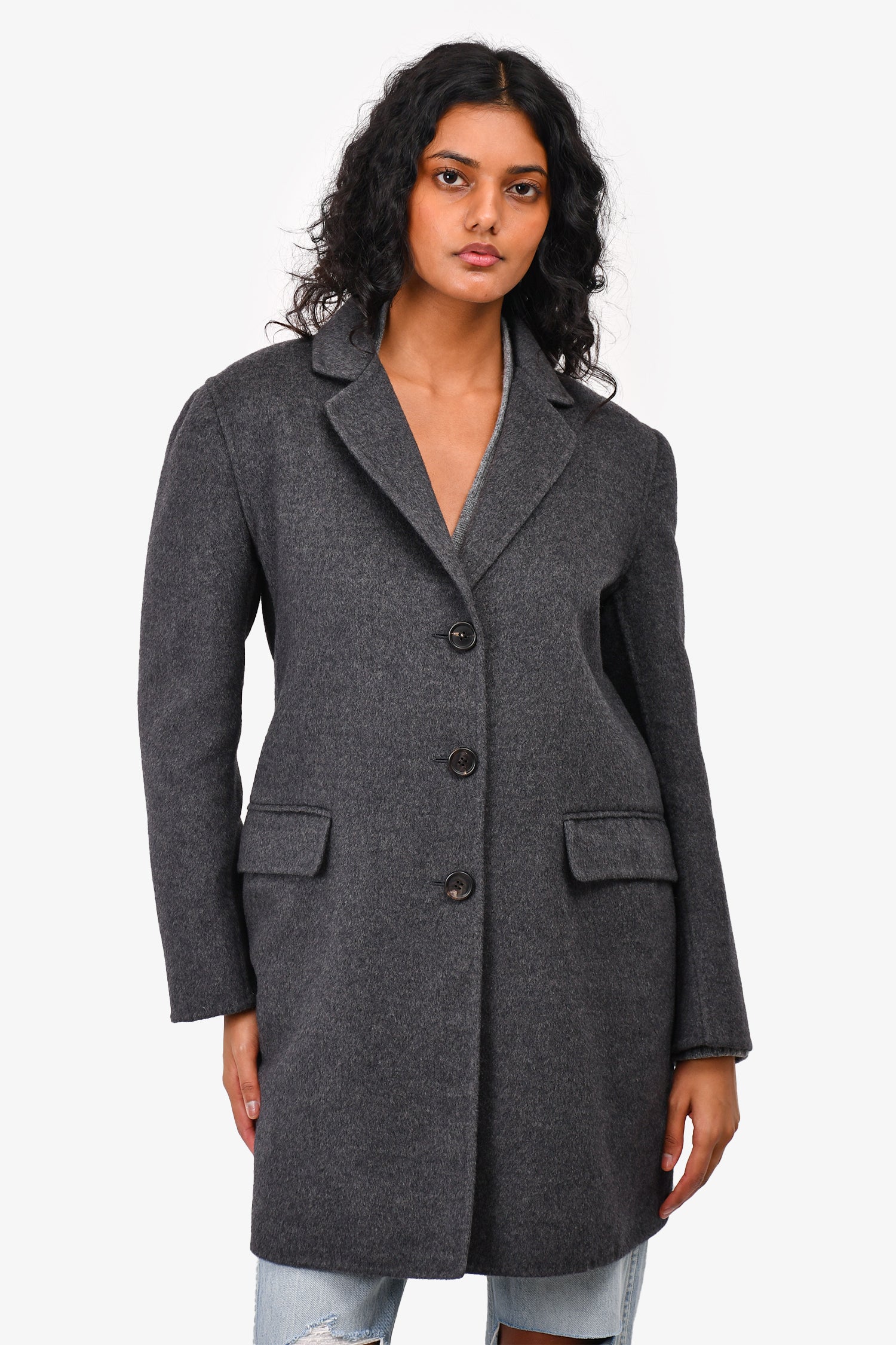 Refresh availabilityPrada Grey Wool/Cashmere Blend Coat. Front button up closure. Front flip pockets. Unlined. Tonal stitching.