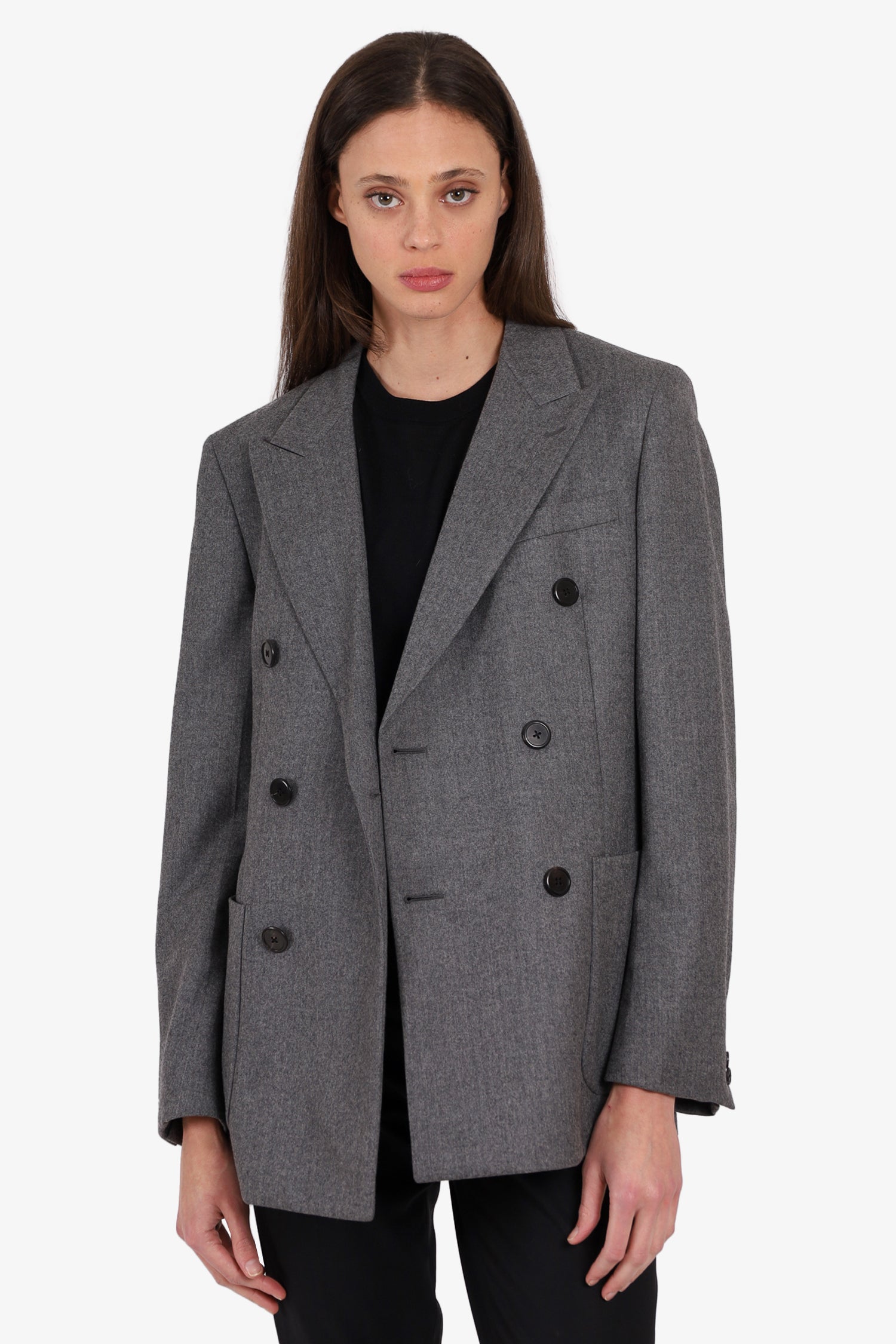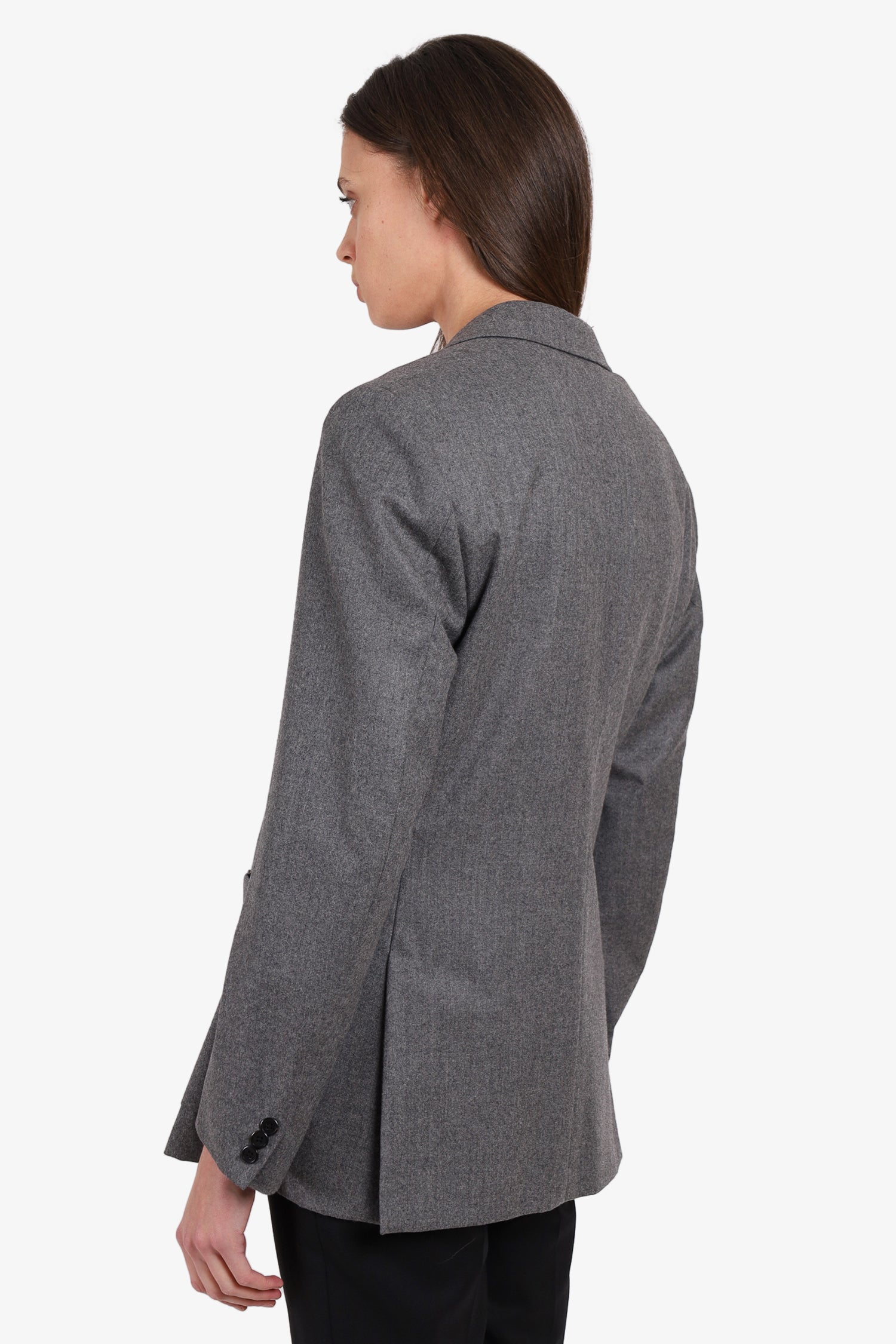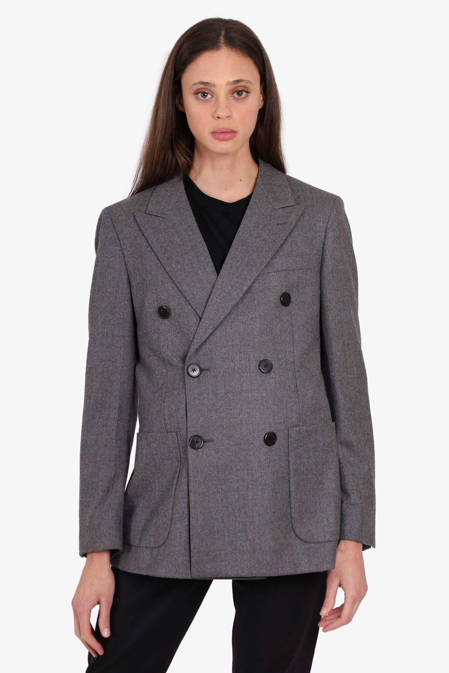 Refresh availabilityPrada Grey Wool Double Breasted Blazer. Front open pockets. Button-up closure. Open front pockets.