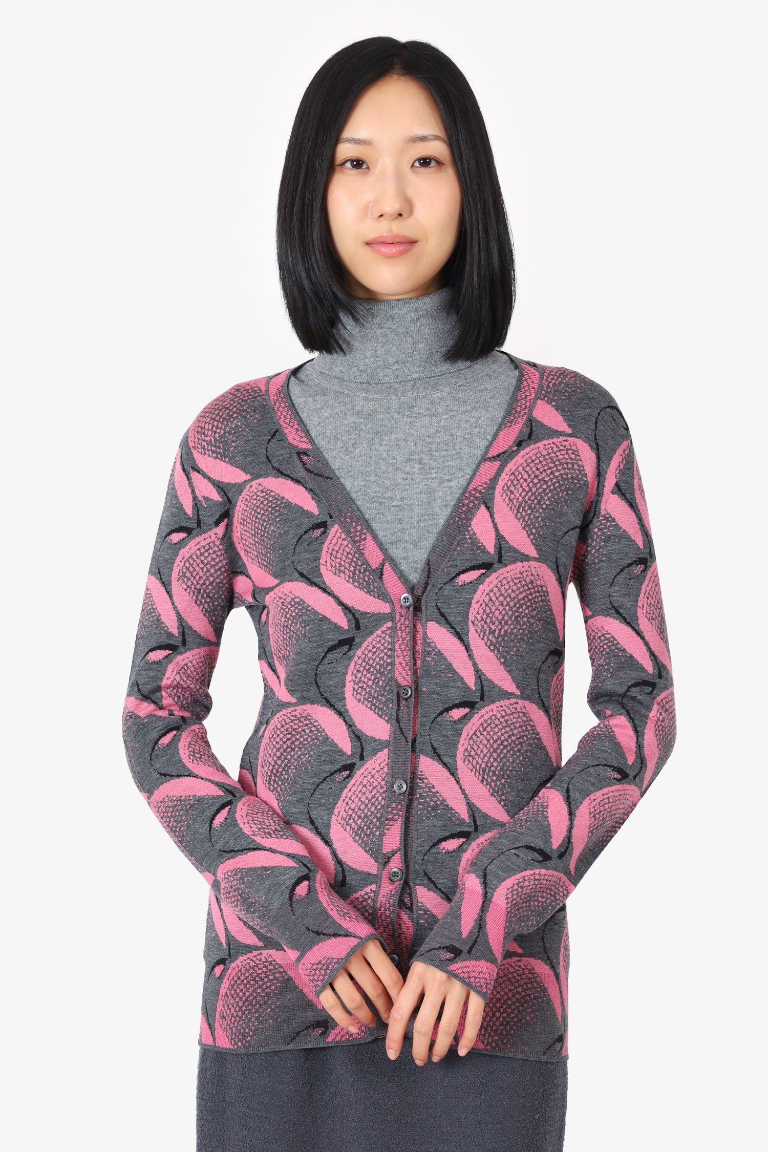 Refresh availabilityPrada Grey/Pink Wool Knit Printed Cardigan. Pull-on. V-neckline. Front button-up closure. Tonal stitching.