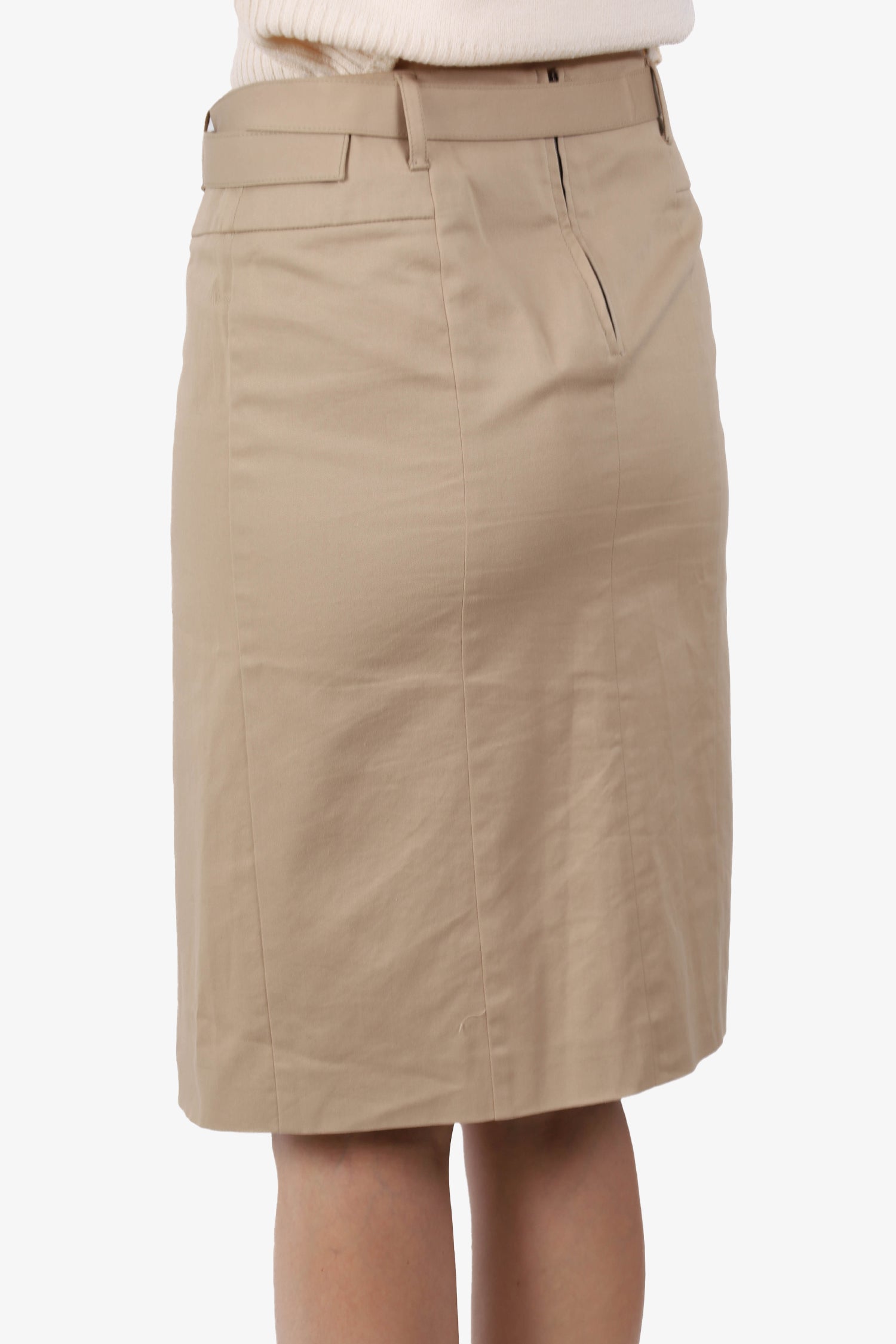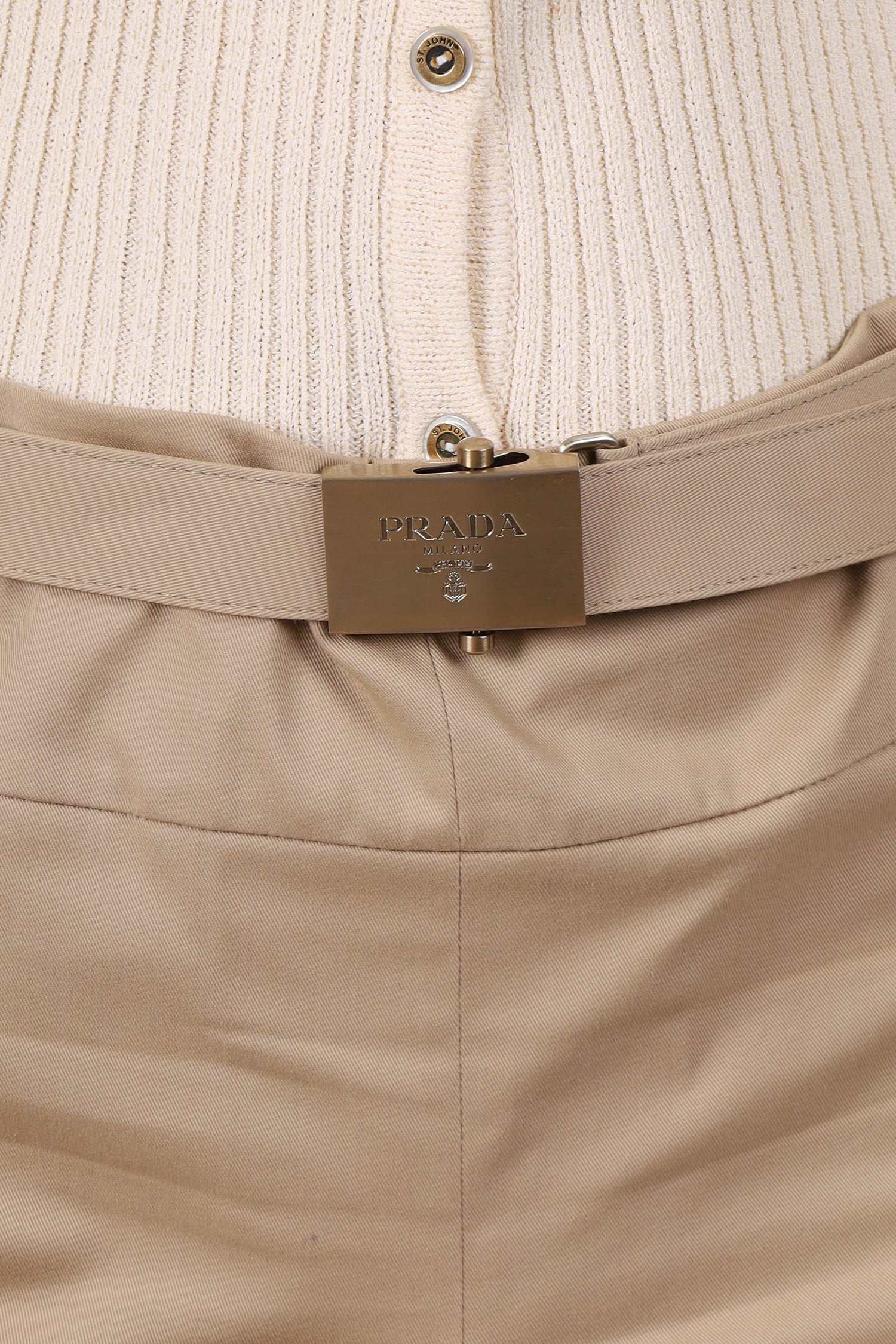 Refresh availabilityPrada Khaki Cotton Belted Midi Skirt. Back zipper closure. Belted waist with buckle closure. Gold-toned hardware. Tonal stitching.