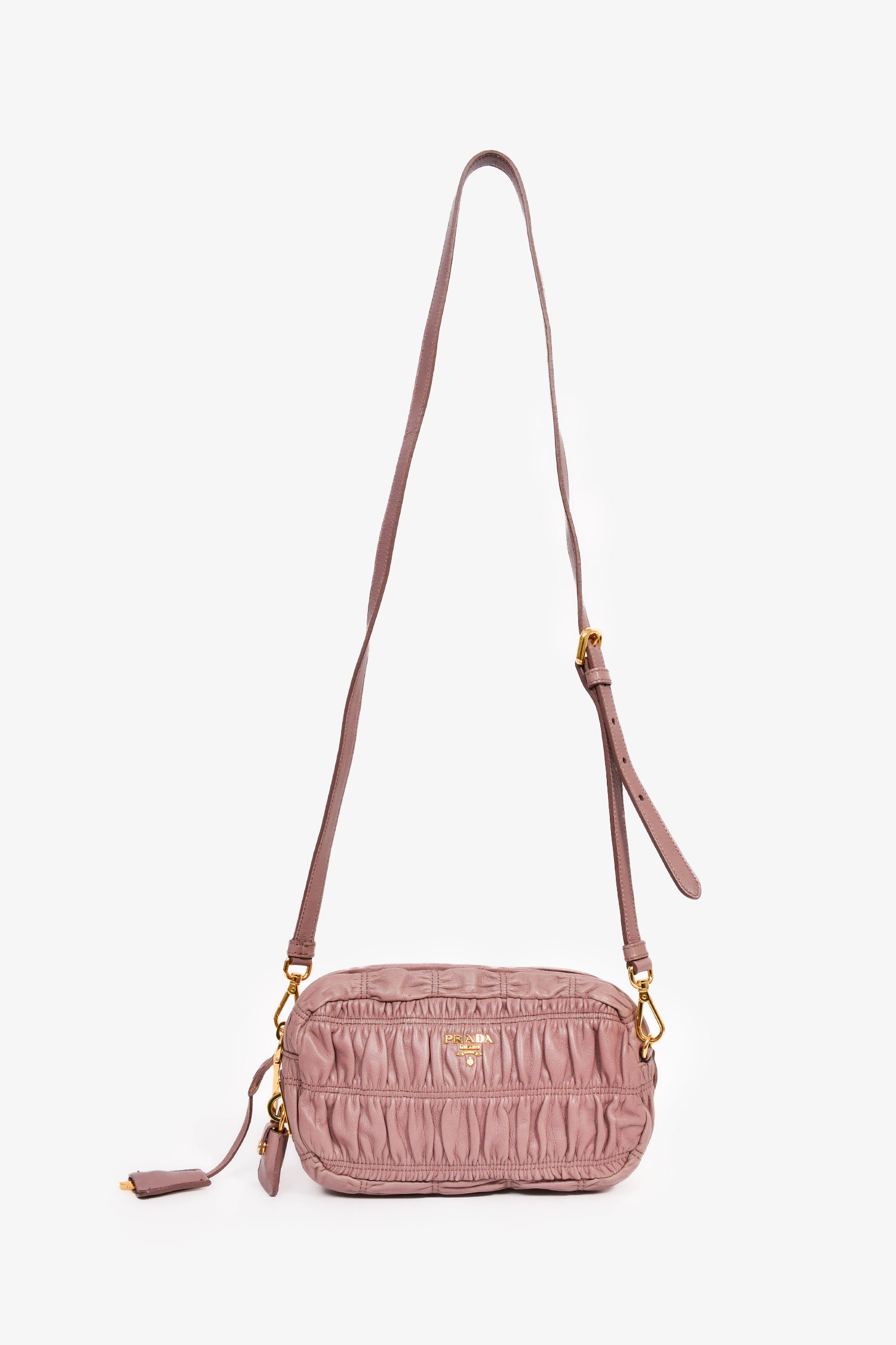 Refresh availabilityPrada Mauve Nappa Gaufre Leather Crossbody Bag. Top zip closure. Tonal logo'd textile interior lining. Two interior wall pockets; one slip and one with zip closure. Detachable and adjustable strap. Two detachable clochettes; with two keys and one lock. Gold-tone hardware.
