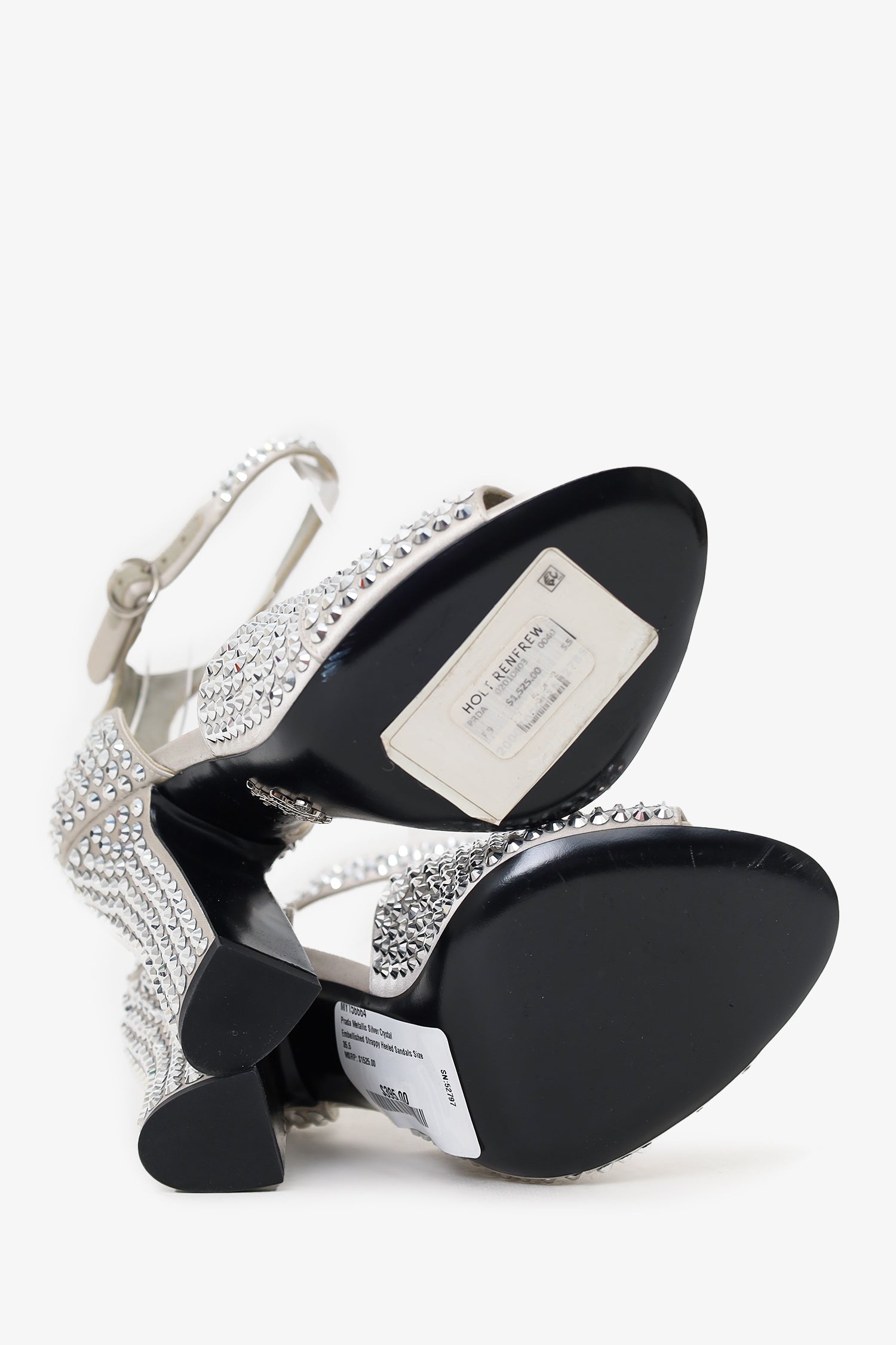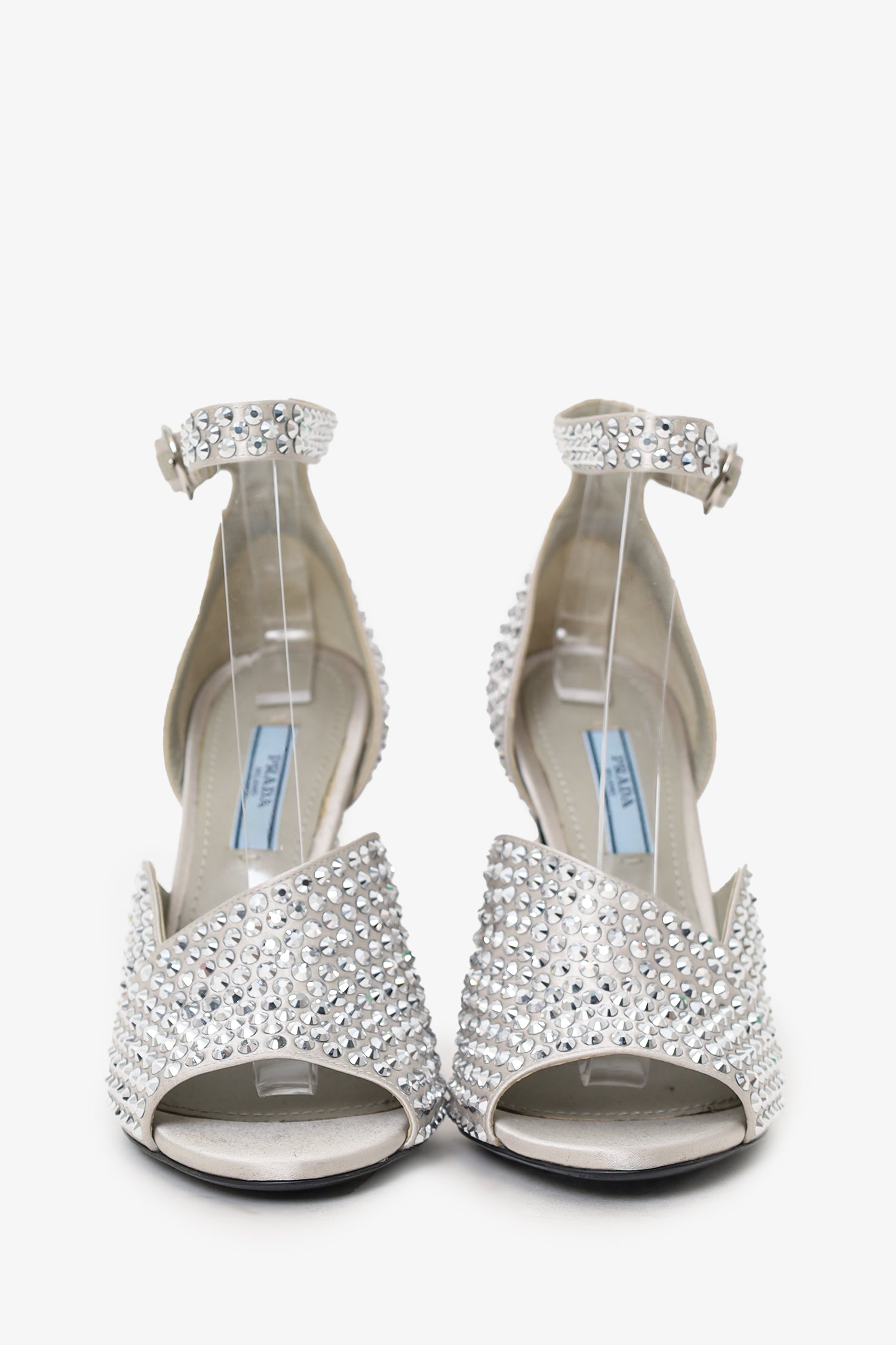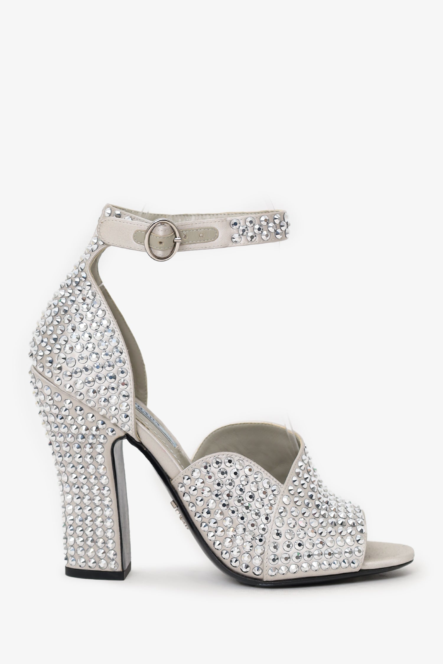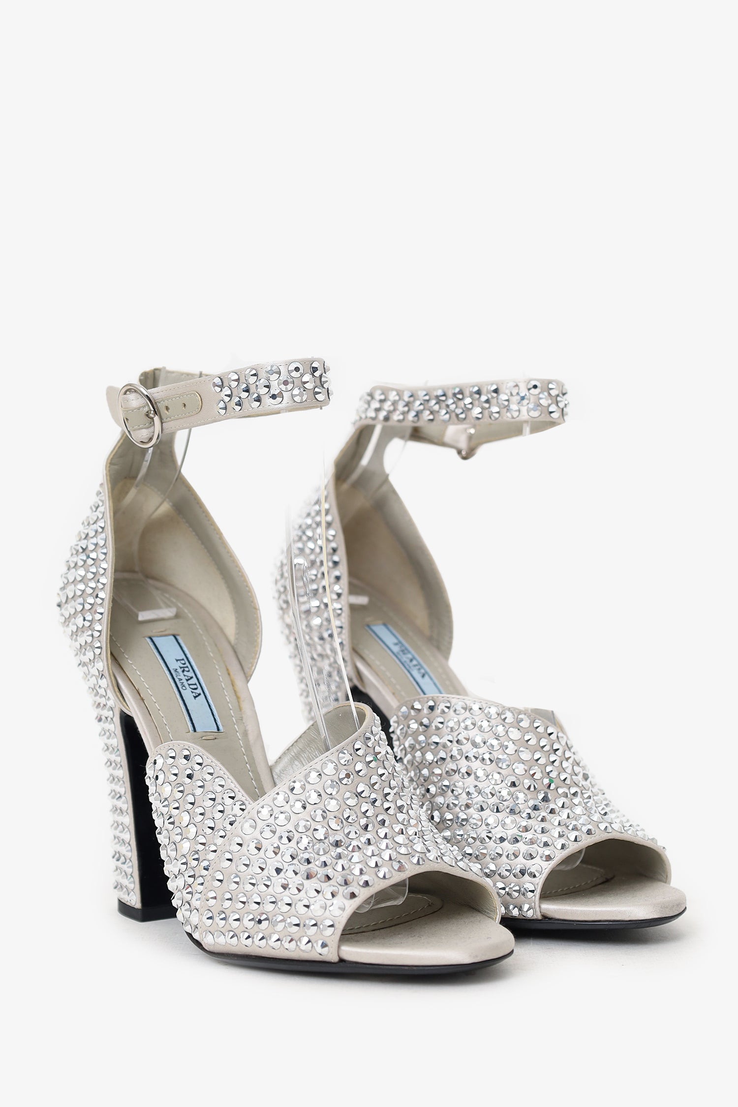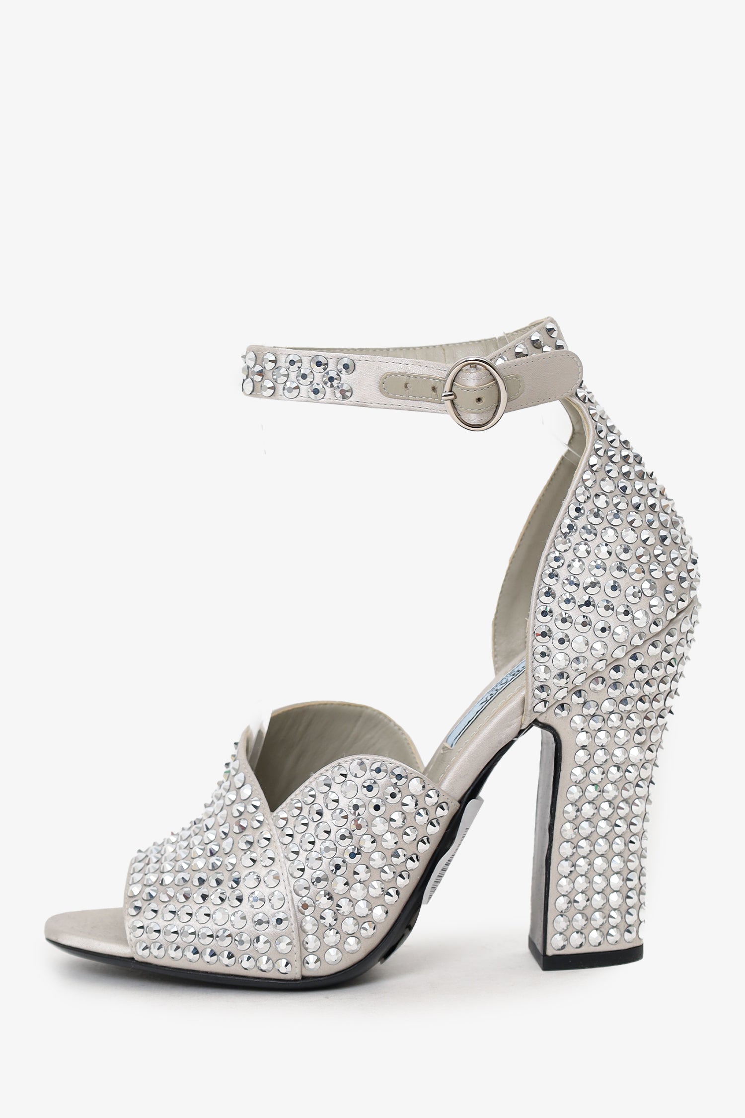 Refresh availabilityPrada Metallic Silver Crystal Embellished Strappy Heeled Sandals. Slip-on. Open rounded-point toe. Adjustable ankle strap with buckle closure. Silver-tone hardware. Tonal stitching.