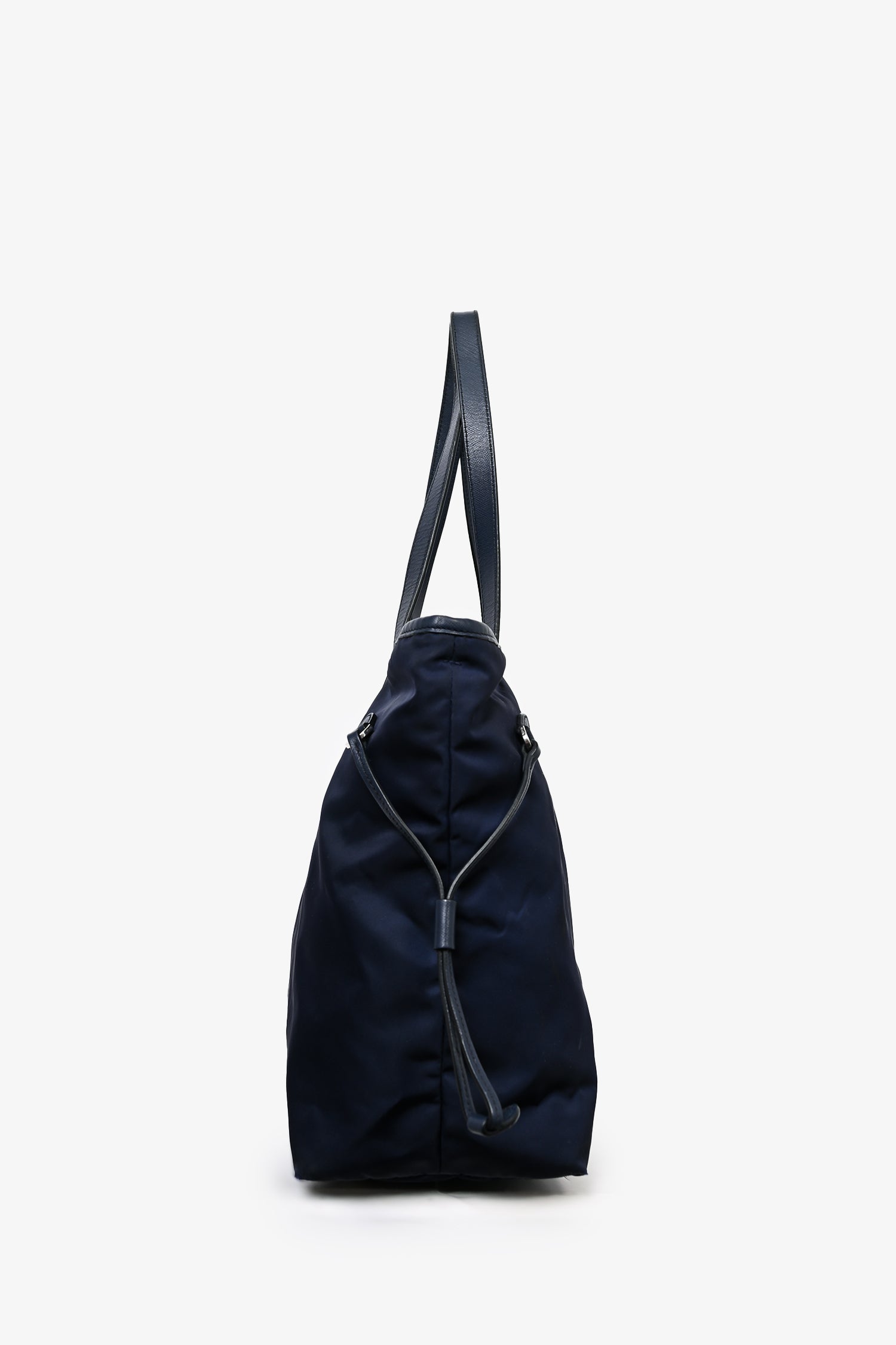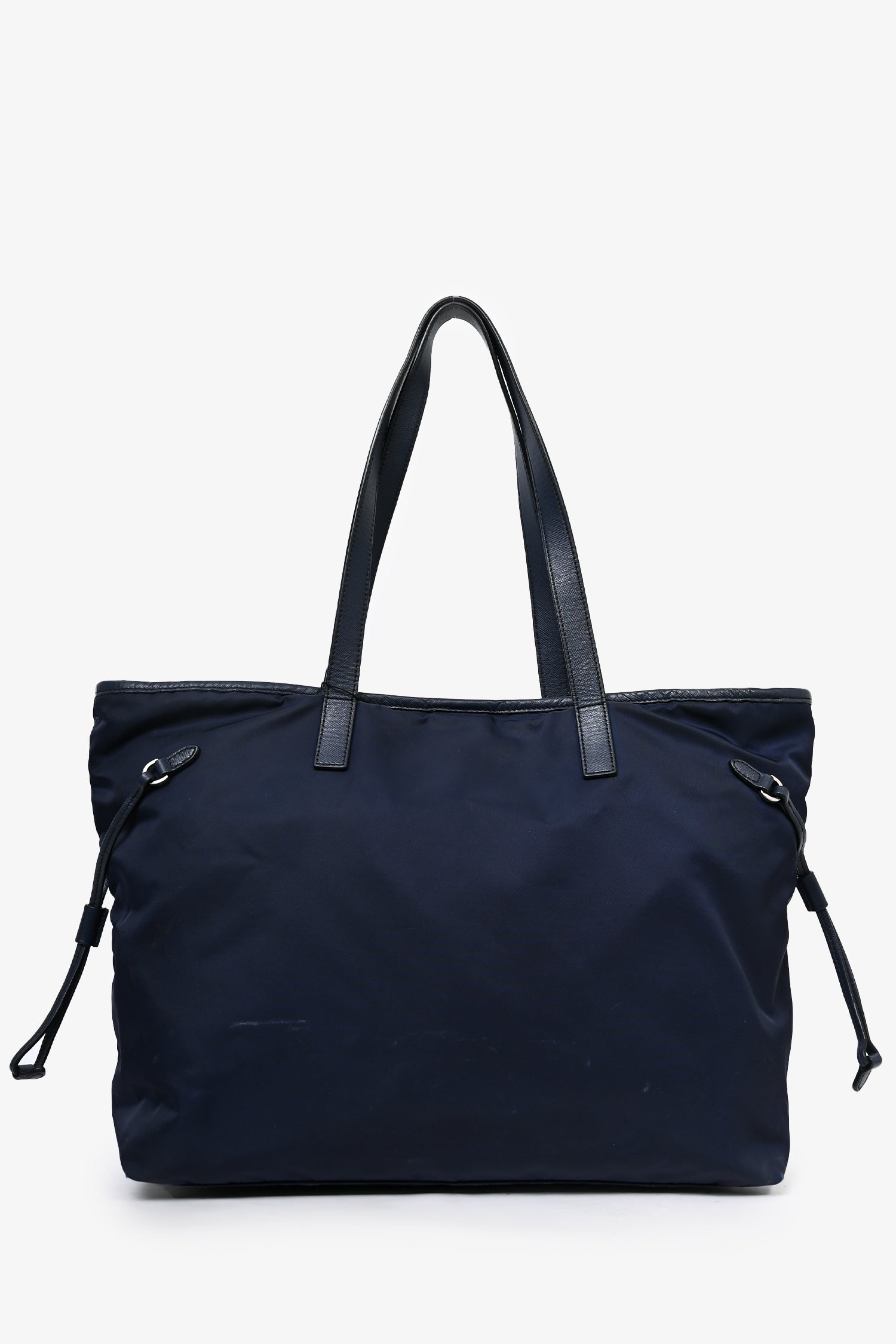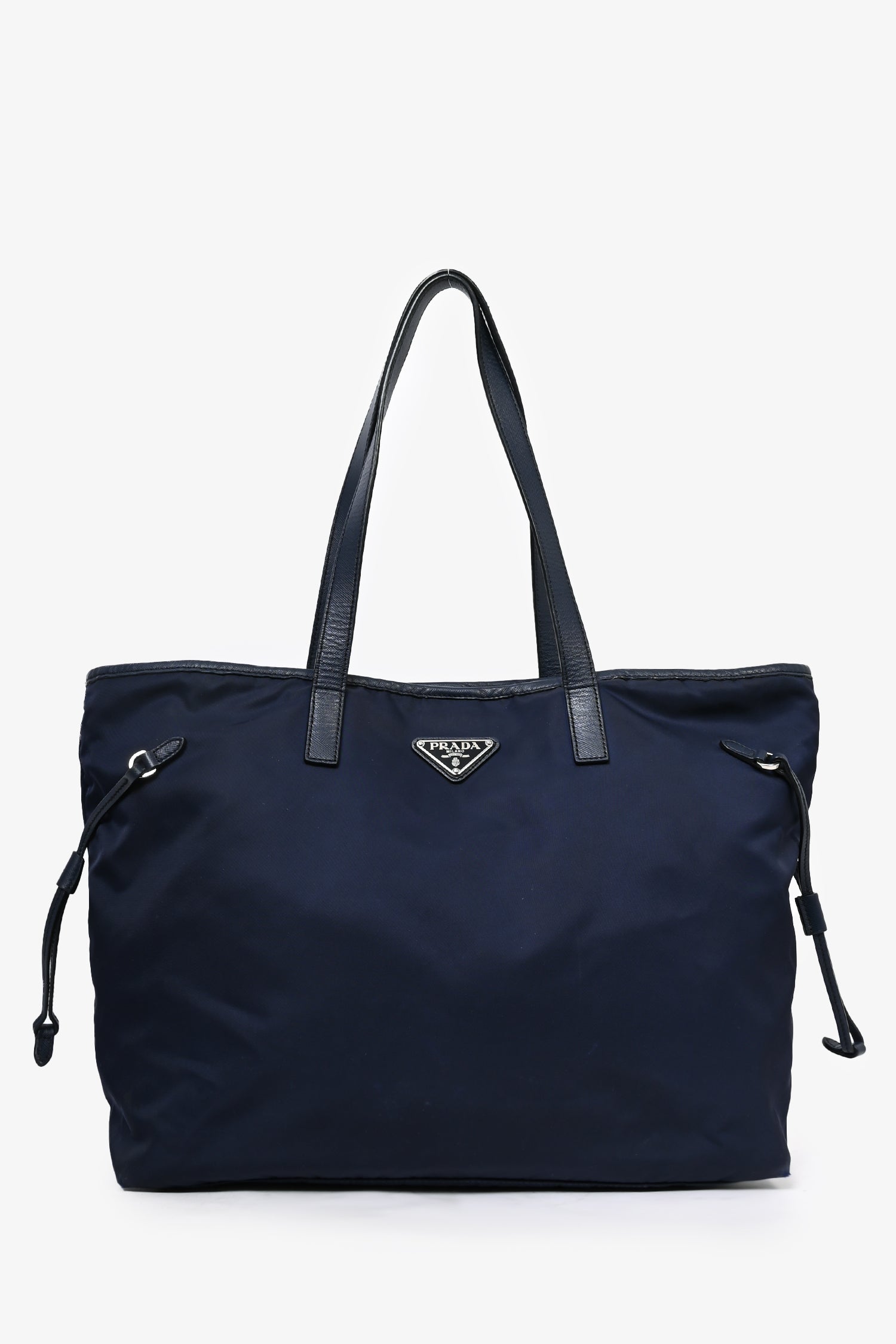 Refresh availabilityPrada Navy Blue Nylon Triangle Tote. Dual handles. Top magnetic closure. Open compartment. A slip pocket and wall pocket with zipper closure. Monogram lining. Silver-tone hardware. Tonal stitching.