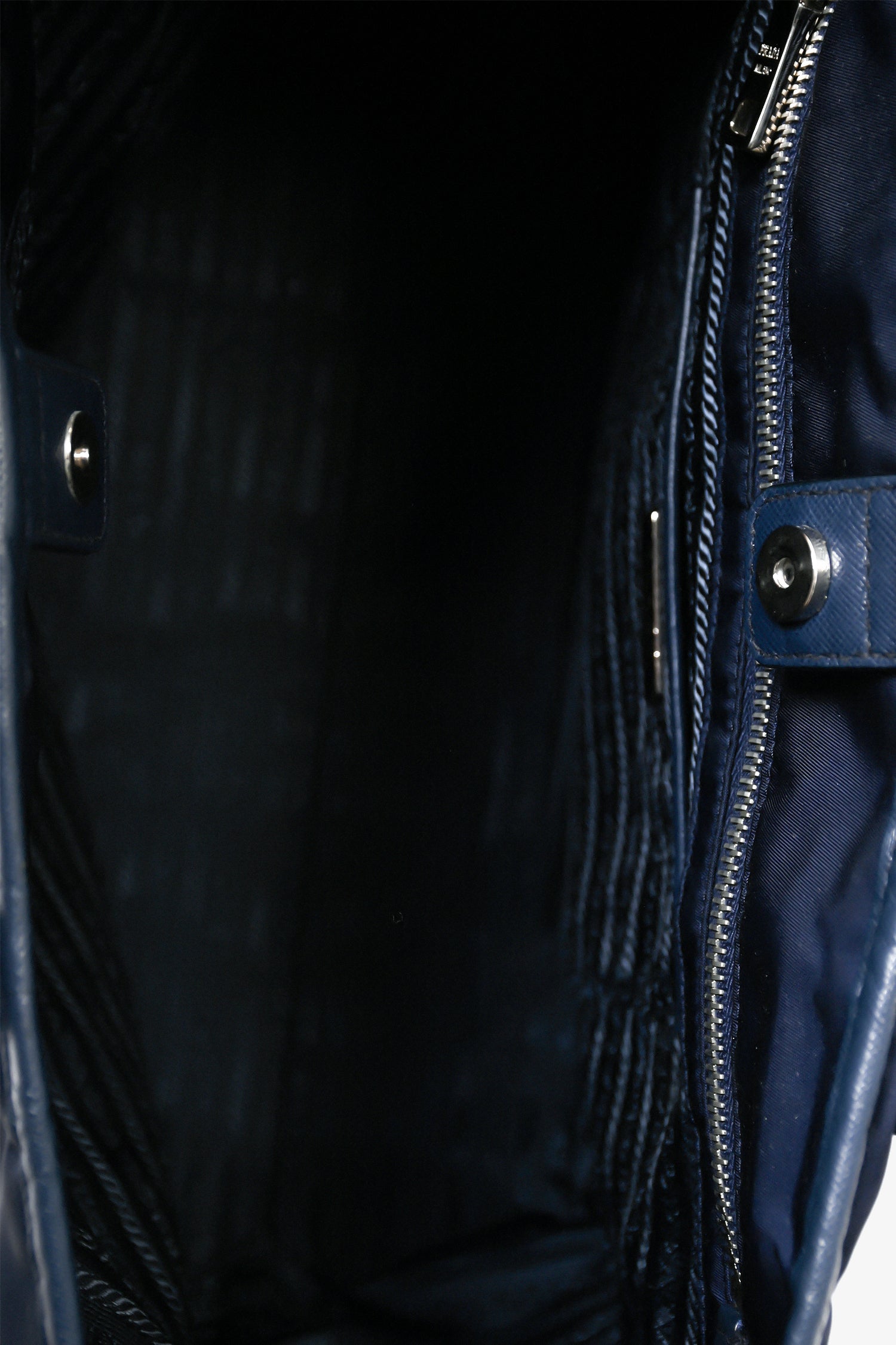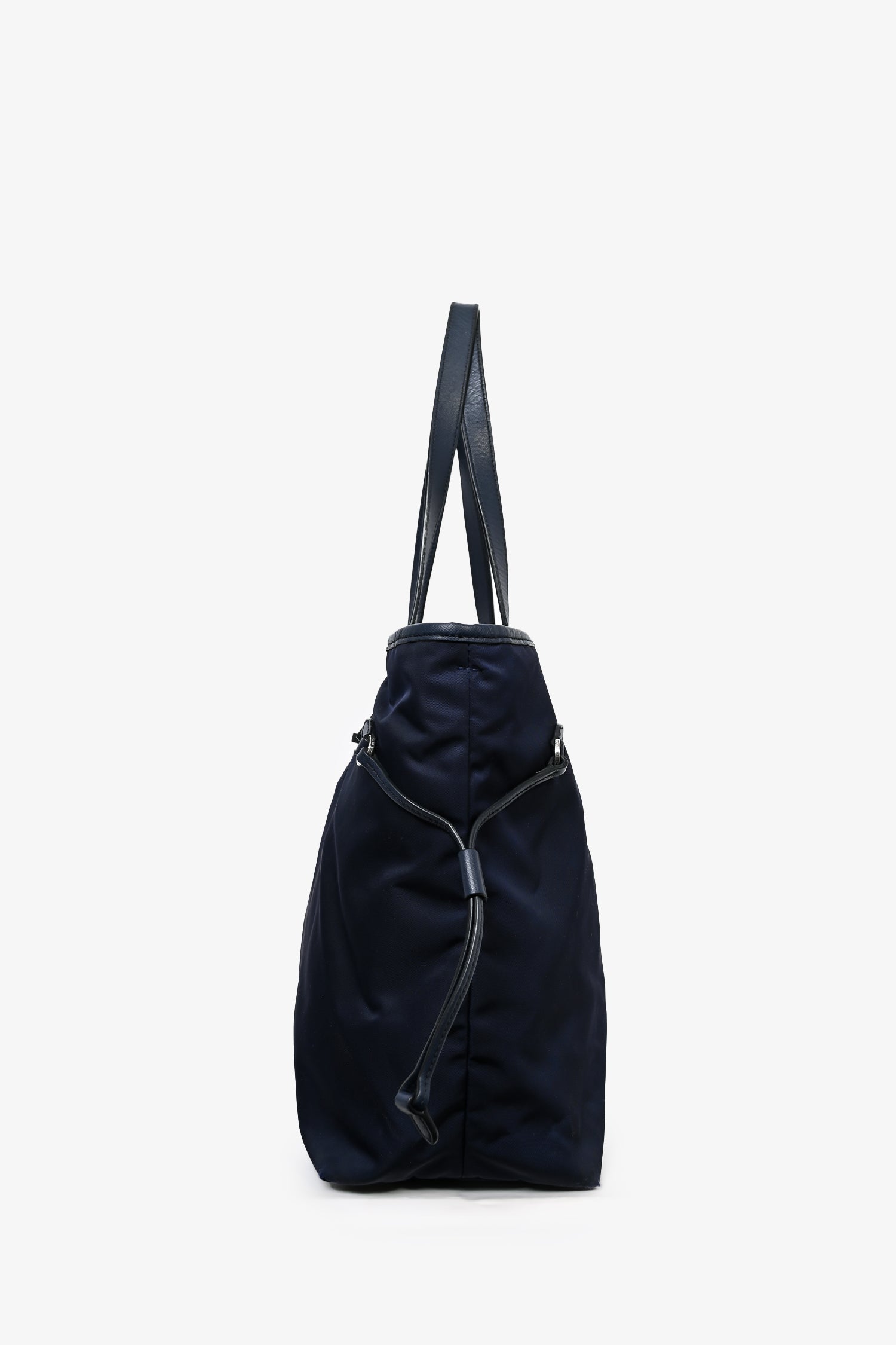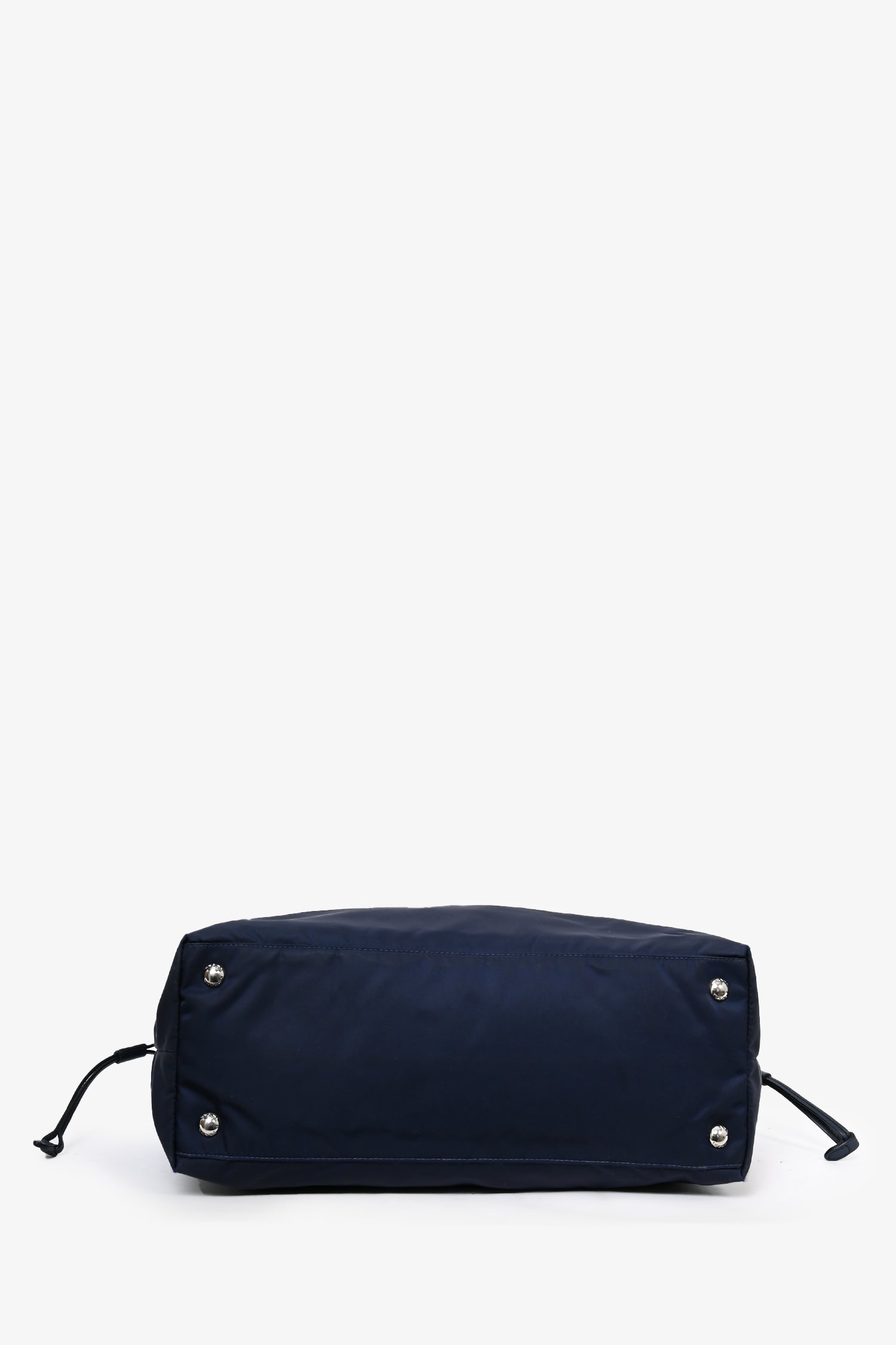 Refresh availabilityPrada Navy Blue Nylon Triangle Tote. Dual handles. Top magnetic closure. Open compartment. A slip pocket and wall pocket with zipper closure. Monogram lining. Silver-tone hardware. Tonal stitching.