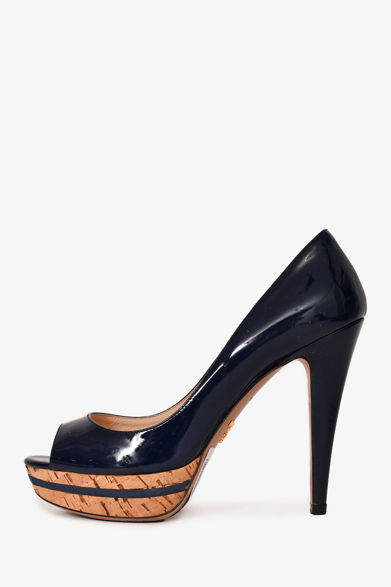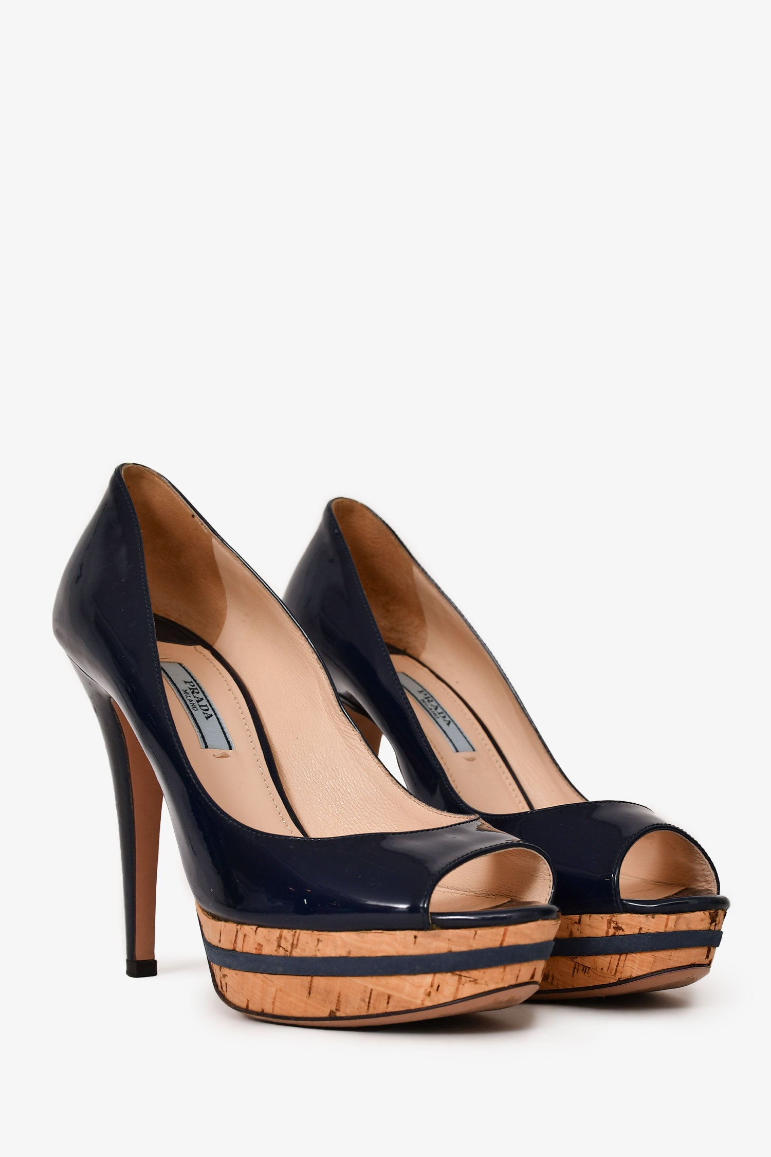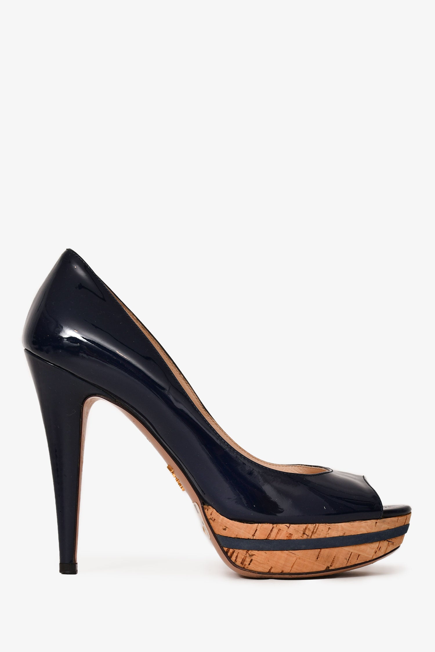 Refresh availabilityPrada Navy Patent Leather Peep Toe Heels. Slip-on. Round-toe. Cork detailing. Tonal stitching.