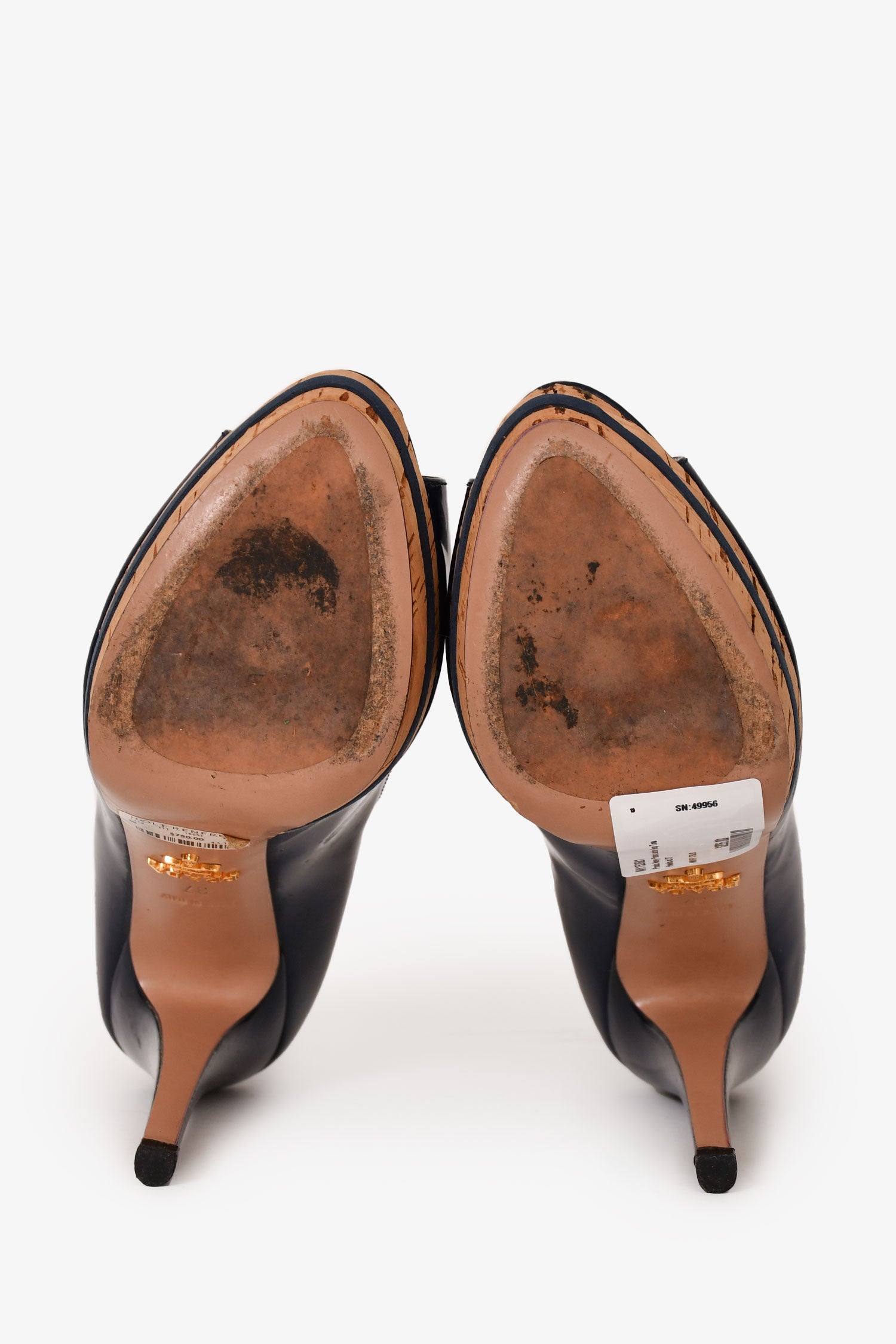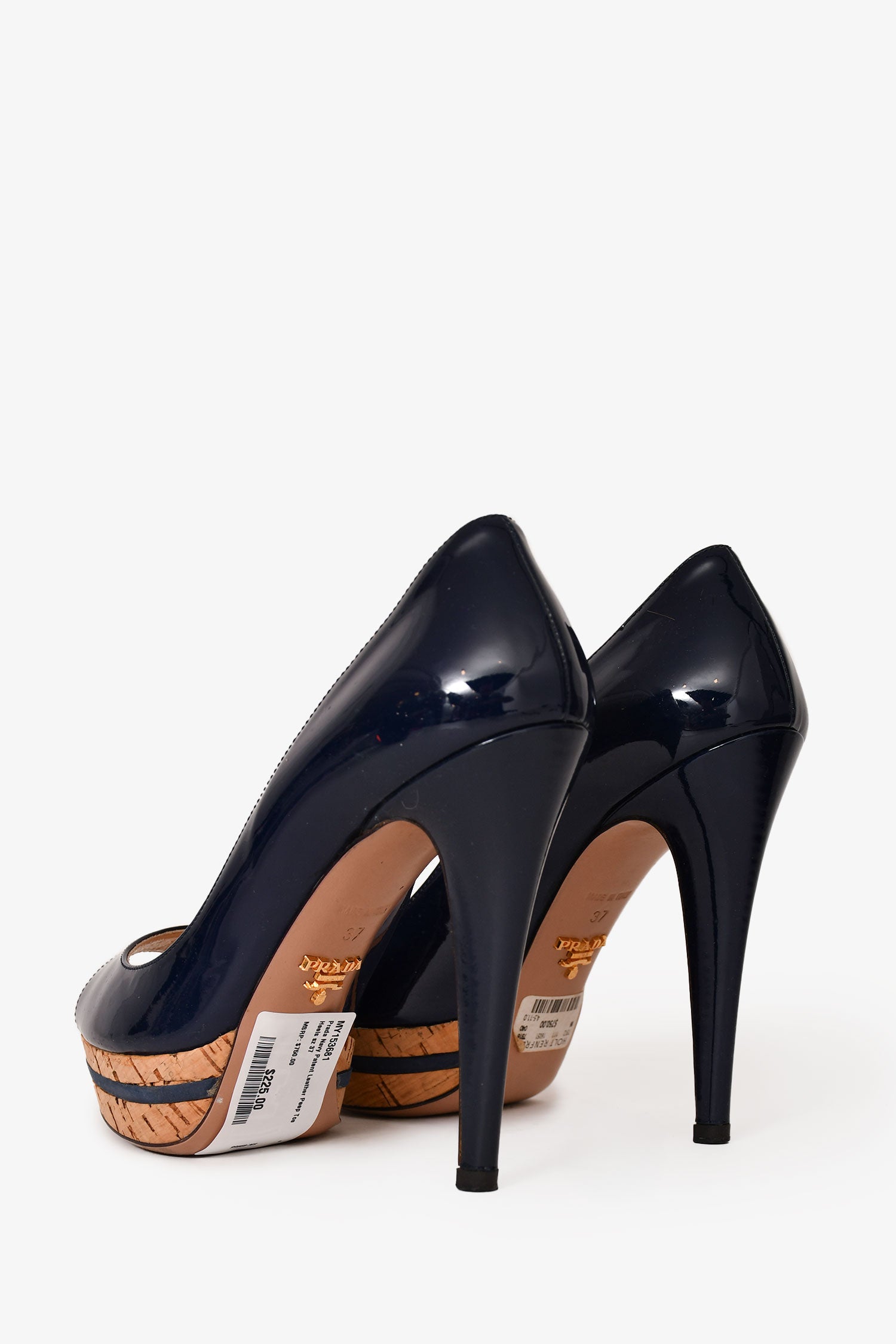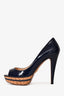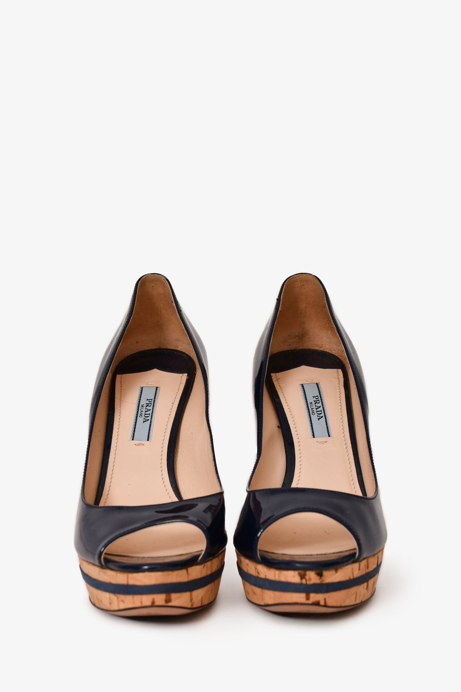 Refresh availabilityPrada Navy Patent Leather Peep Toe Heels. Slip-on. Round-toe. Cork detailing. Tonal stitching.