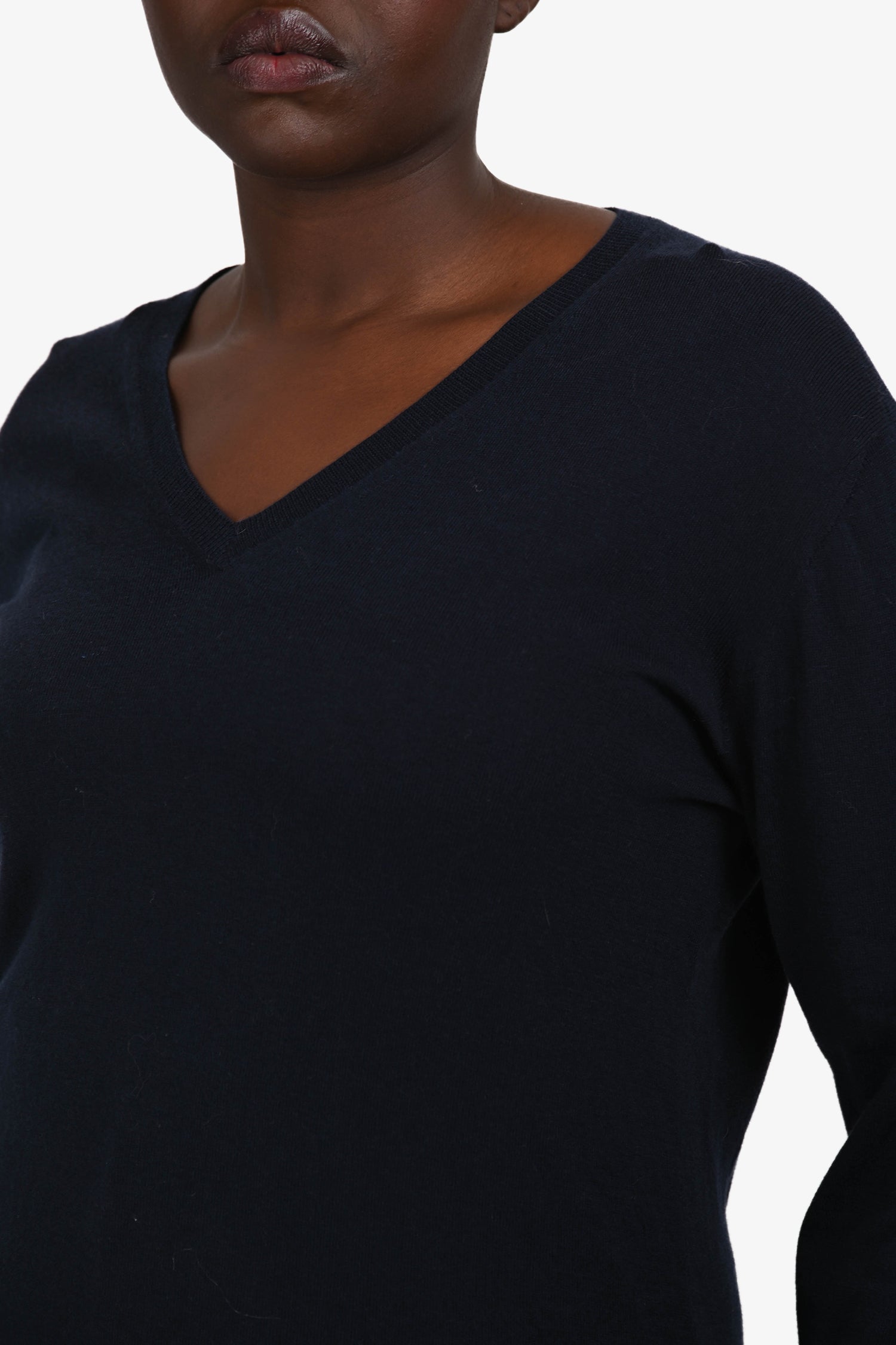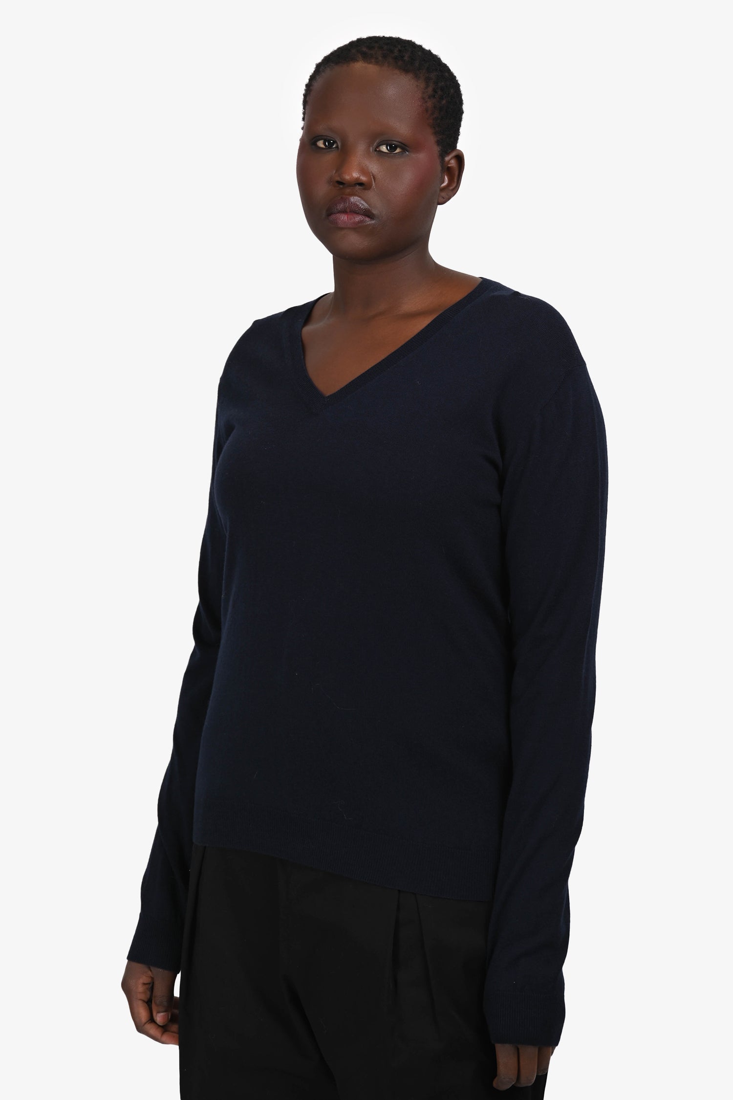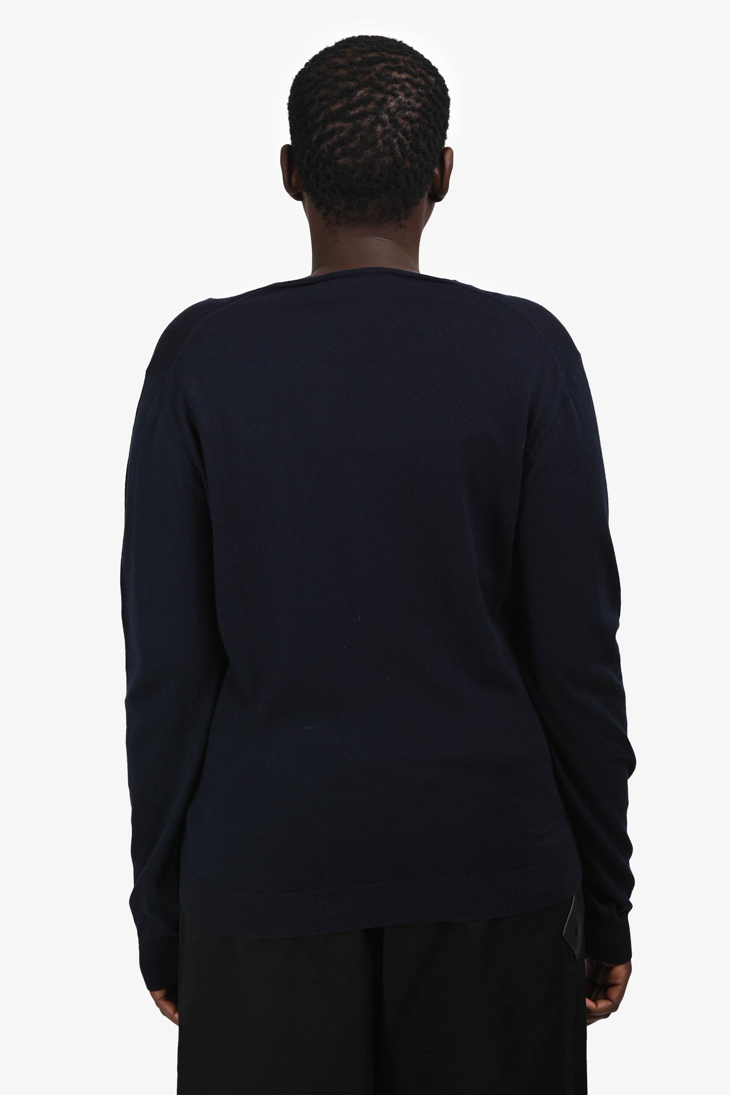 Refresh availabilityPrada Navy Wool Knit V-Neck Sweater. Pull-on. Ribbed neckline, cuffs, and hem. Tonal stitching.