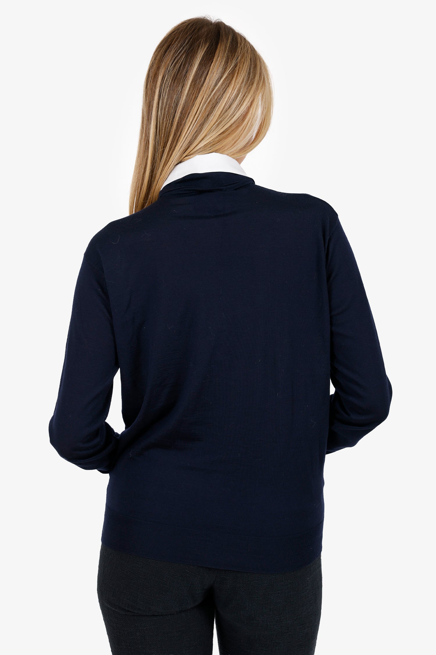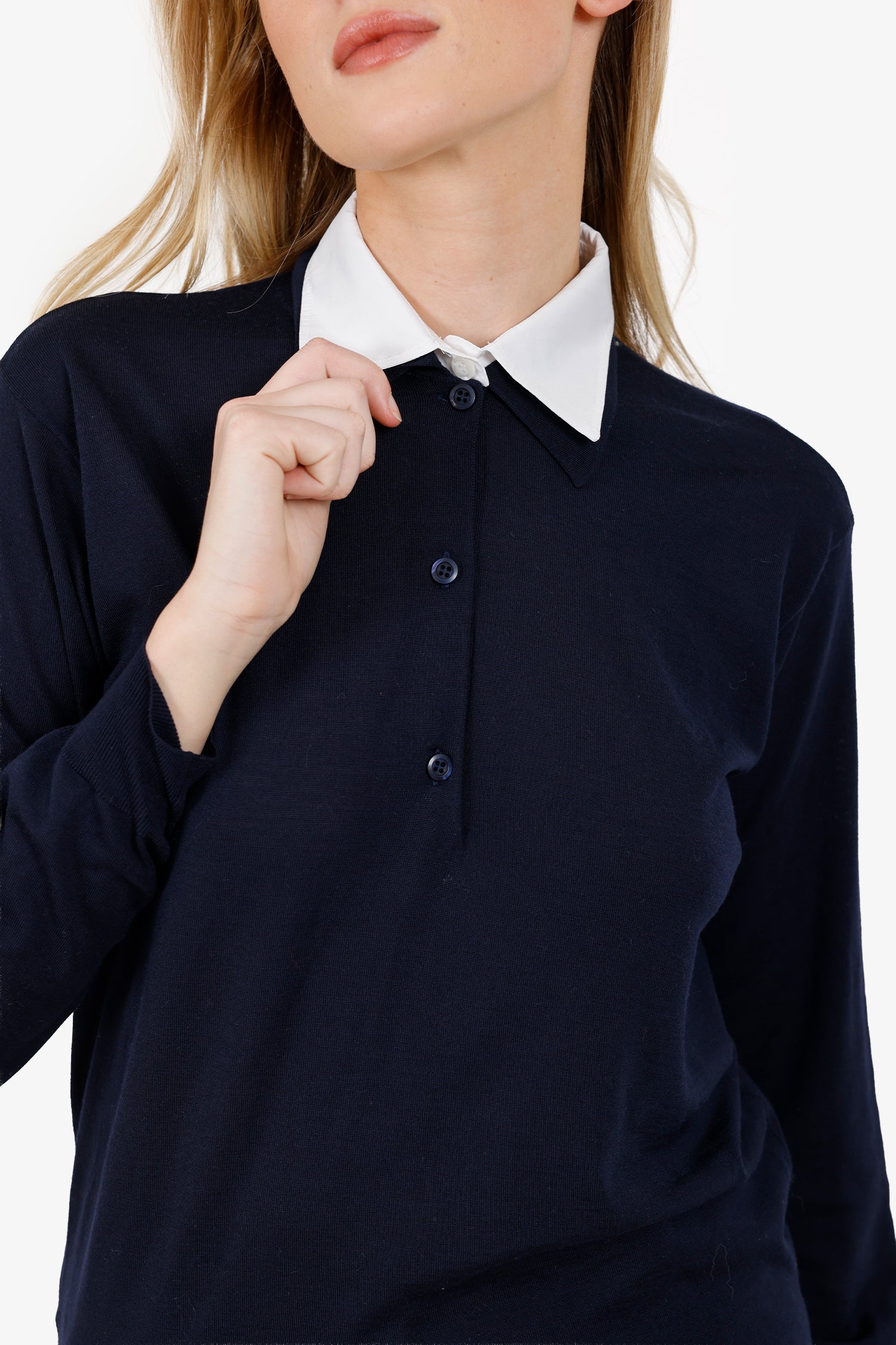 Refresh availabilityPrada Navy Wool Long Sleeve Polo. Pull-on. Removable collared-neckline. Front button-up closure. Tonal stitching.