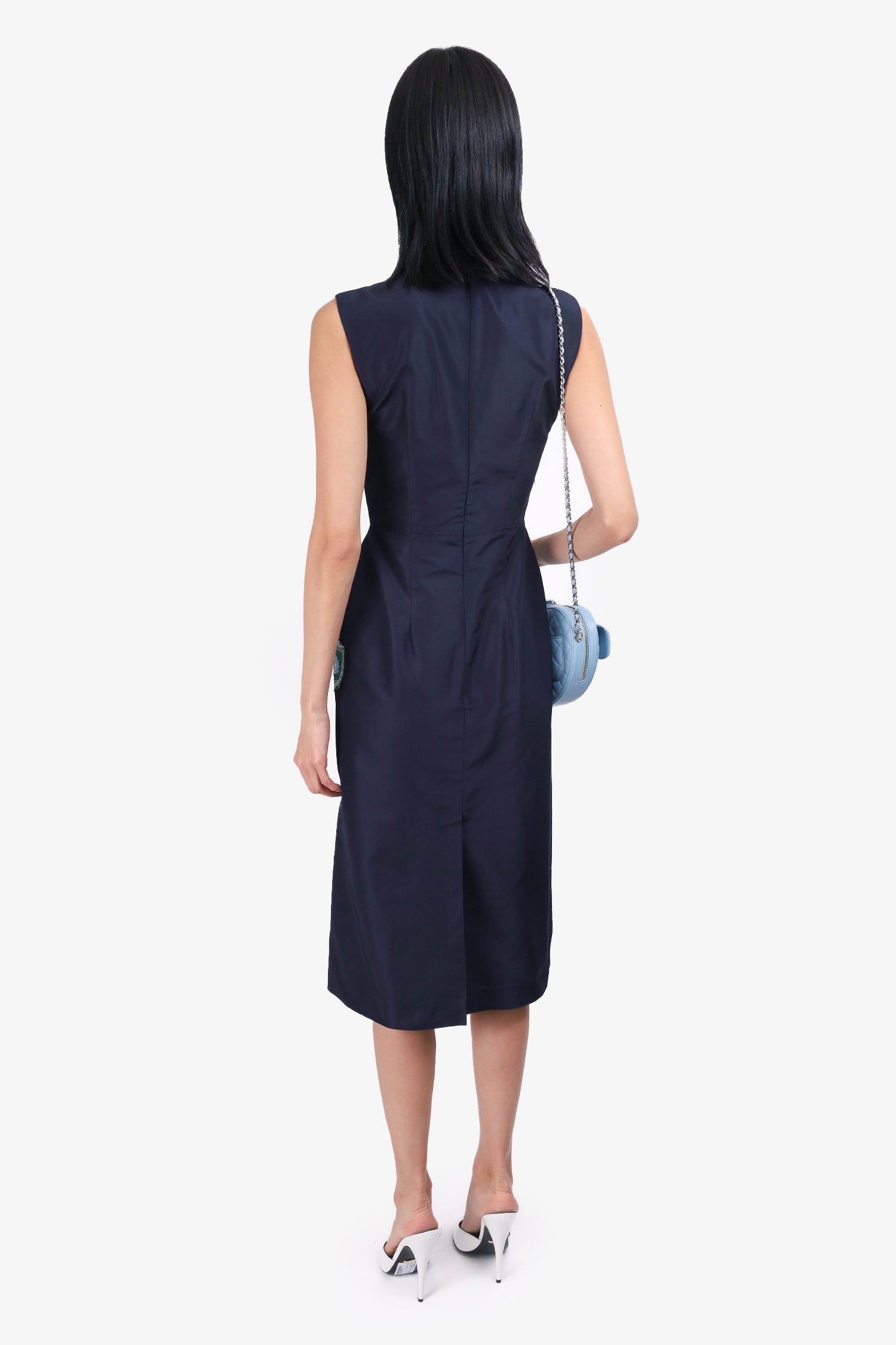 Refresh availabilityPrada Navy Woven Floral Shift Dress. Rear zip closure. Sleeve-less. Round neckline. Contrast and tonal stitching.