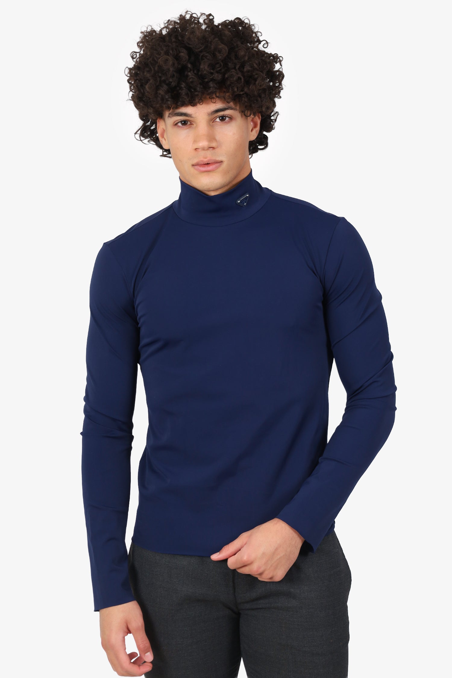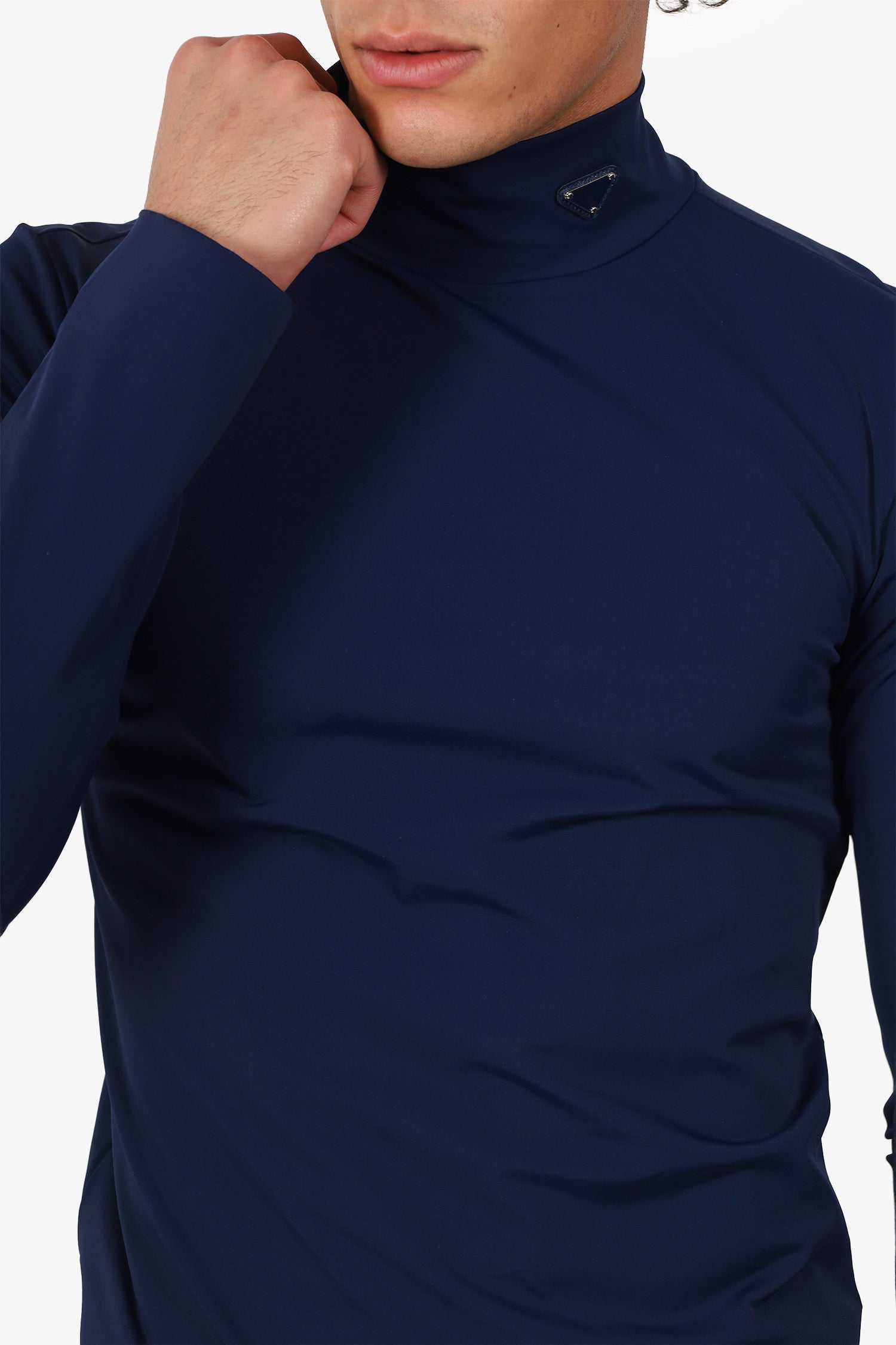 Refresh availabilityPrada Navy Technical Jersey Triangle Logo Turtleneck Sweater. Pull-on. Silver-tone hardware. Tonal stitching.