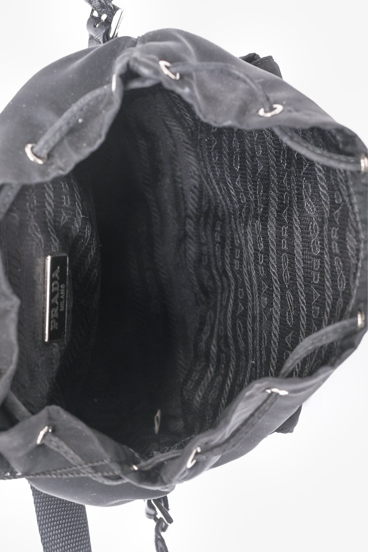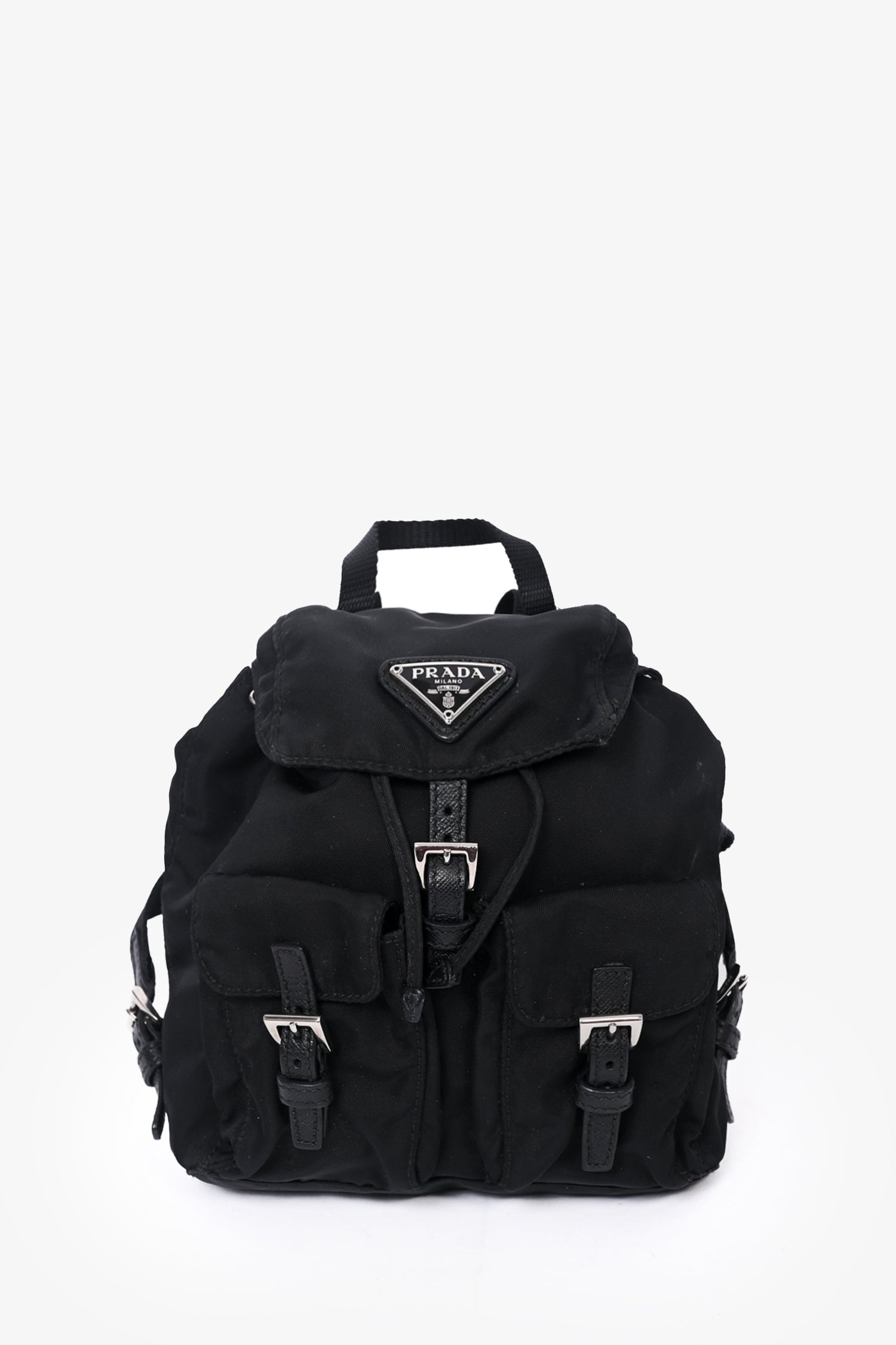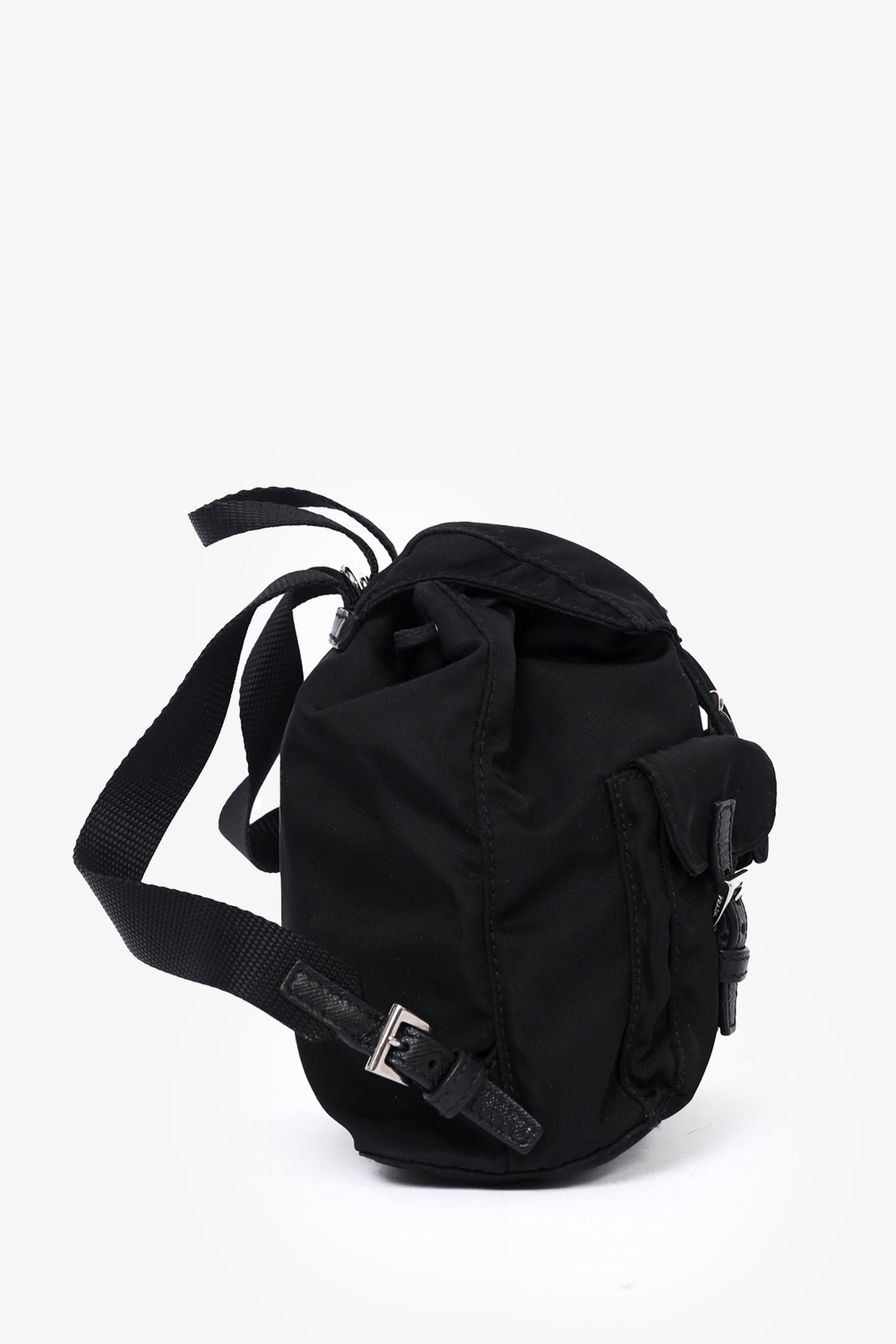 Refresh availabilityPrada Nylon Mini Chain Backpack. Fold over flap with magnetic button closure. Adjustable straps. 2 front pockets with buckle closure. Removable cross-body chain. Silver-tone hardware. Tonal stitching.
