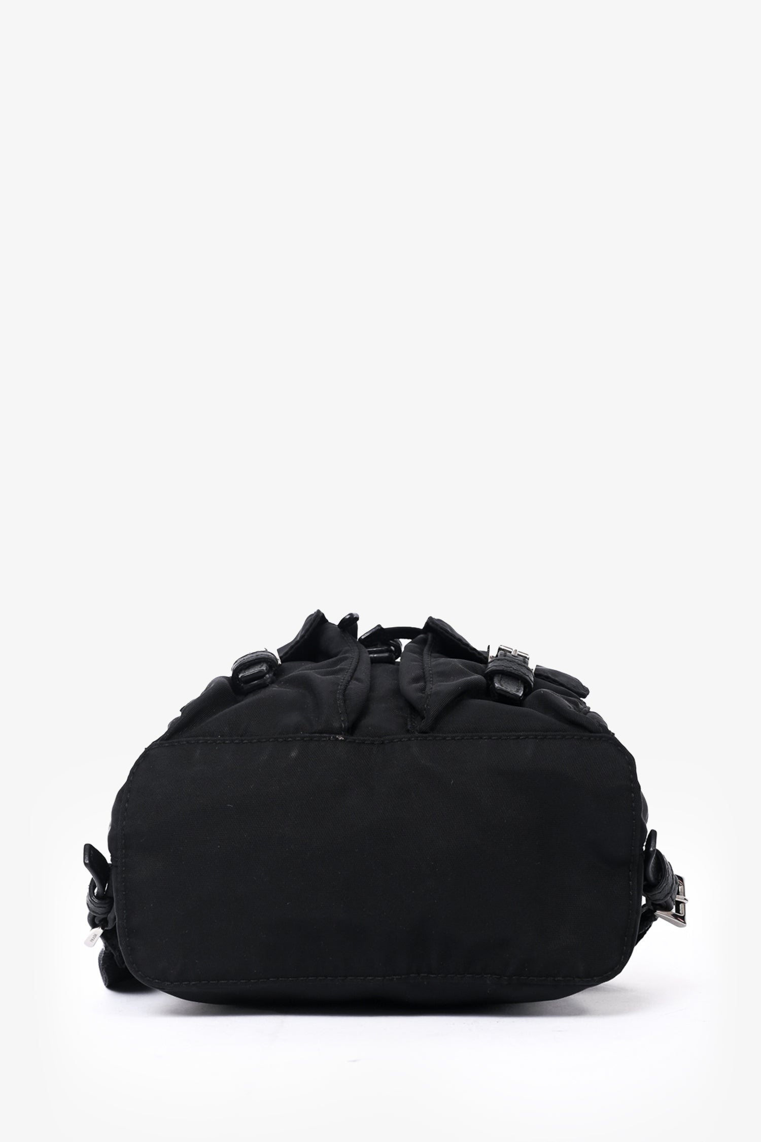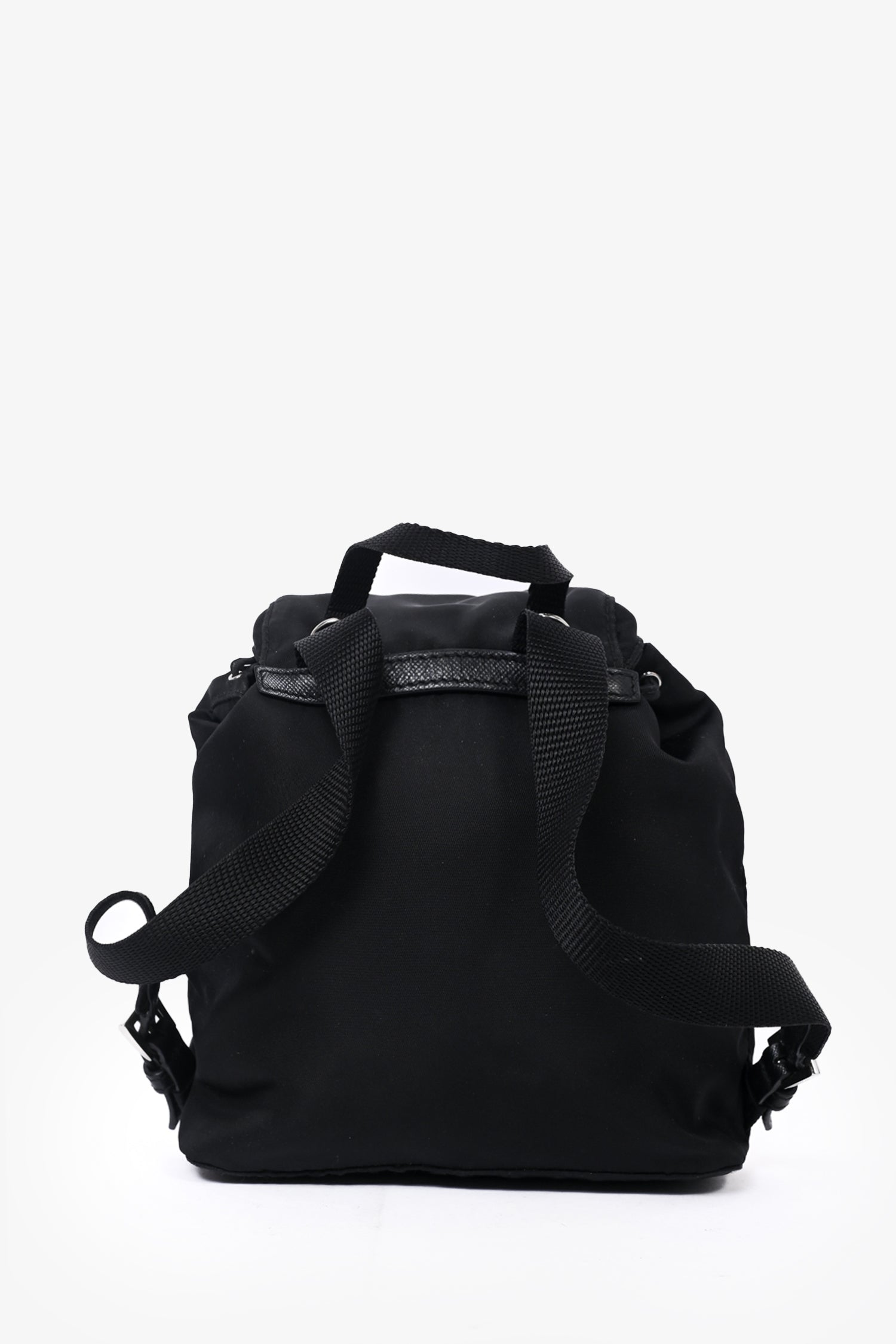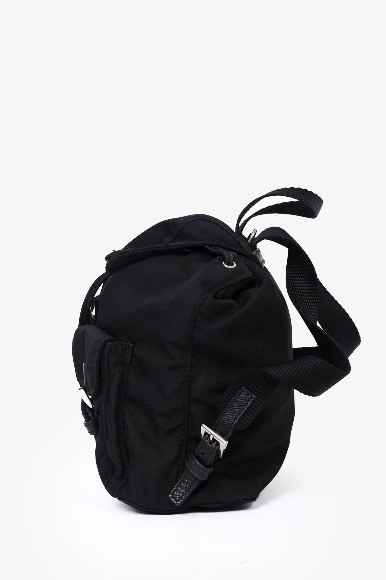 Refresh availabilityPrada Nylon Mini Chain Backpack. Fold over flap with magnetic button closure. Adjustable straps. 2 front pockets with buckle closure. Removable cross-body chain. Silver-tone hardware. Tonal stitching.