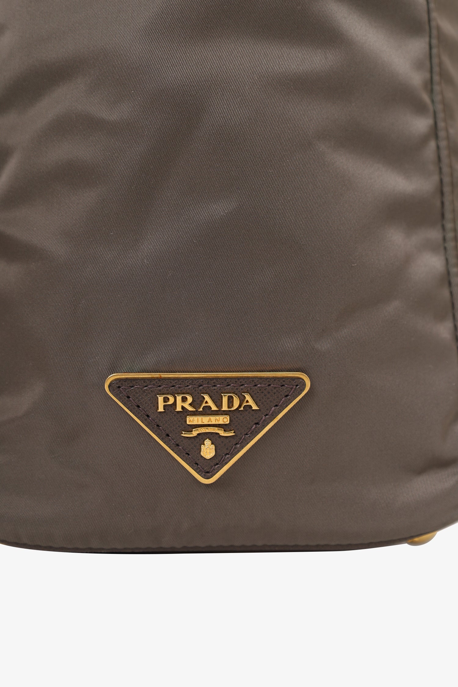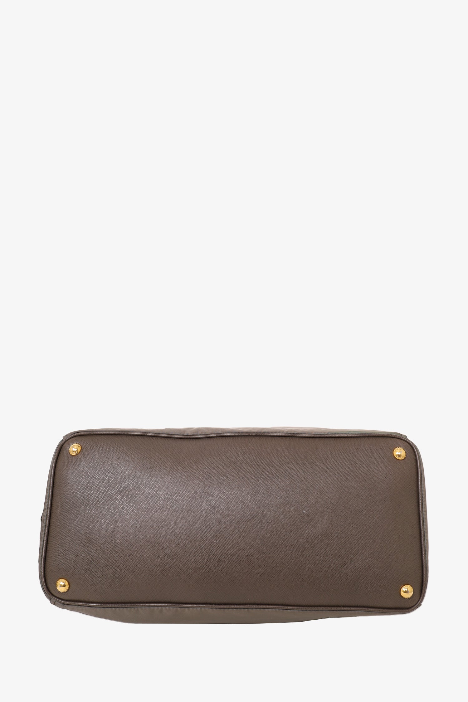 Refresh availabilityPrada Olive Nylon Tote Bag. Twin Handles. 2 exterior zipper pockets. Top zipper pocket. Interior zipper pocket. Interior button closure pocket. Leather bottom with protective studs. Tonal stitching.