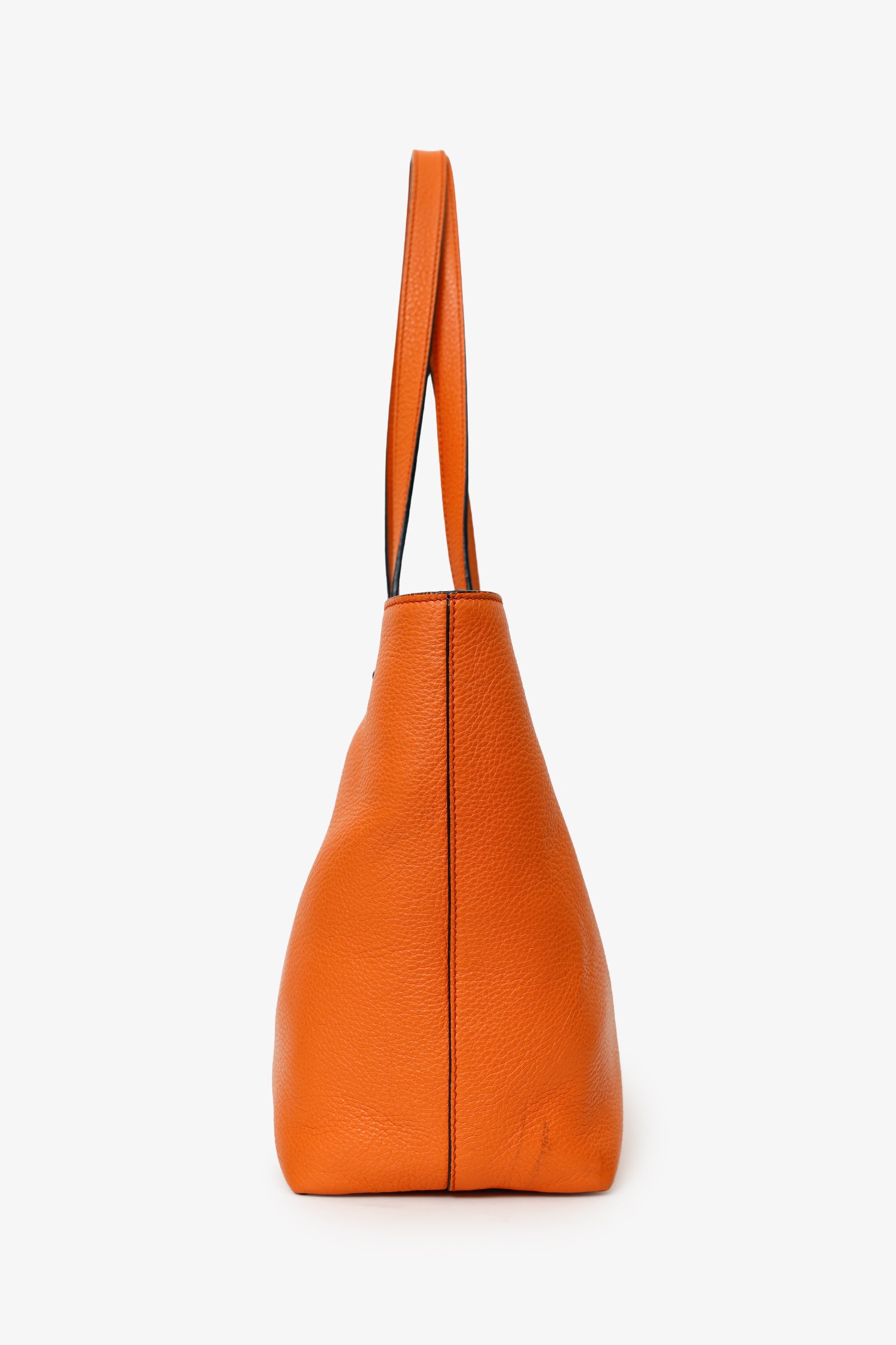Refresh availabilityPrada Orange Leather Vitello Daino Tote Bag. Interior magnetic closure. Twin shoulder straps. Lined interior with single rear zip-up pocket. Removable bag tag. Gold-tone hardware. Tonal stitching.
