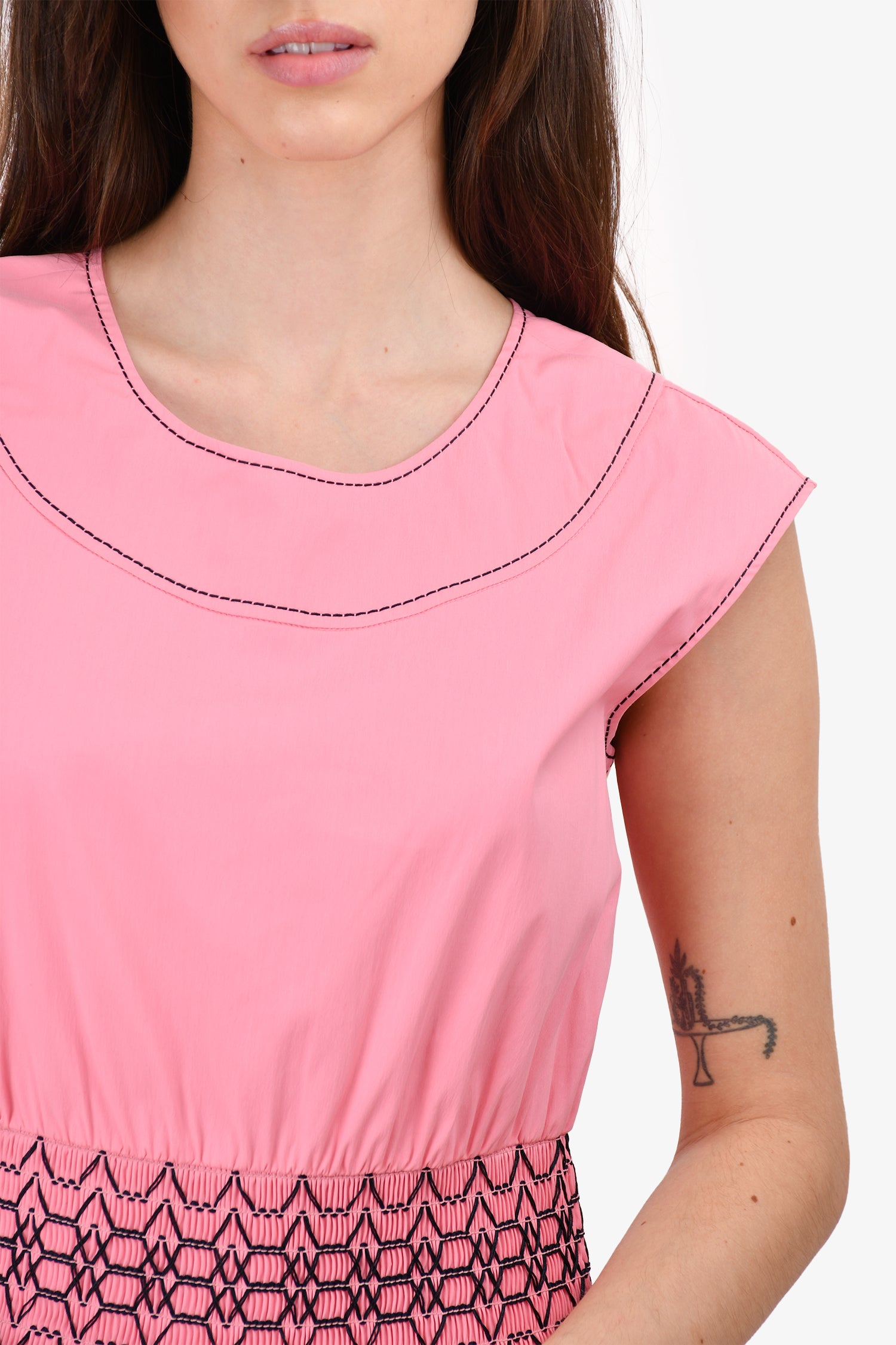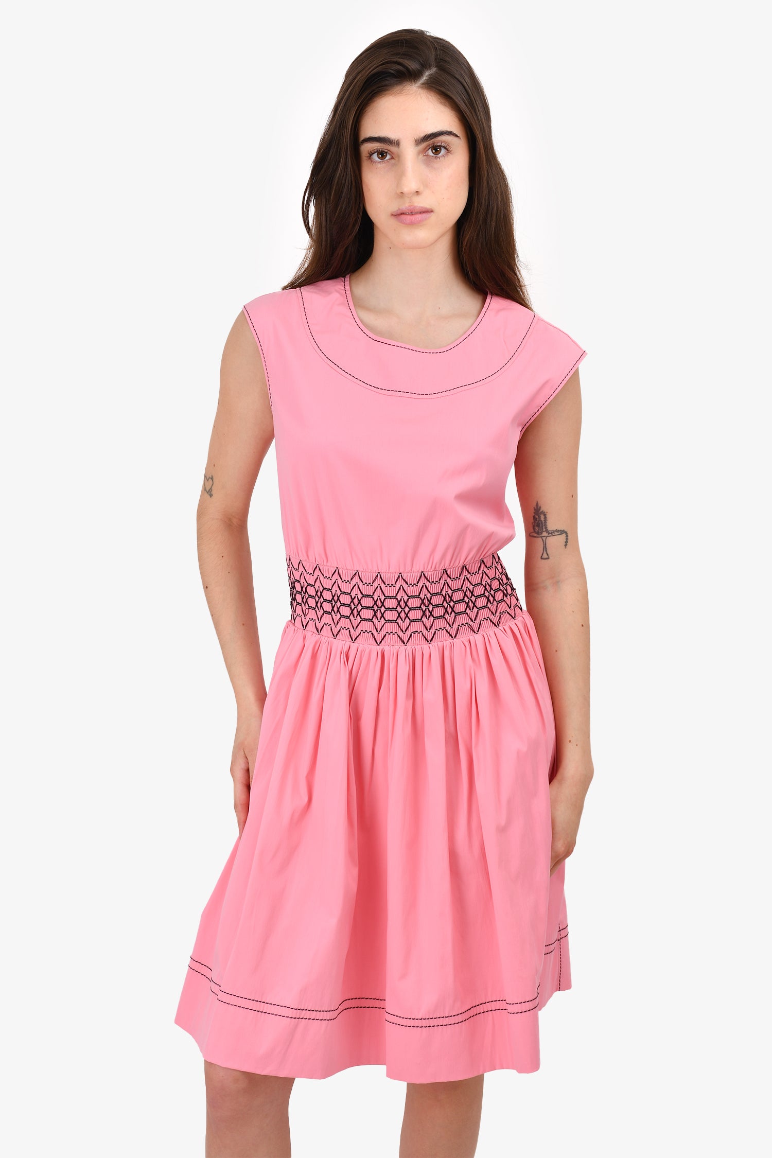 Refresh availabilityPrada Pink Embroidered Smocked Sleeveless Dress. Round neck. Rear zip and hook closure. Elasticized waist. Lined.