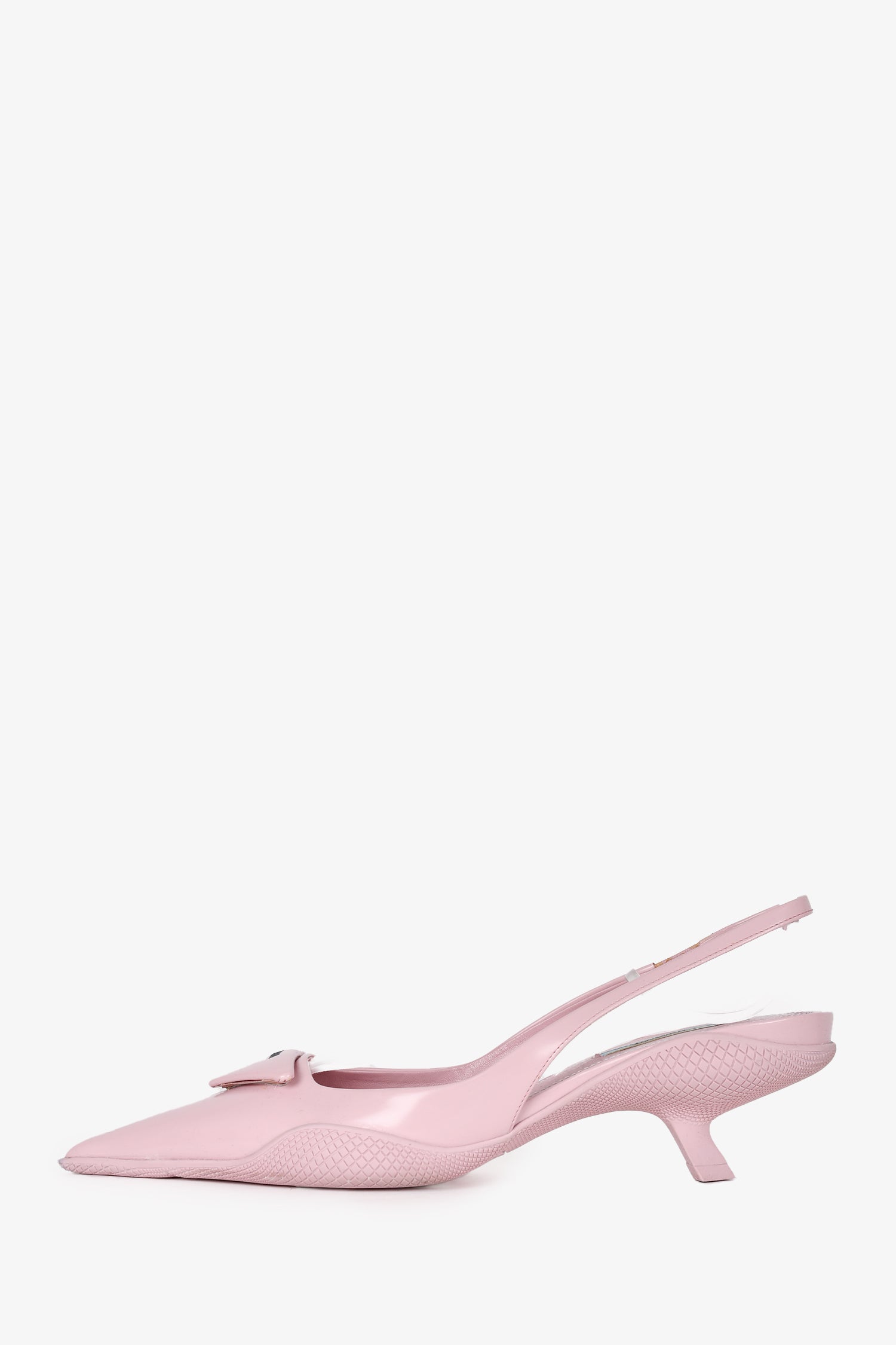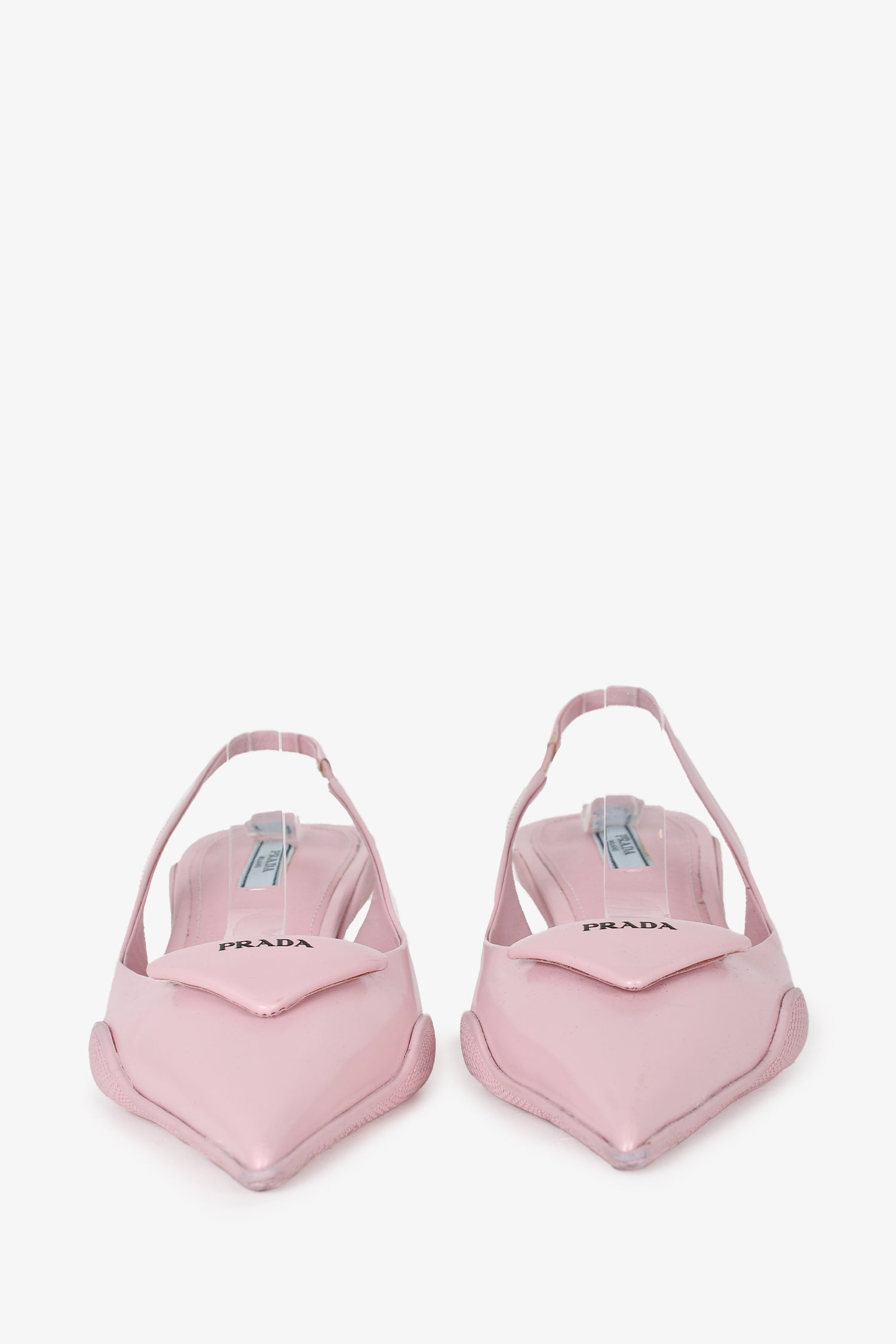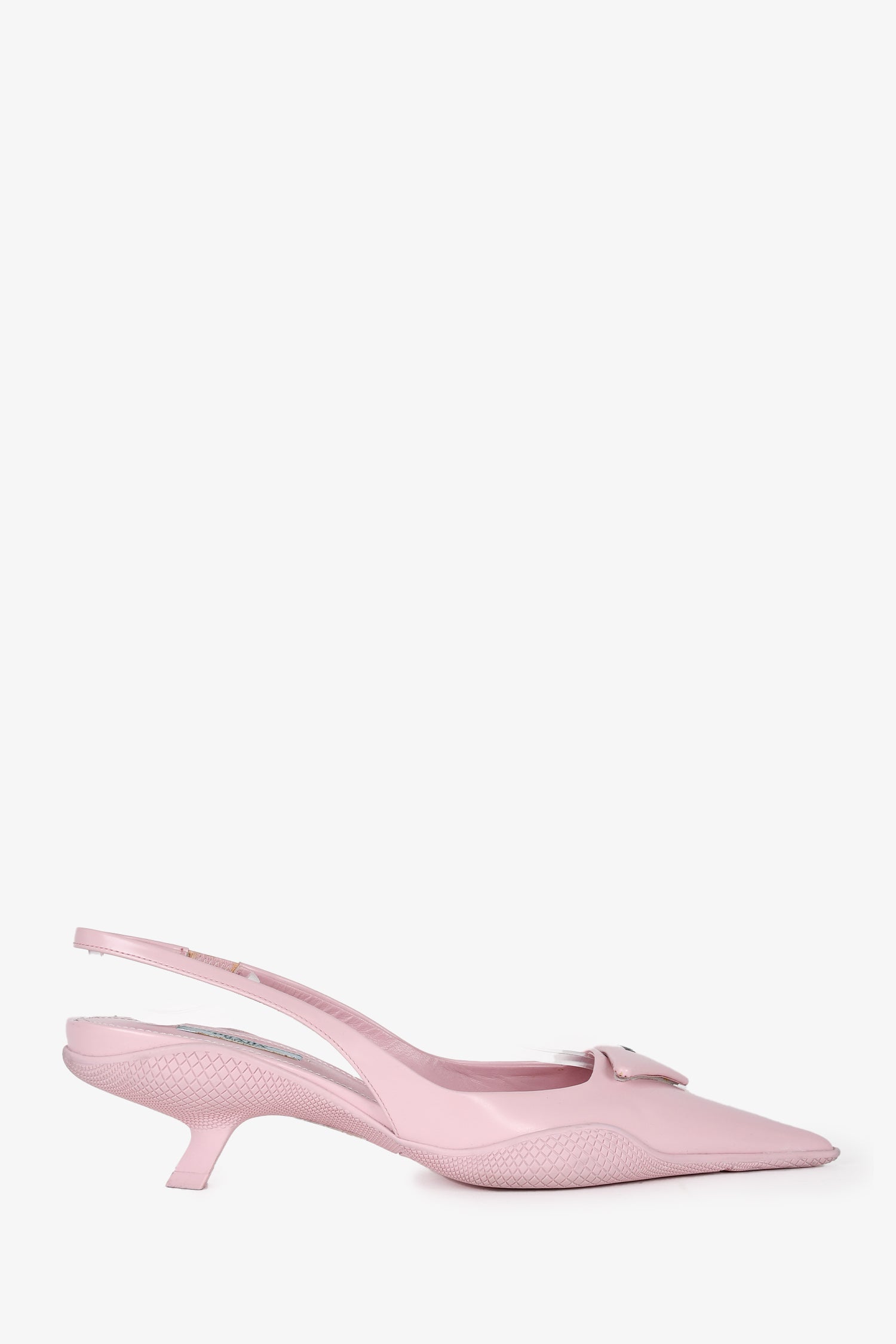Refresh availabilityPrada Pink Leather Pointed Toe Slingback Kitten Heels. Slip-on. Tonal leather emblem detail with brand logo at the upper. Tonal stitching.