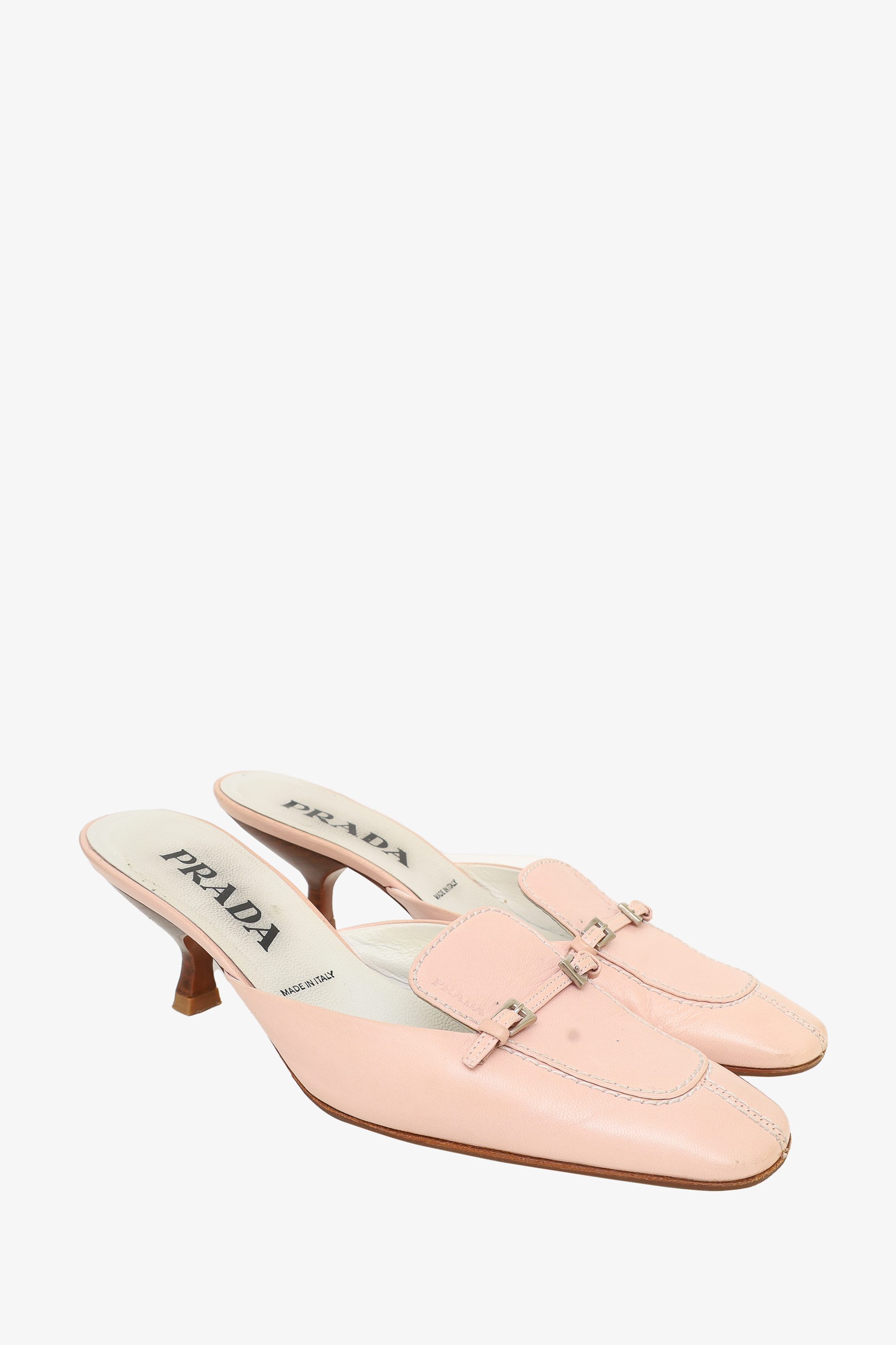 Refresh availabilityPrada Pink Leather Slip-on Kitten Heels with Silver Buckle Detail. Narrow square toe. Silver-toned hardware. Faux wood kitten heel. Buckle detailing on toe. Contrast stitching.