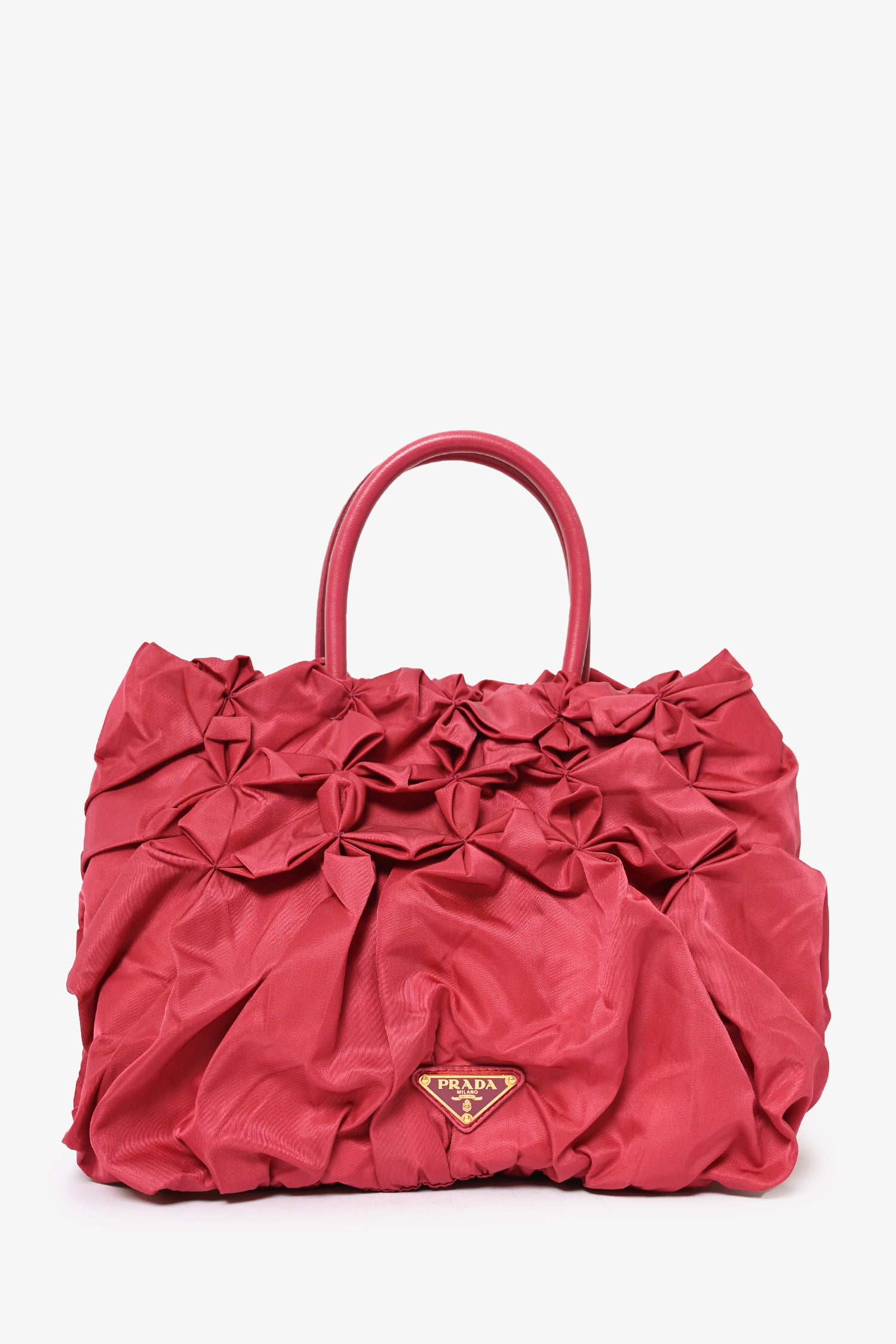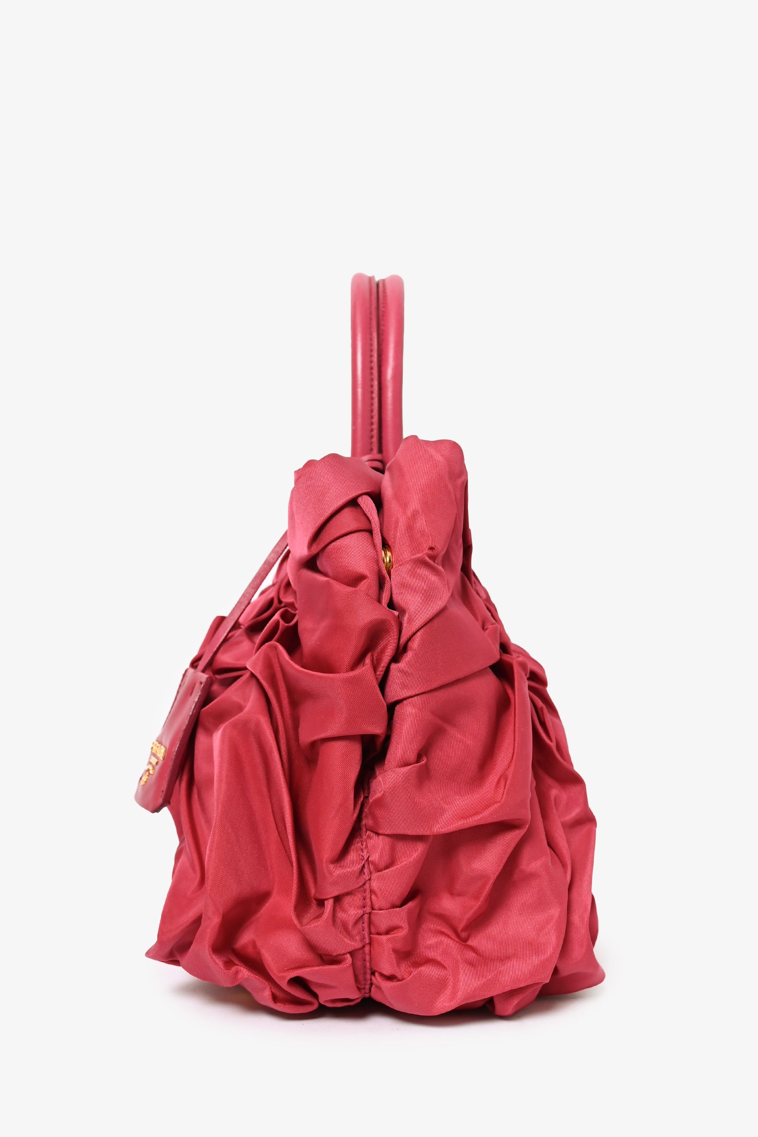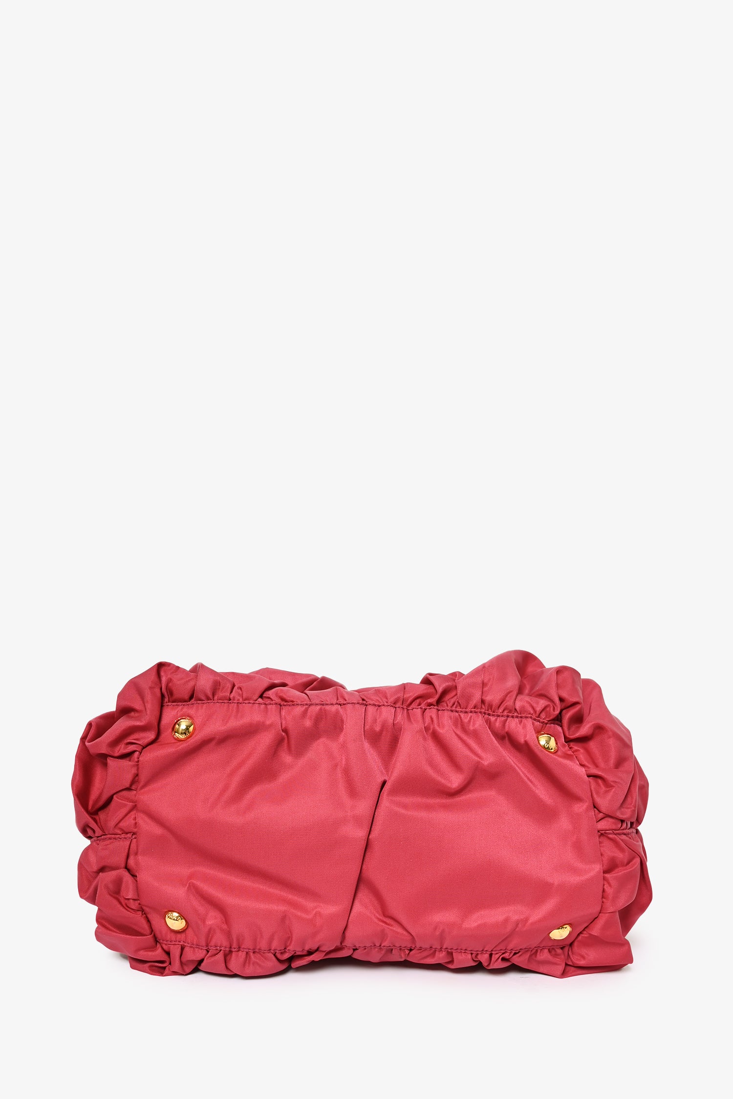 Prada Pink Nylon Ruched Top Handle. Tessuto detailing. Dual rolled top handles. Snap closures at sides. Bag feet at base. Tonal stitching. Snap closure at top. Lined interior with 'PRADA' logo throughout. Dual zippered interior compartments. Attached clochette.