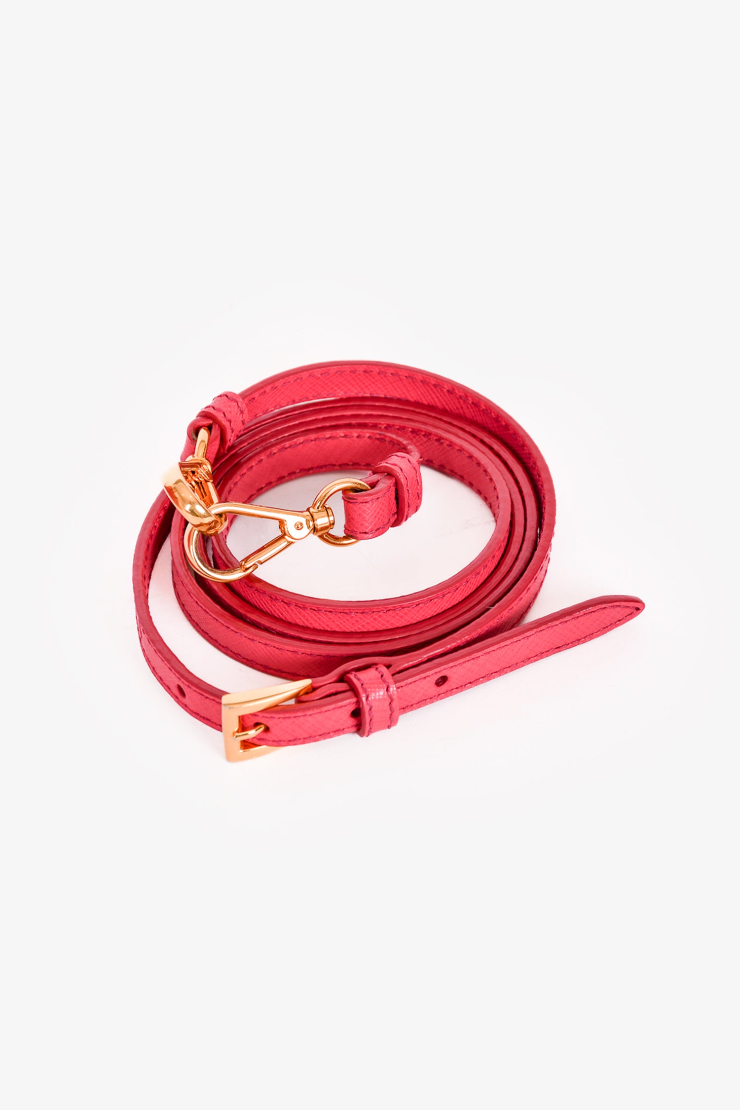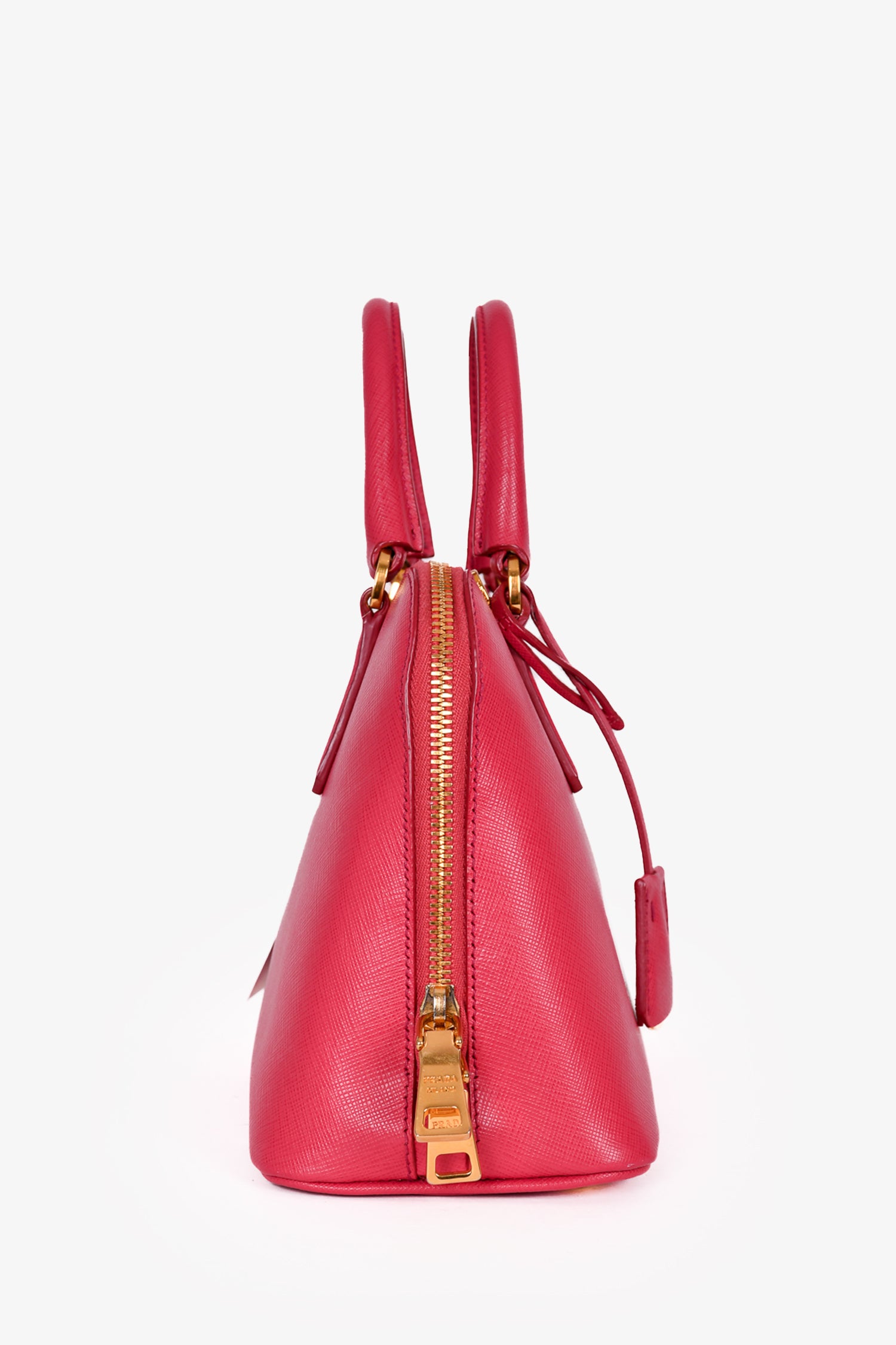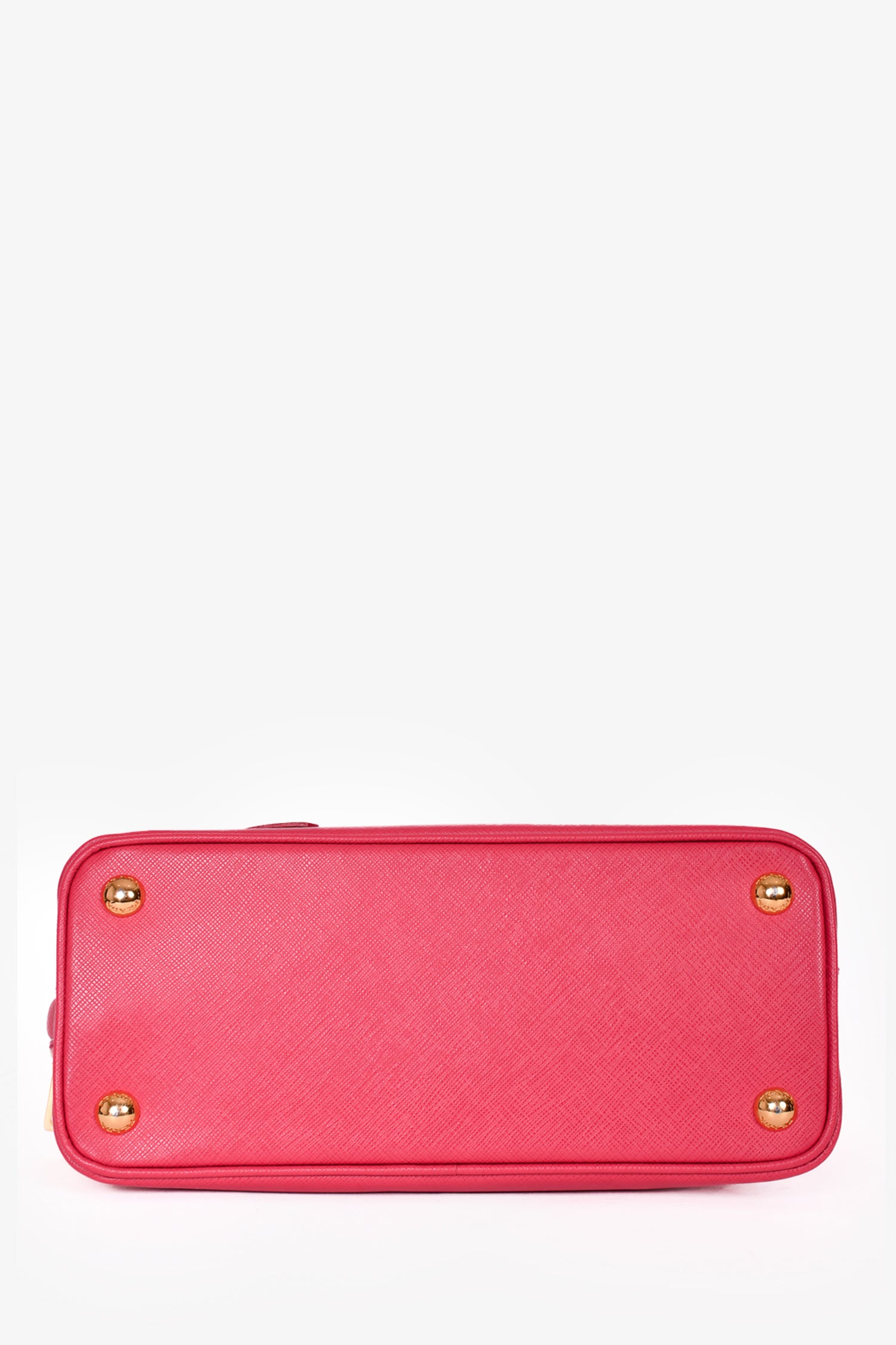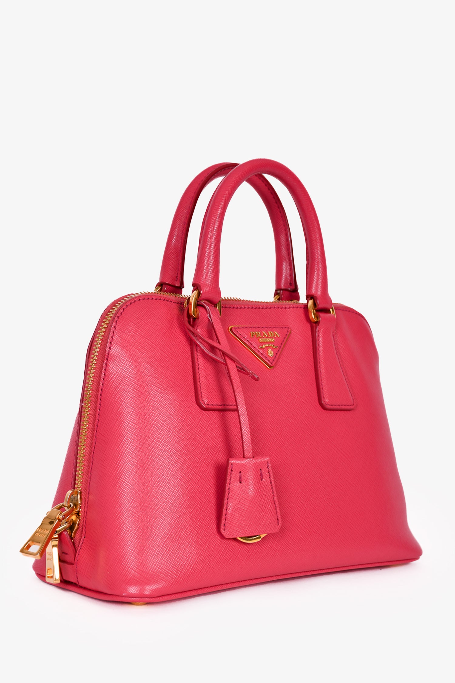 Prada Pink Saffiano Leather Promenade Top Handle with Strap. Dual rolled handles. Top two-way zip closure. Tonal logo'd textile interior lining. 3 interior compartments; 2 open and 1 with zip closure. 2 interior wall pockets; 1 slip and 1 with zip closure. Detachable clochette. Detachable and adjustable strap. Protective metal bottom. Gold-tone hardware. Tonal stitching.